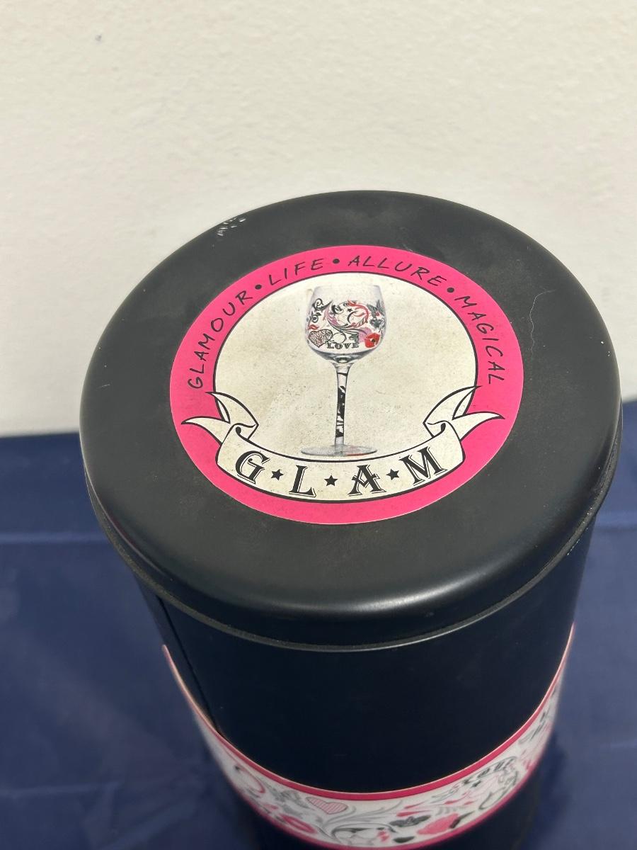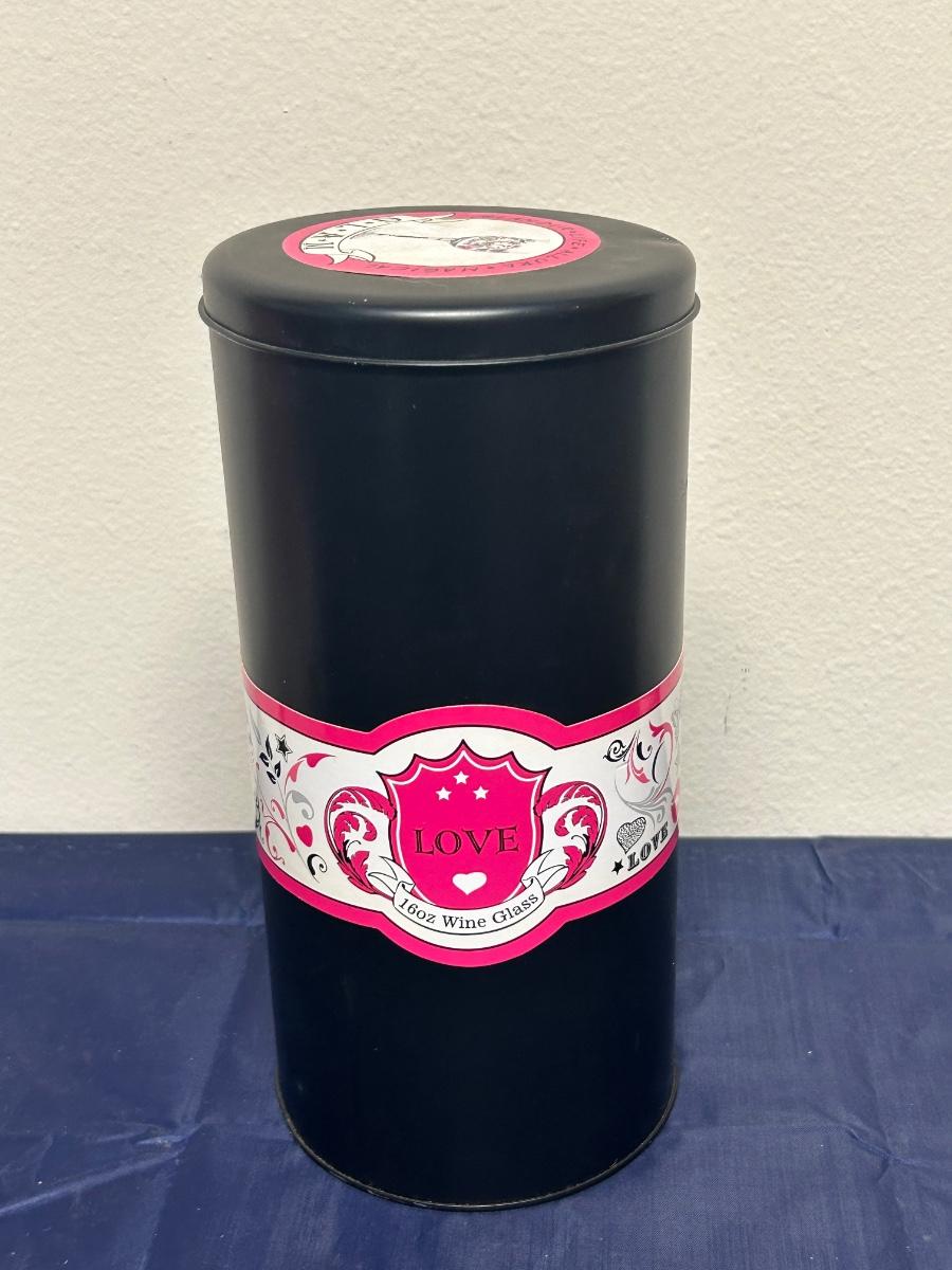 GLAM Patterned Wine Glass with Metal Tin Box. Some of the pattern has worn off. Good tin.
