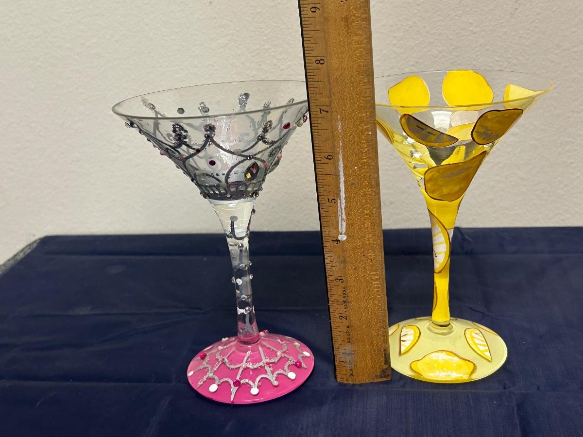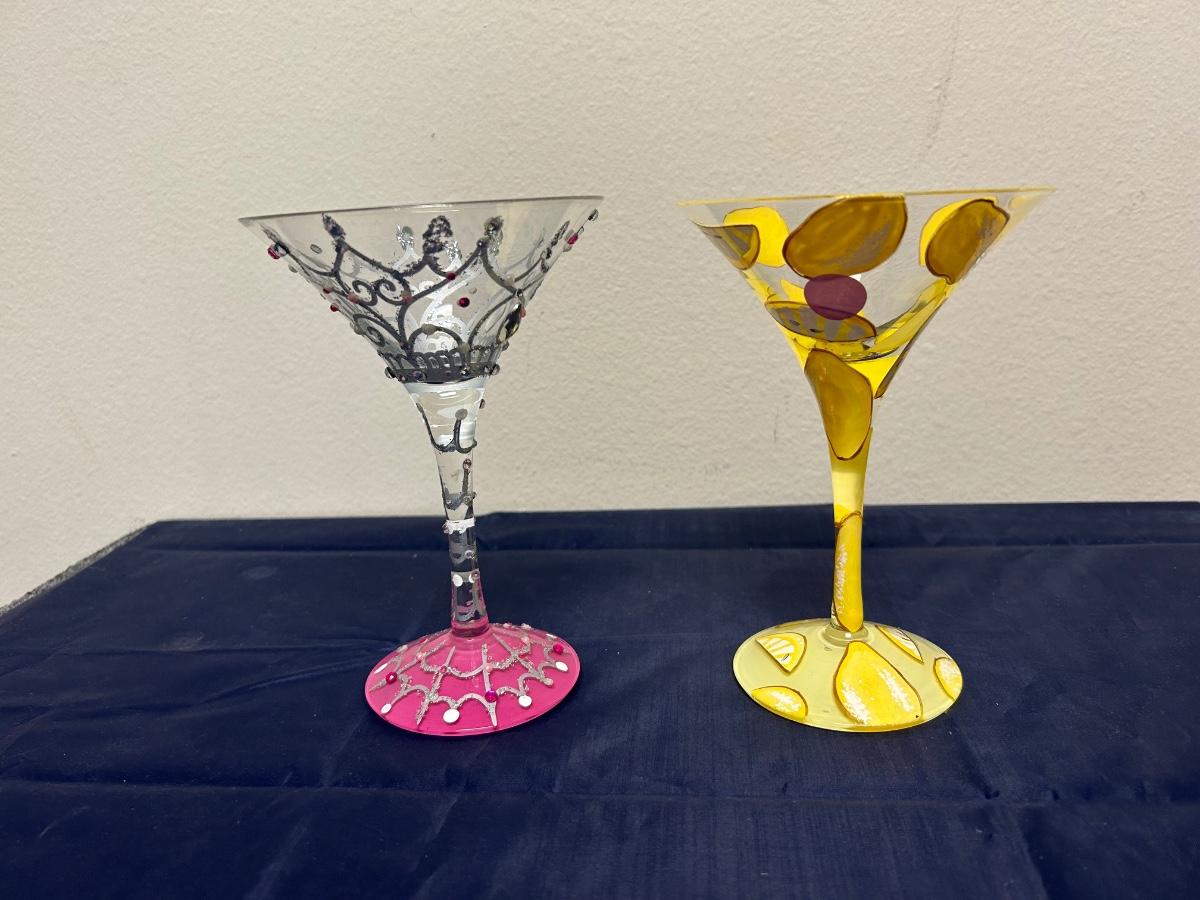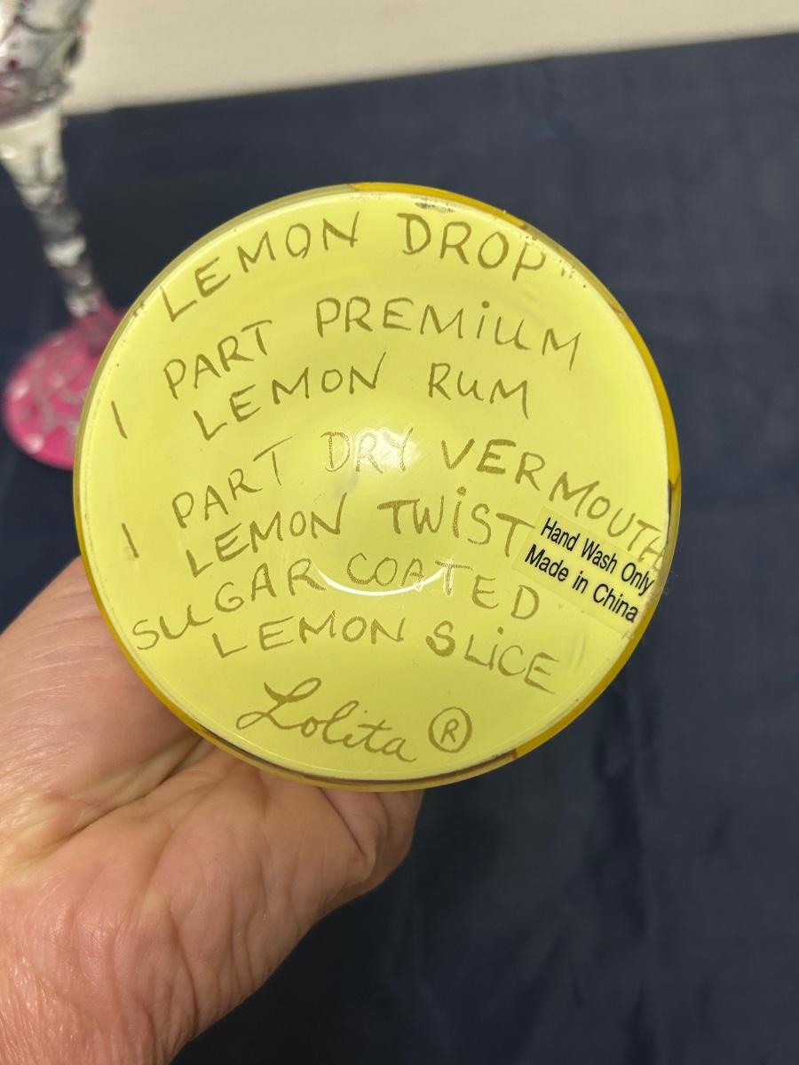 Pair of Lolita Martini Drink Glasses Stemware Recipes on the Bottom. In previously used condition, light wear to design. No boxes.