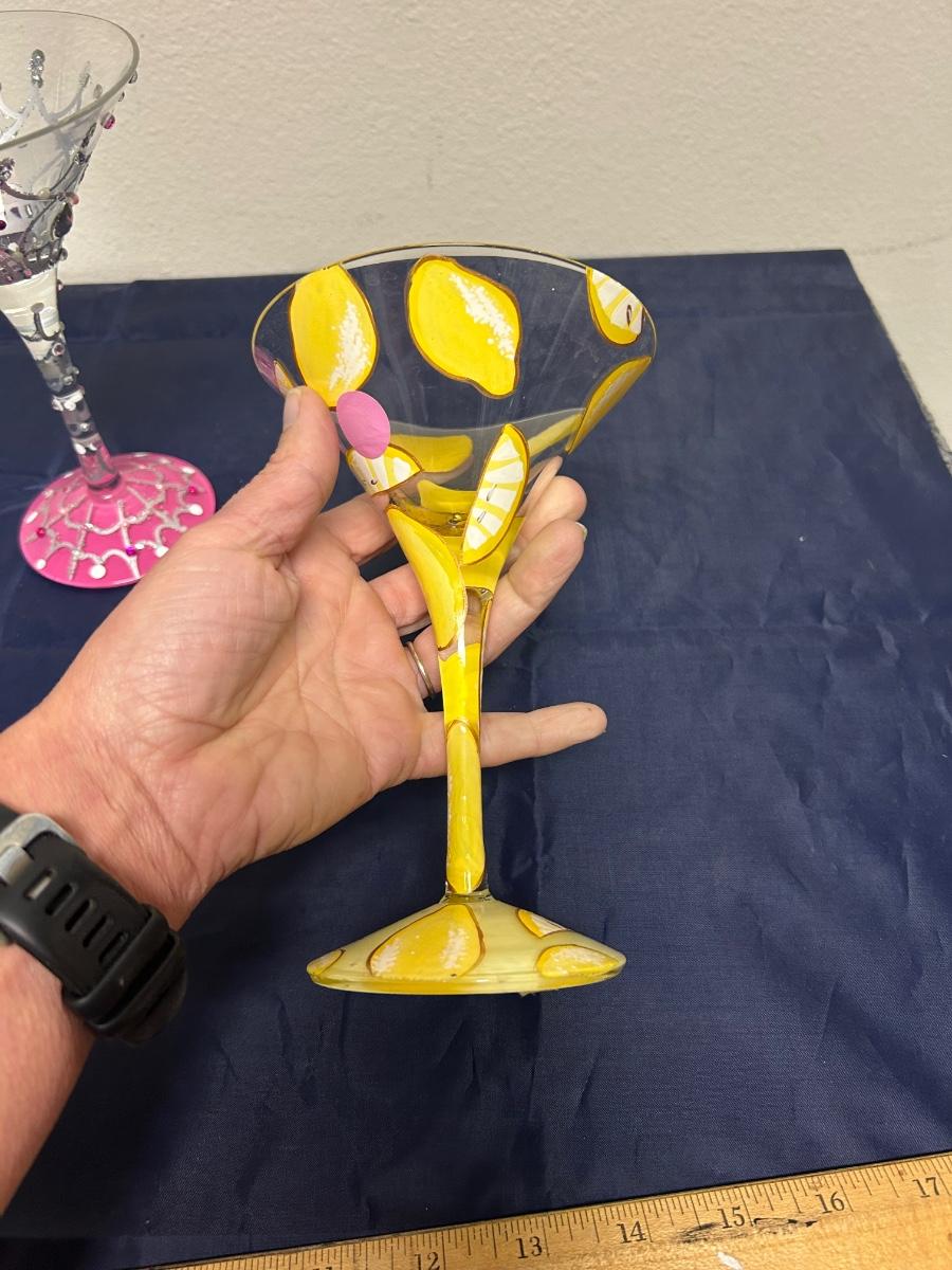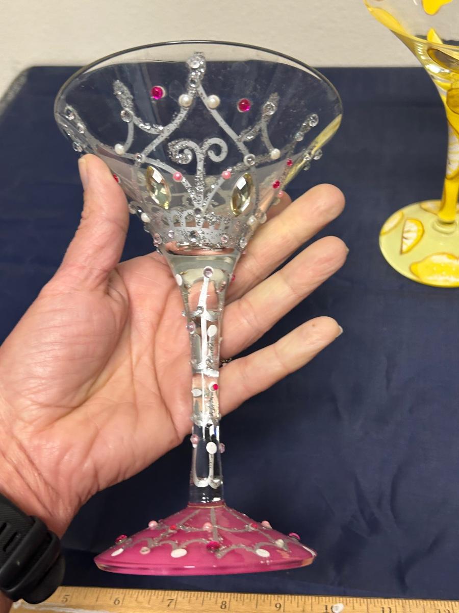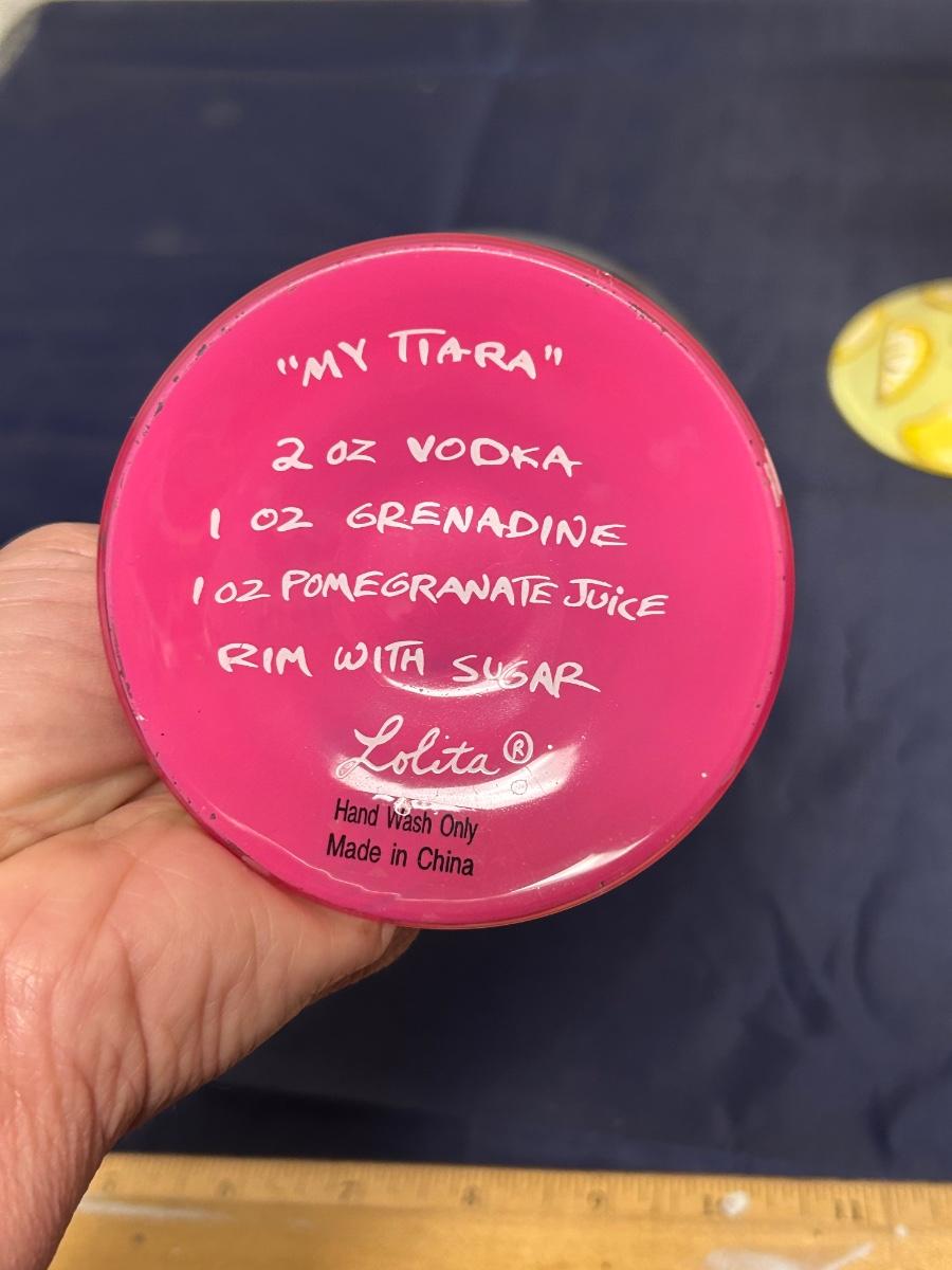 Pair of Lolita Martini Drink Glasses Stemware Recipes on the Bottom. In previously used condition, light wear to design. No boxes.