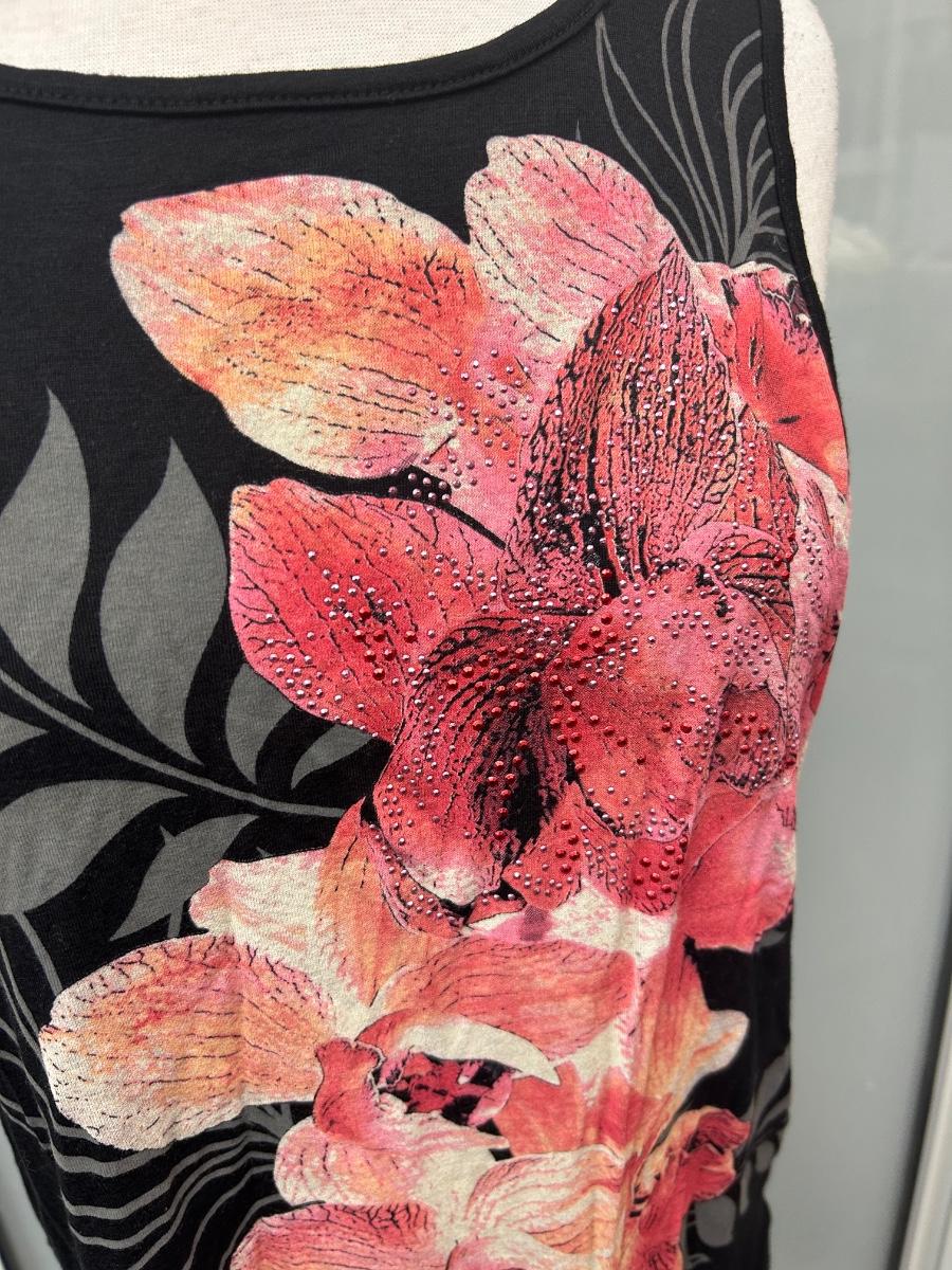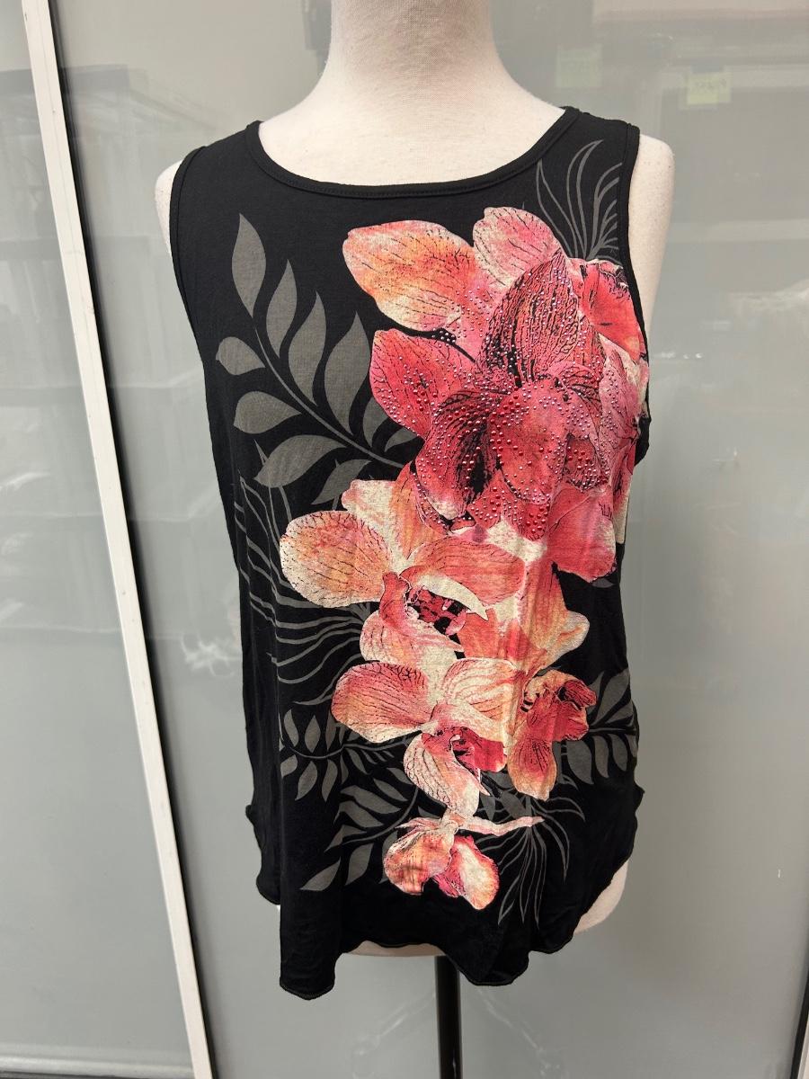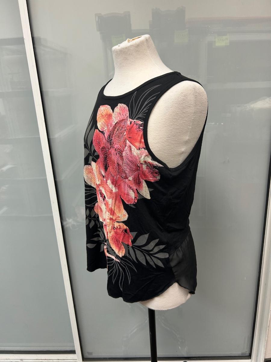 B.L.E.U. Black with Pink Flower Pattern Tank Top Sleeveless Tunic Medium