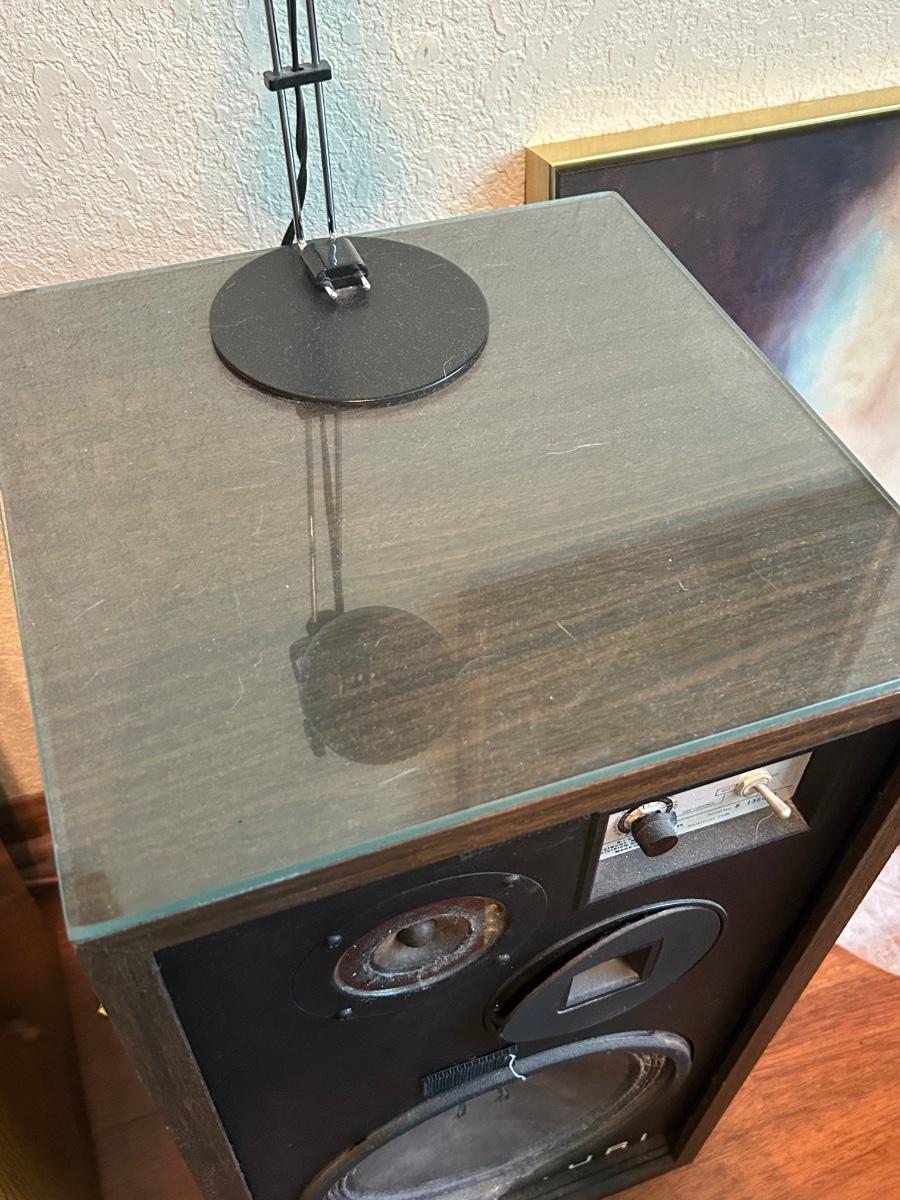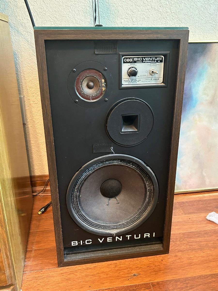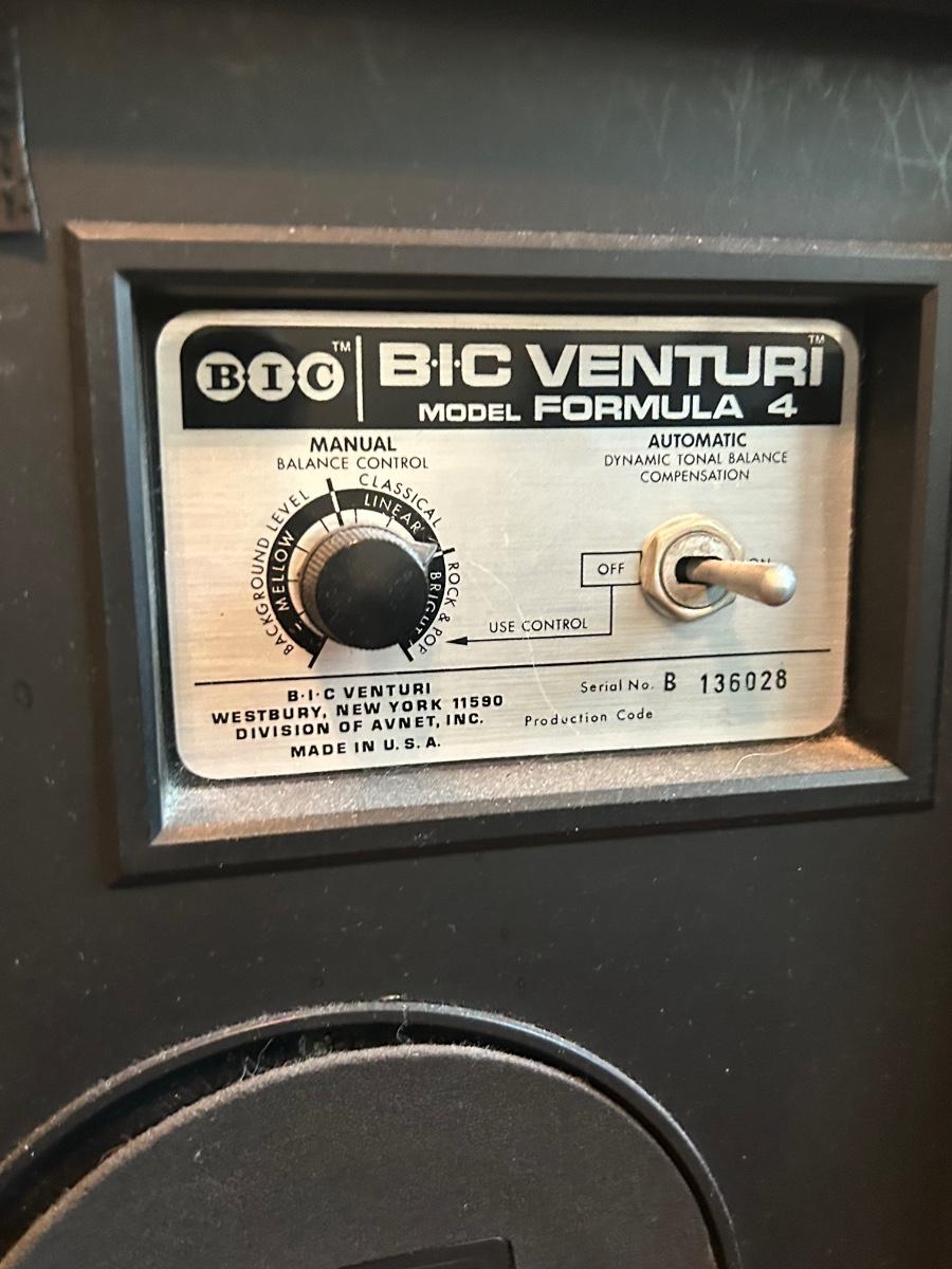 Pair of Vintage BIC Venturi Formula 4 Floor Speakers. Work. Have glass surface protectors sitting on top. No front covers.
