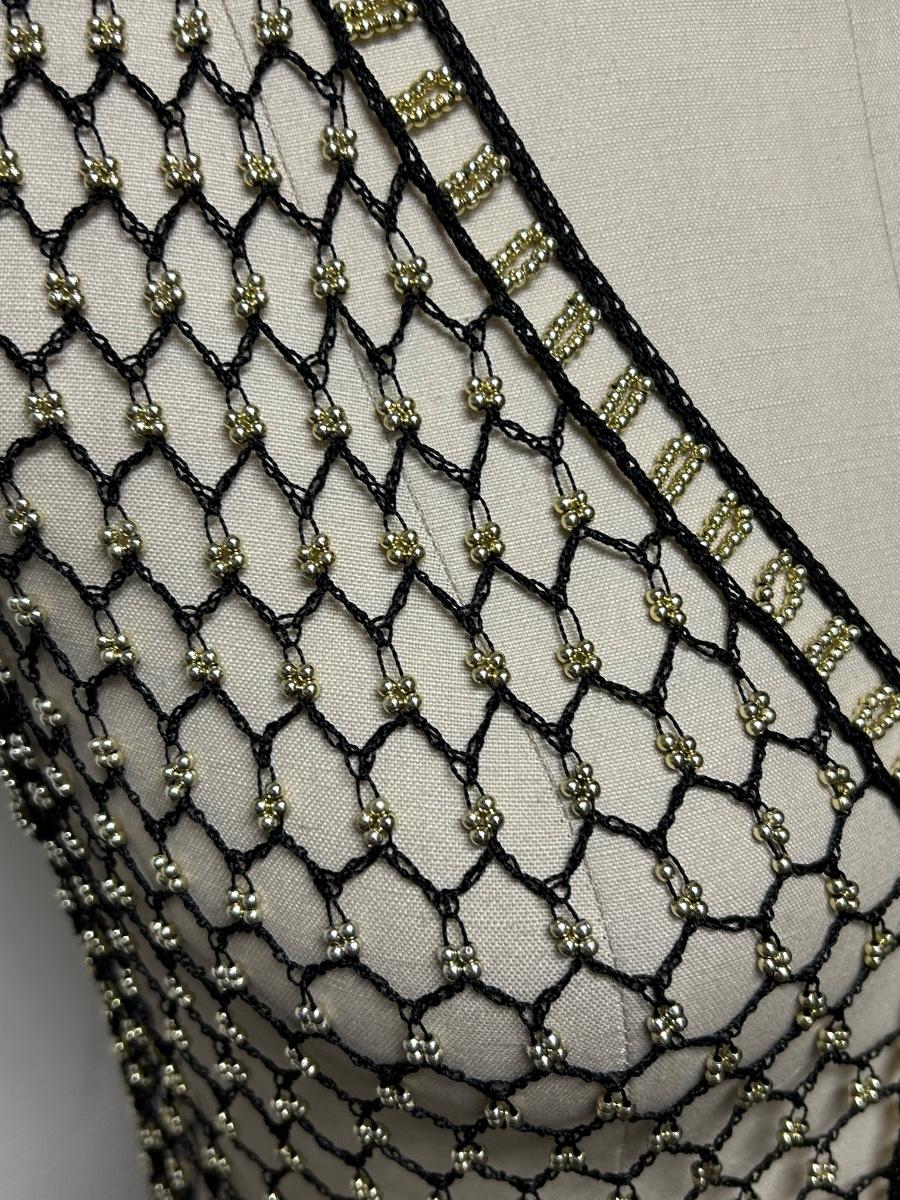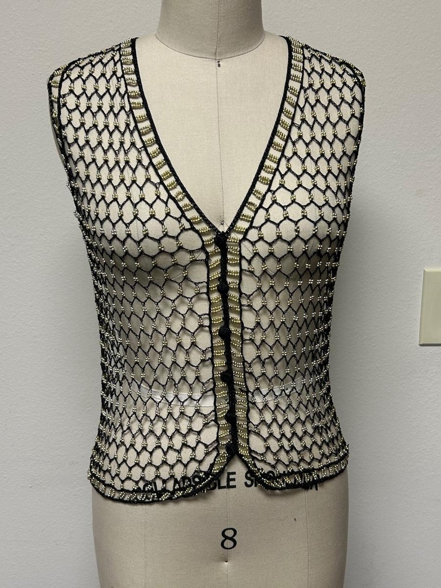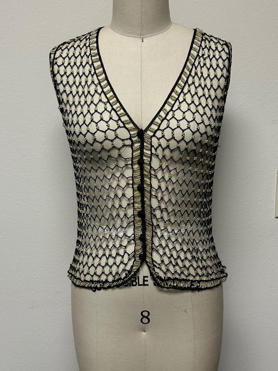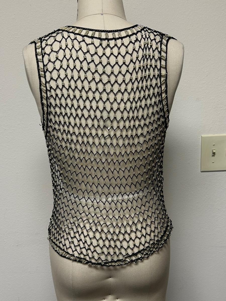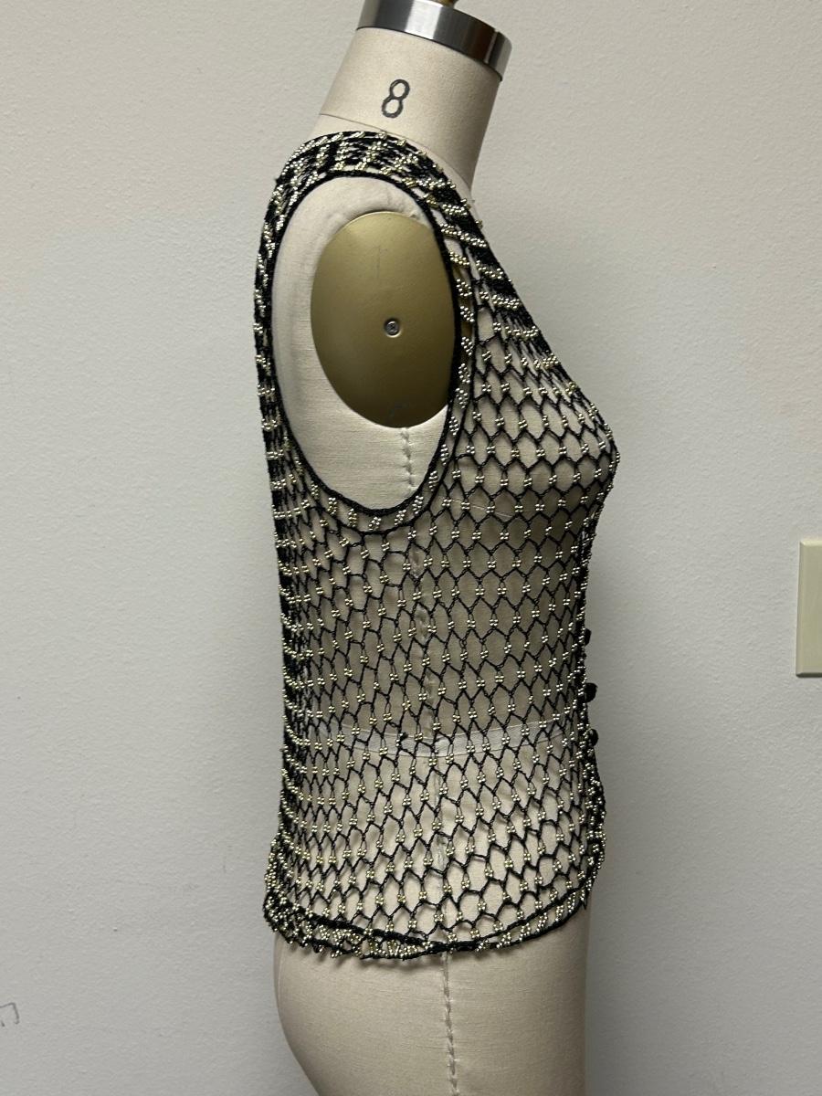 Black and Gold Beaded Mesh Sleeveless Tank. In good condition. Has buttons in the front but they are for looks. No size, based on mannequin it is a medium.