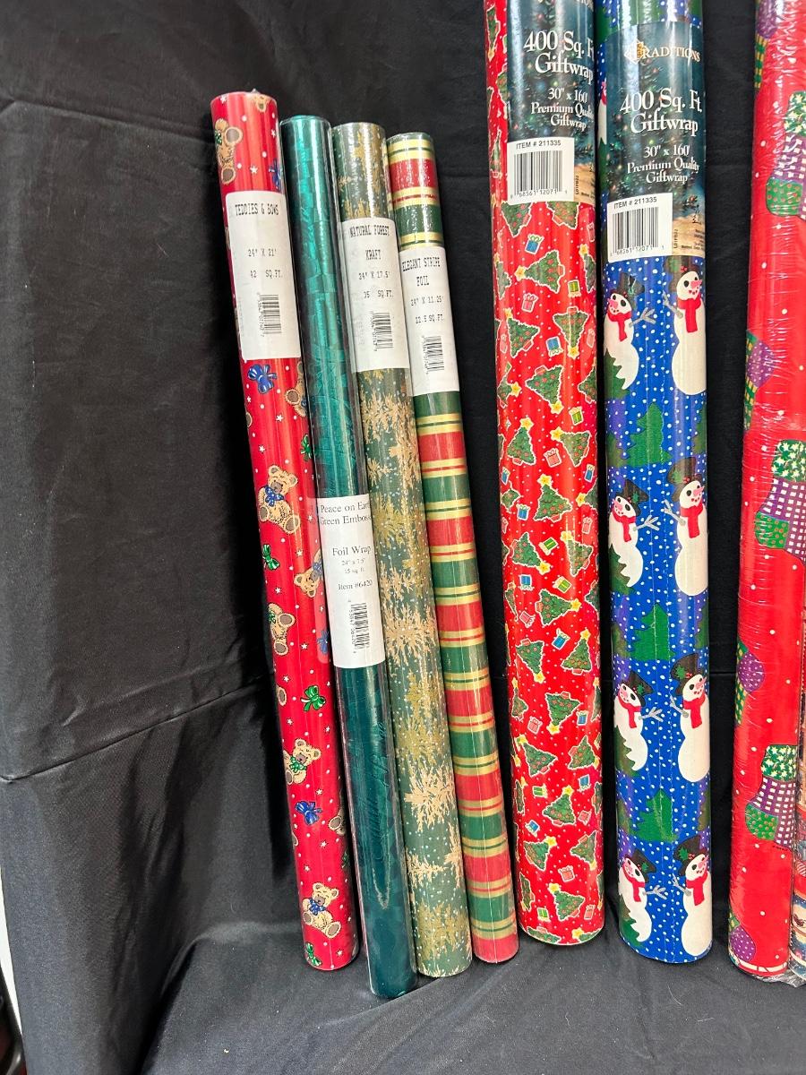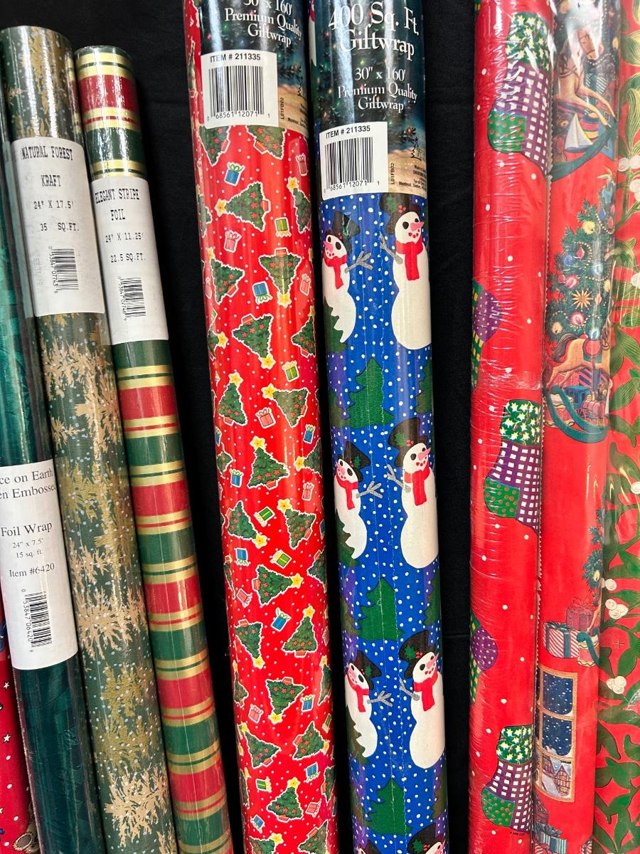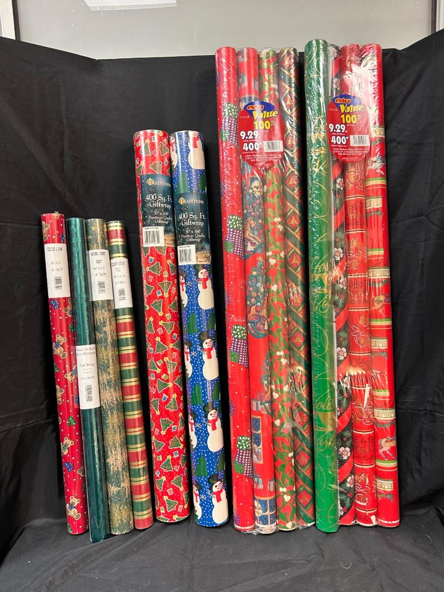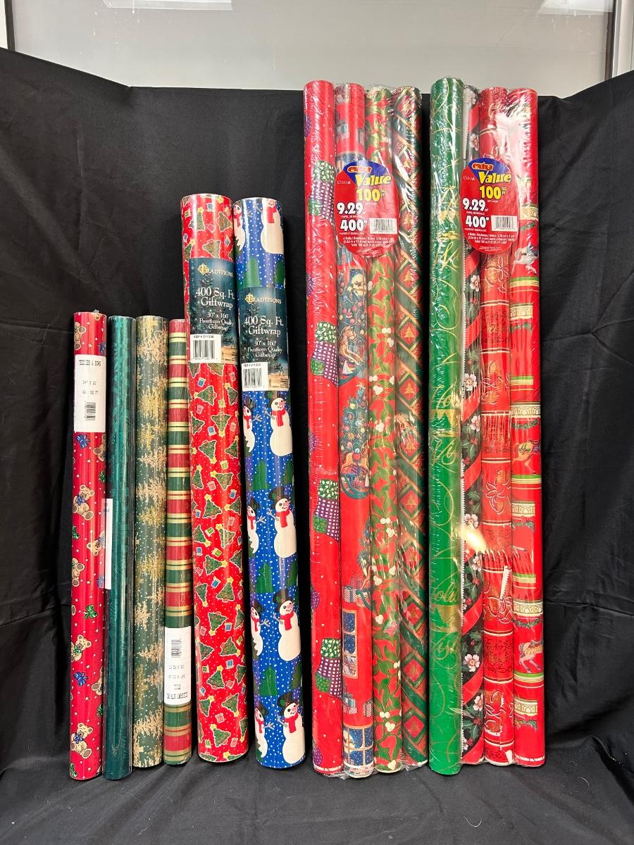 Mixed Lot of New Unopened Christmas Holiday Present Gift Wrapping Paper. 14 rolls with different designs, all unopened in plastic.