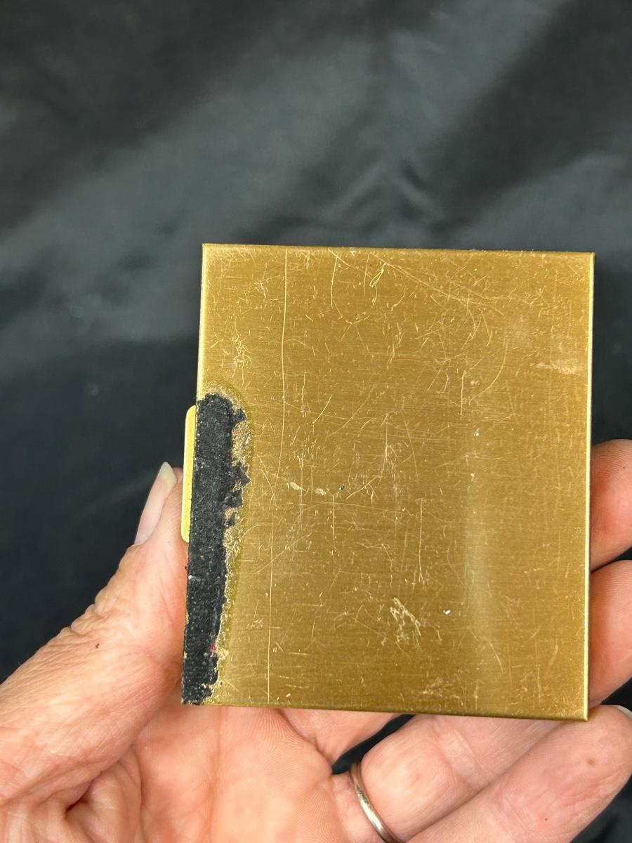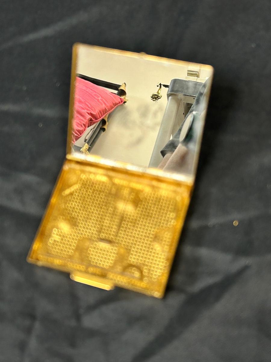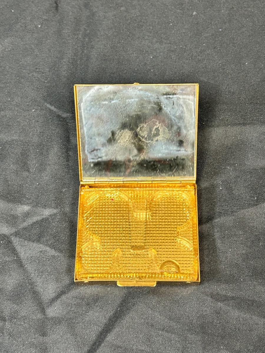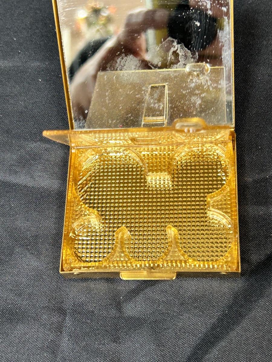 Vintage Shiny Gold Tone Makeup Compact with Rhinestone Money Dollar Sign on Lid. In good vintage condition. Plastic tray inside does not seem to come out. Mirror in good vintage condition.