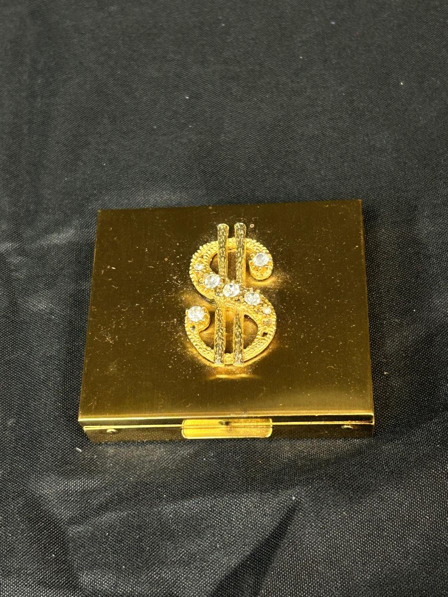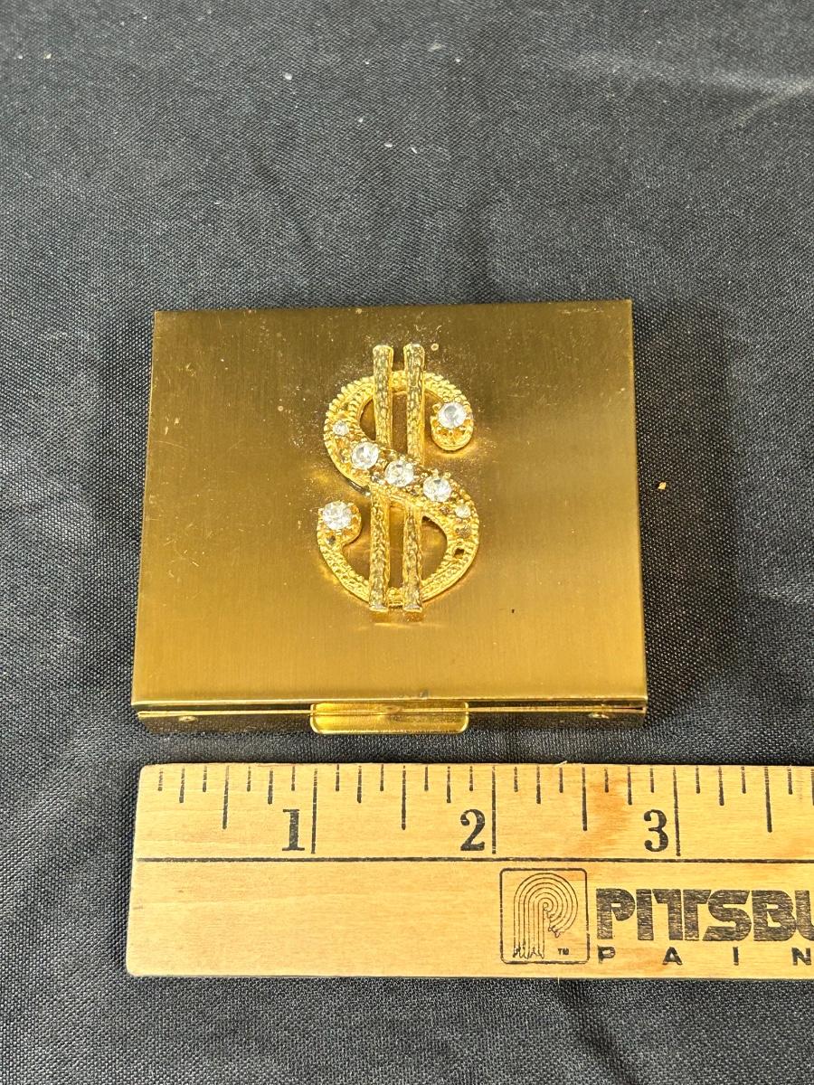Vintage Shiny Gold Tone Makeup Compact with Rhinestone Money Dollar Sign on Lid