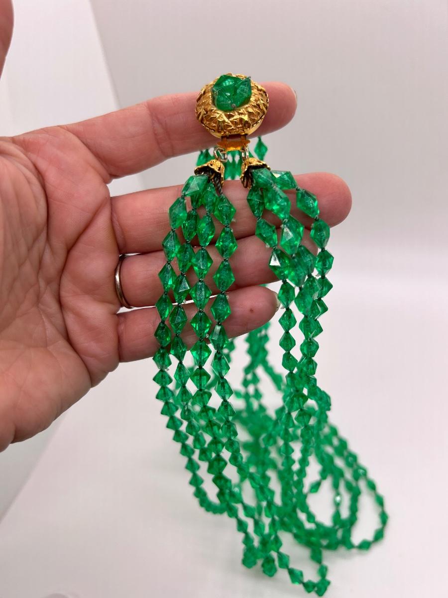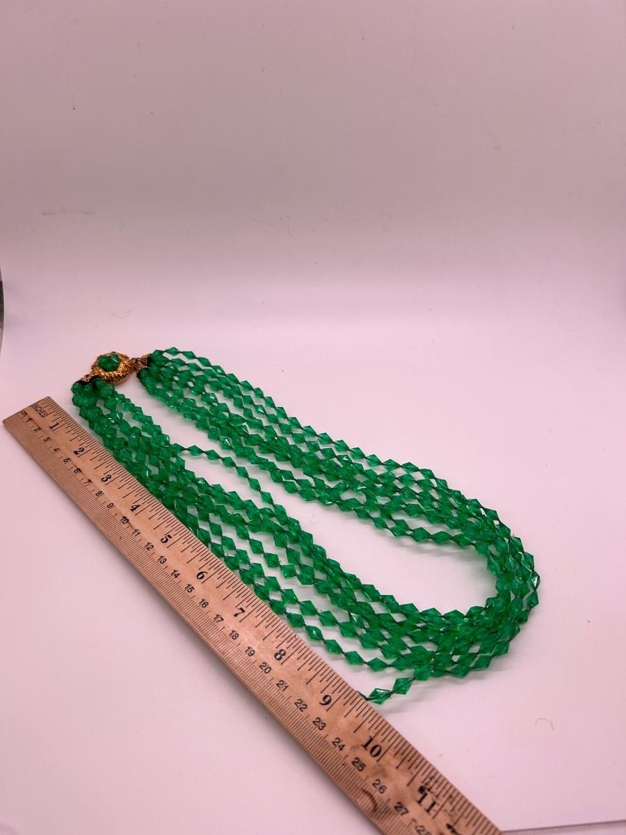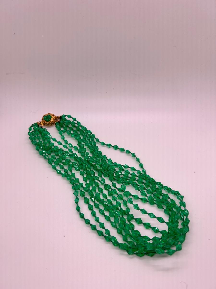 Vintage Kelly Green Plastic Multistrand Beaded Necklace. In good vintage condition. Chunky gold tone metal clasp.