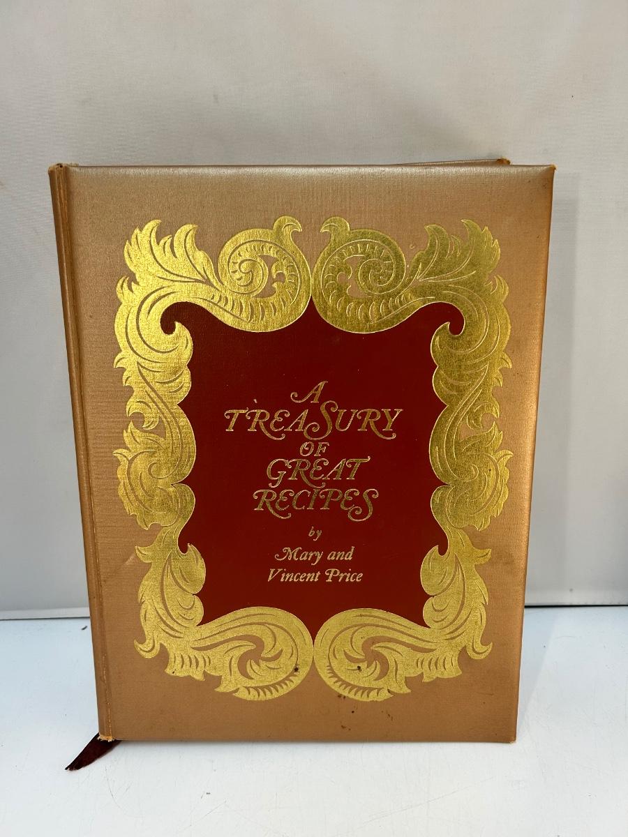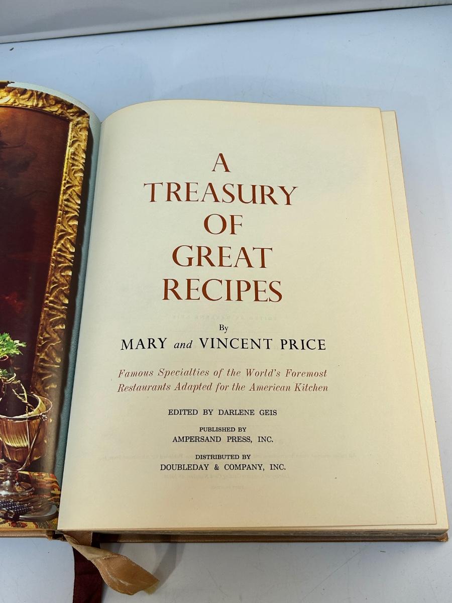 A Treasury of Great Recipes by Mary & Vincent Price Cookbook Famous Recipes Adapted for the American Kitchen. In good condition. Written by the actor Vincent Price and his wife. Filled with photos, recipes and other illustrations. First Printing, 1965.