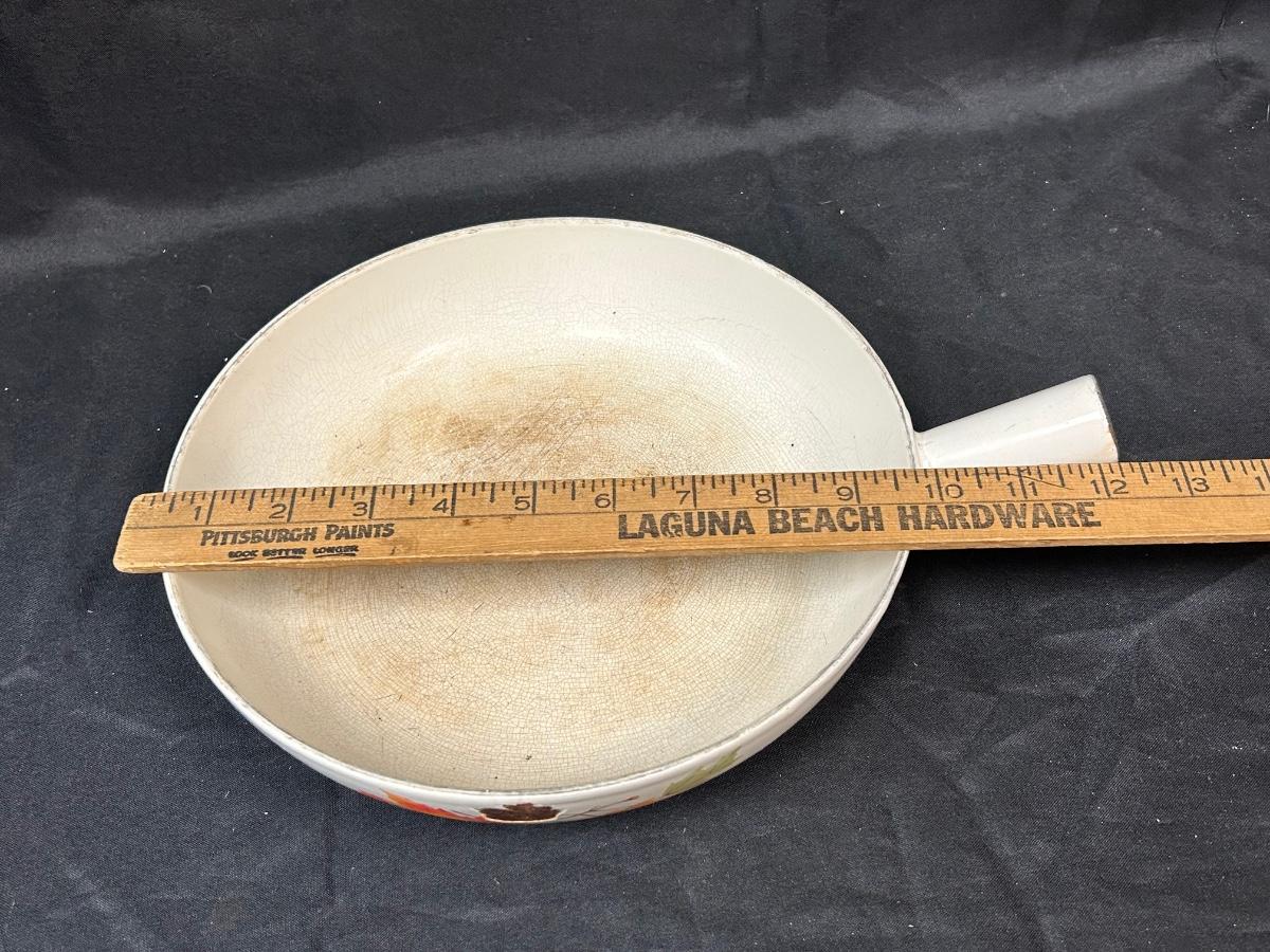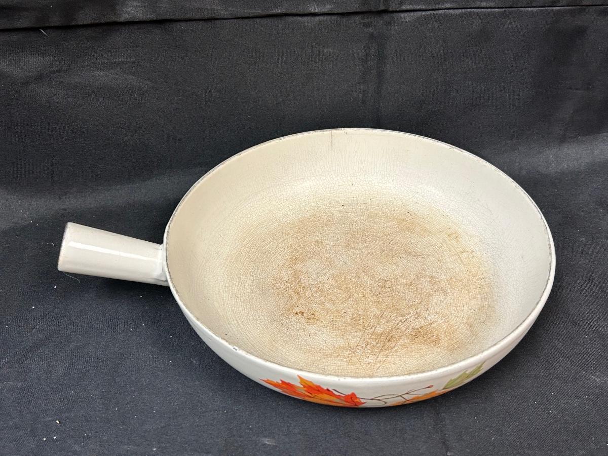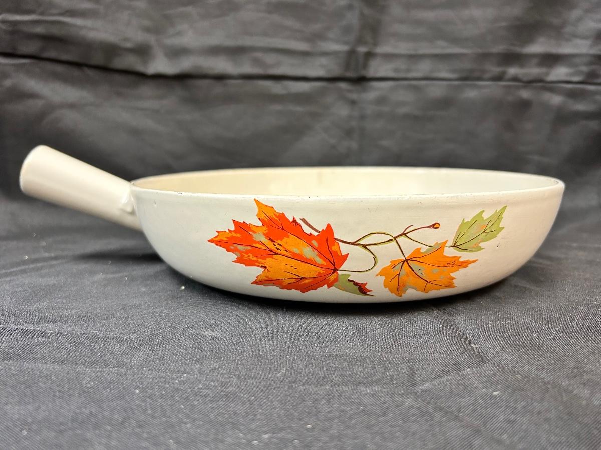 Vintage Worn Enamel over Cast Iron Skillet Fall Colored Leaves No Handle. Has quite a bit of wear but would display well. Handle would screw into place but is missing. See photos for better idea of condition.