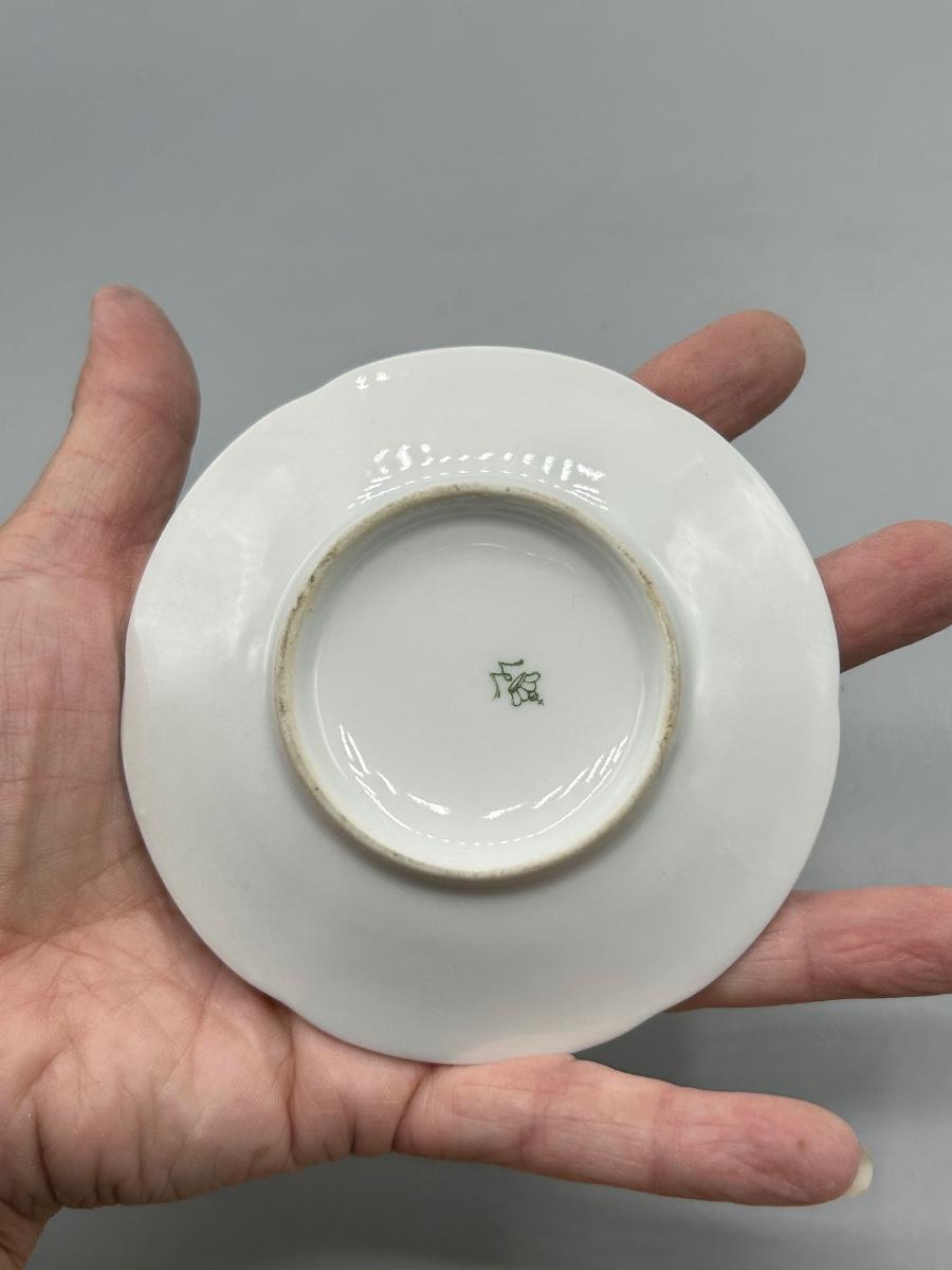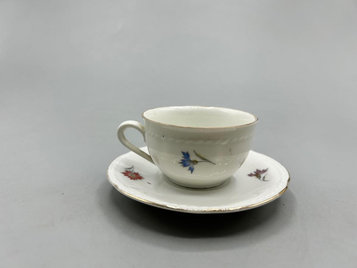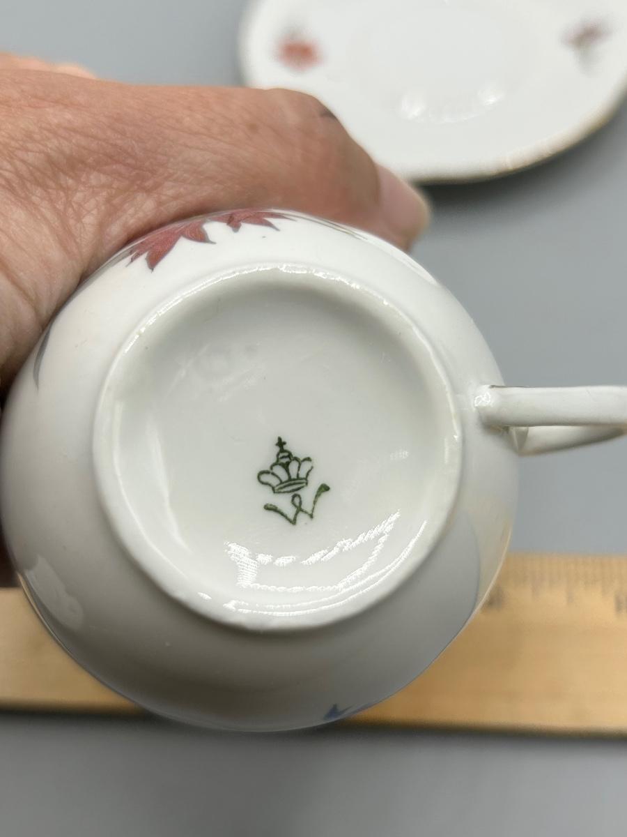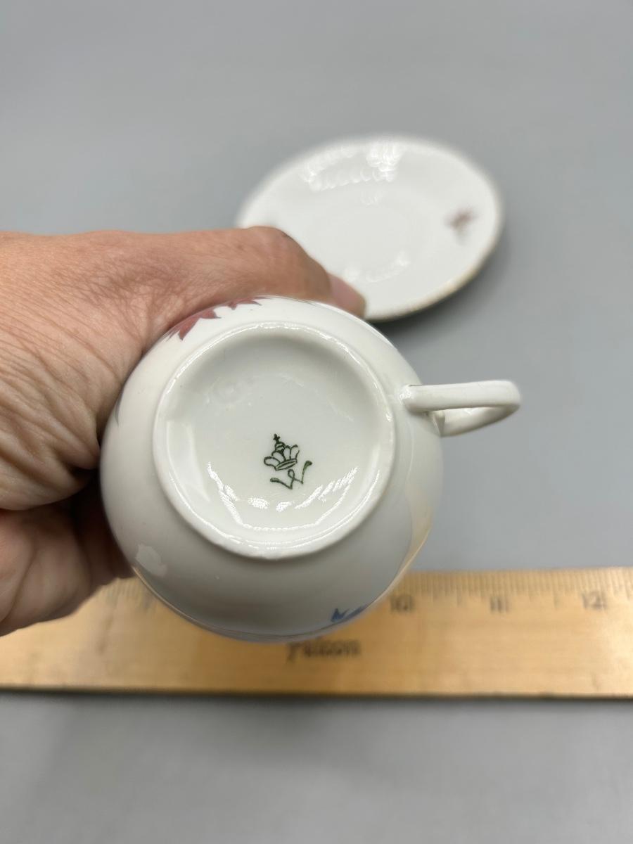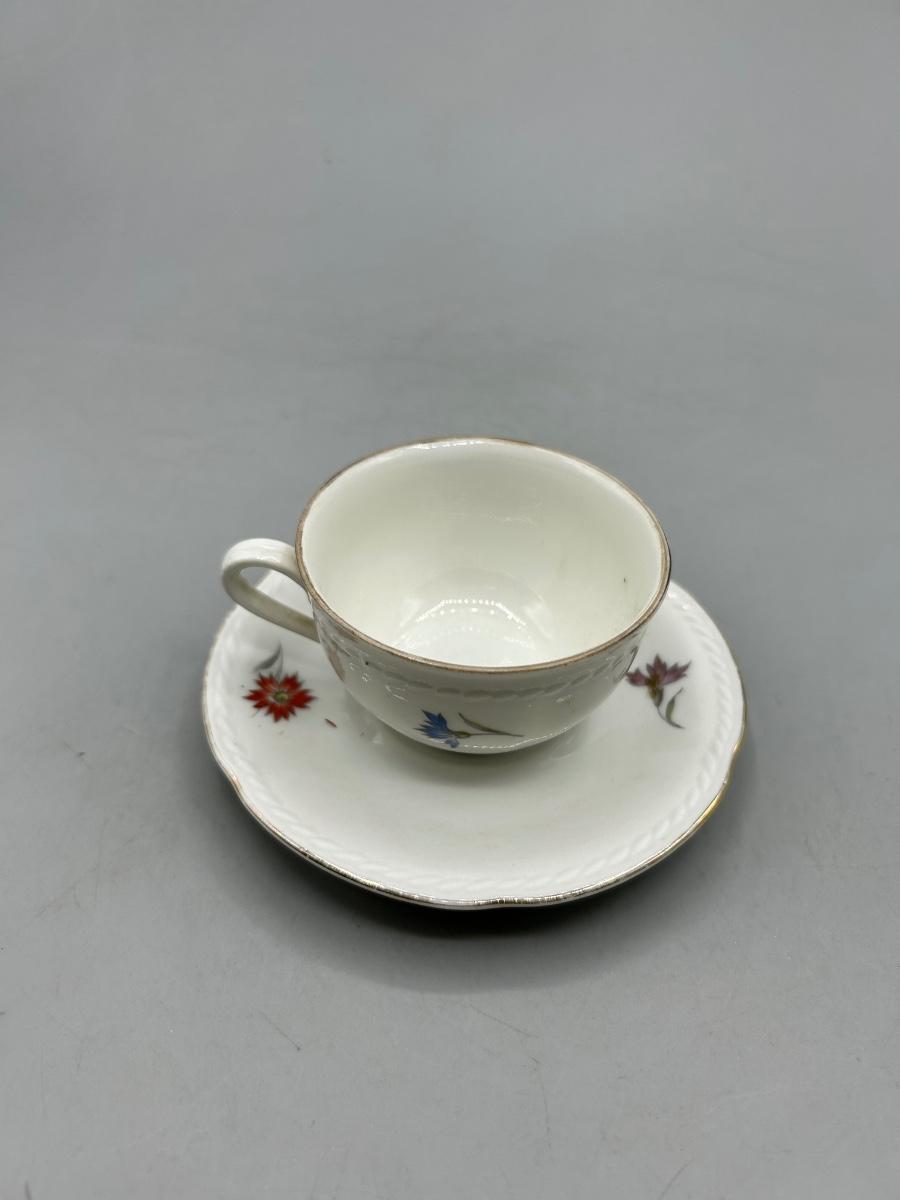 Vintage White Bone China Demitasse Teacup and Saucer with Simple Flower Print. In vintage condition, no chips just looks old.