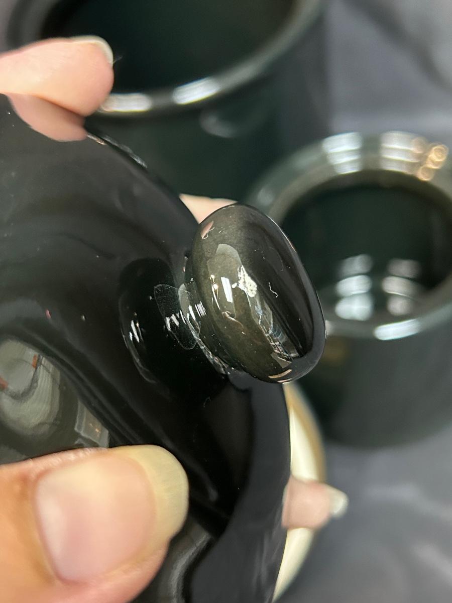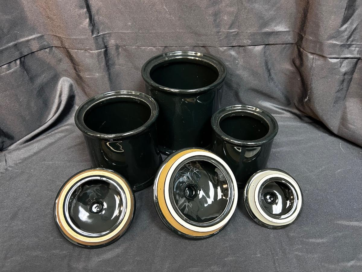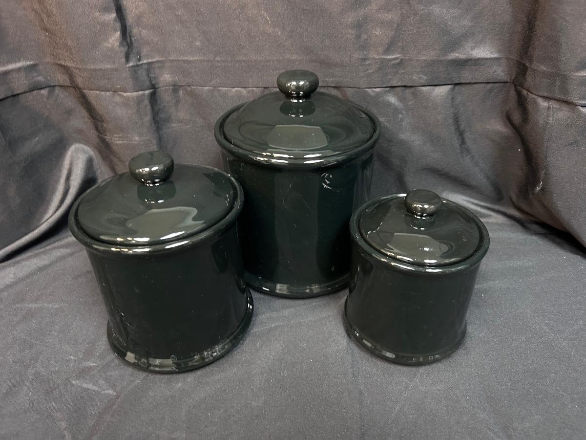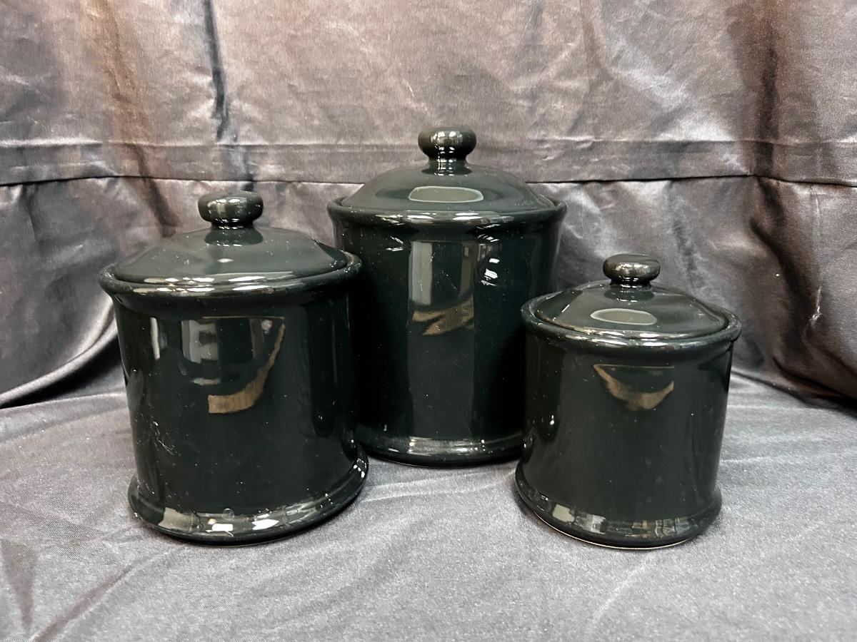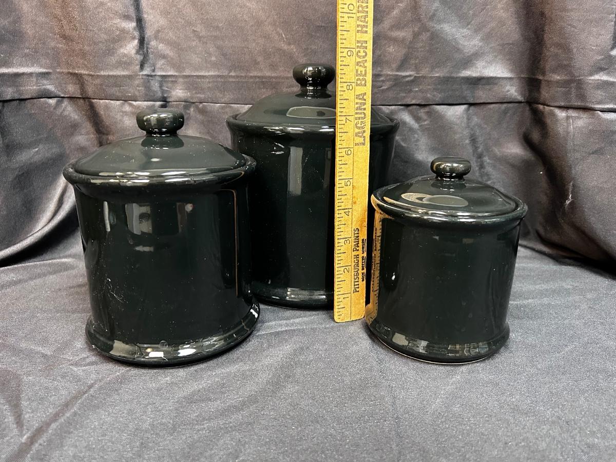 Cooks Club Black Ceramic Lidded Canister Cookie Jar Three Piece Set. Graduating sizes. In good previously used condition. Small chip on the knob of smallest canister but no other cracks or chips noticed.