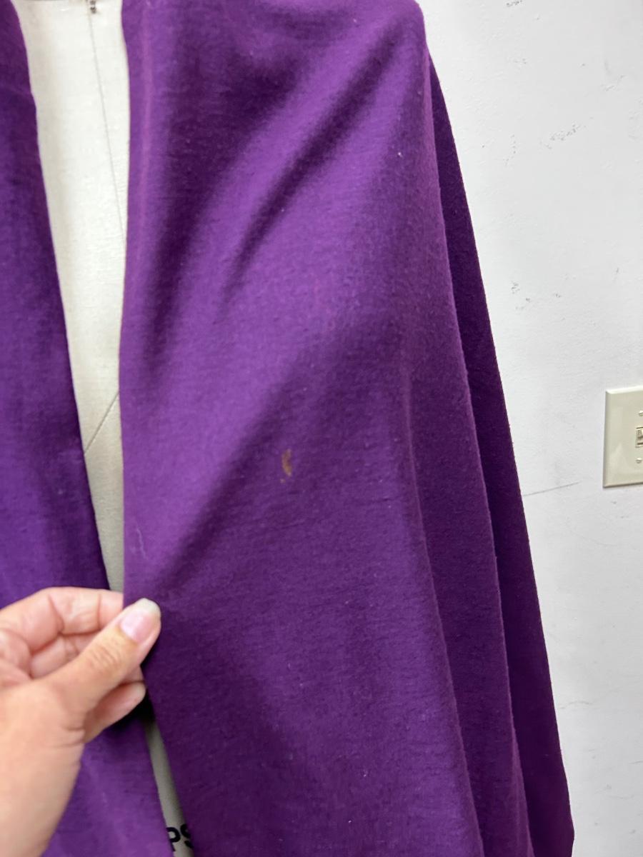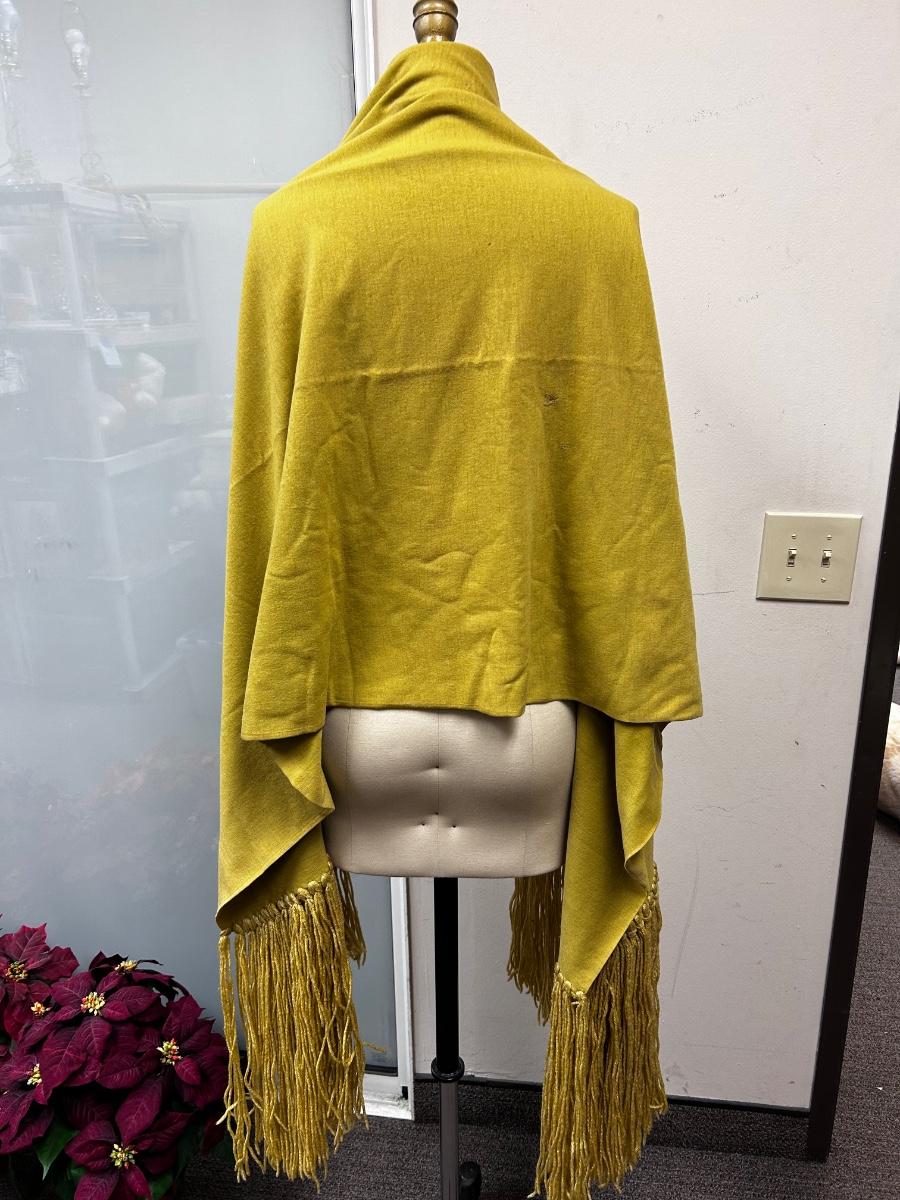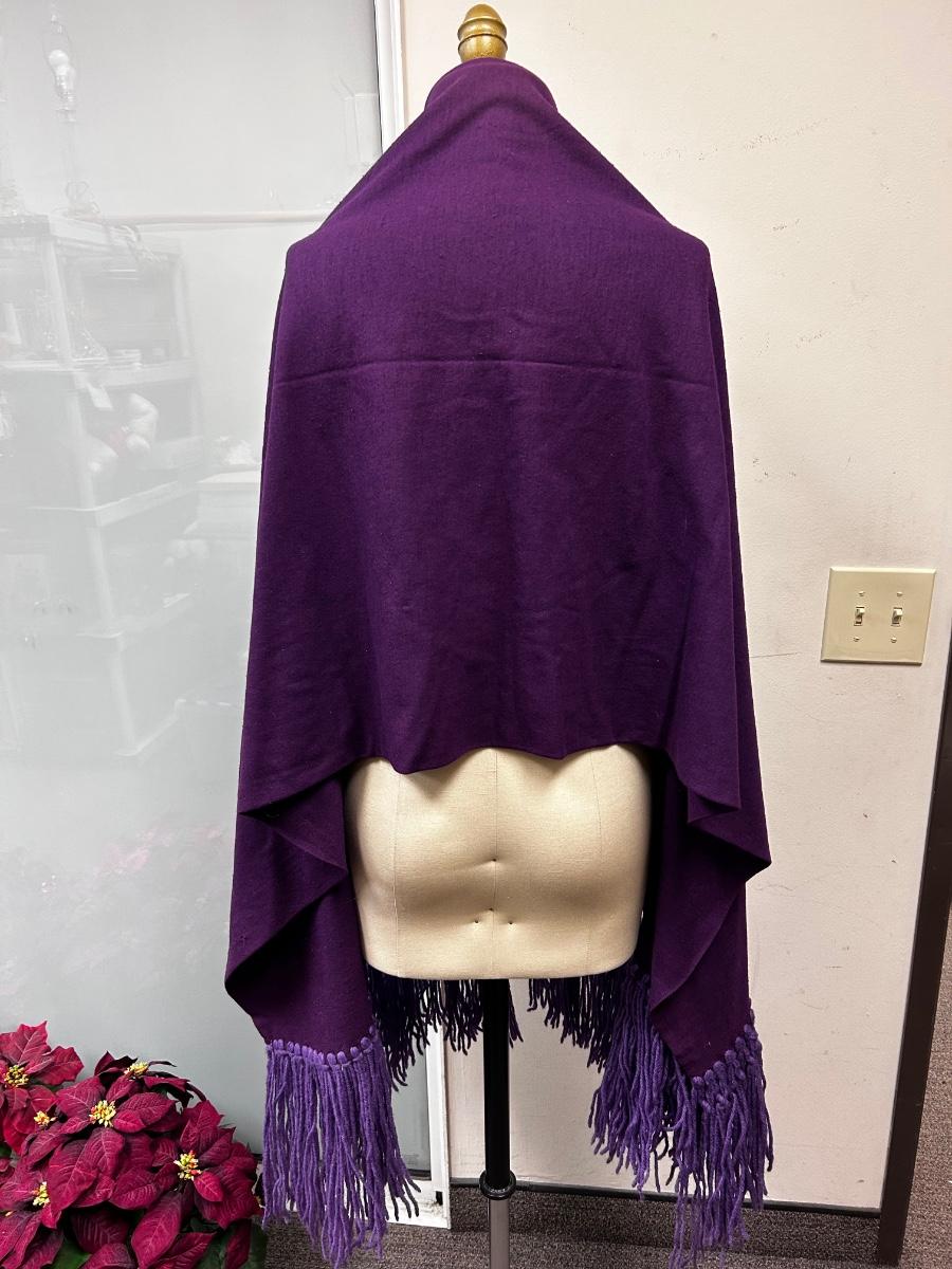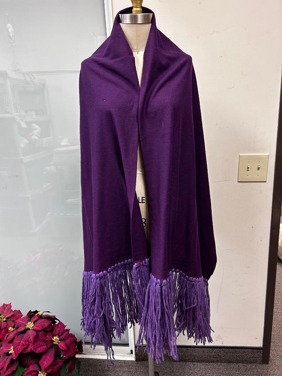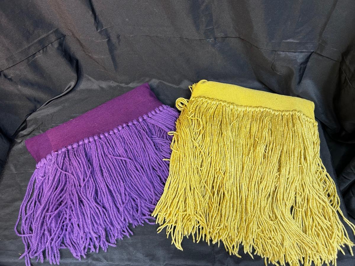 Pair of Vintage Yarn Fringed Knit Shawls Shoulder Wraps Chartreuse Gold & Purple. In vintage condition, a few small moth holes found but in wearable condition.
