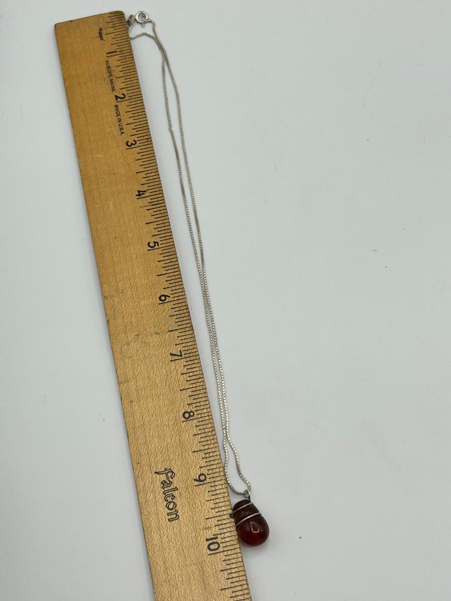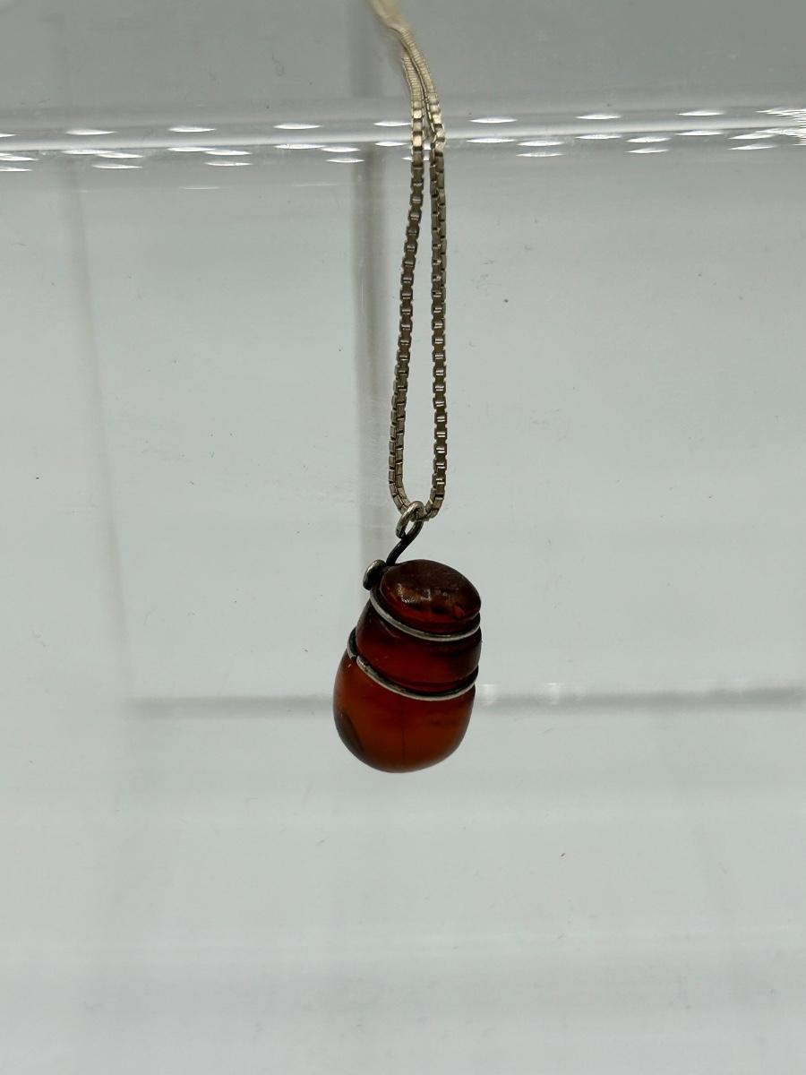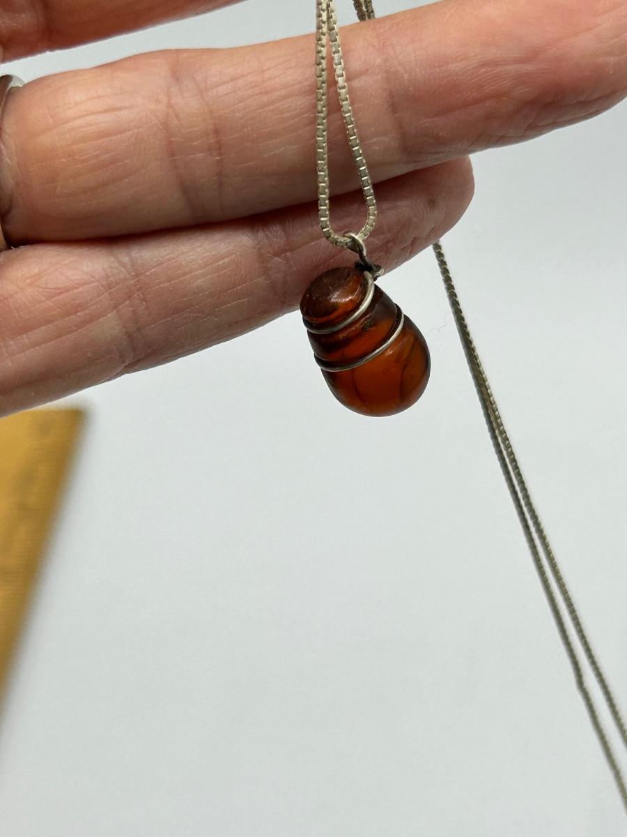 Artesian Abstract Amber Like Drip Marble Silver Wrapped Charm Pendant on Sterling Necklace. In good condition. The silver around the charm isn't marked but the necklace is sterling.