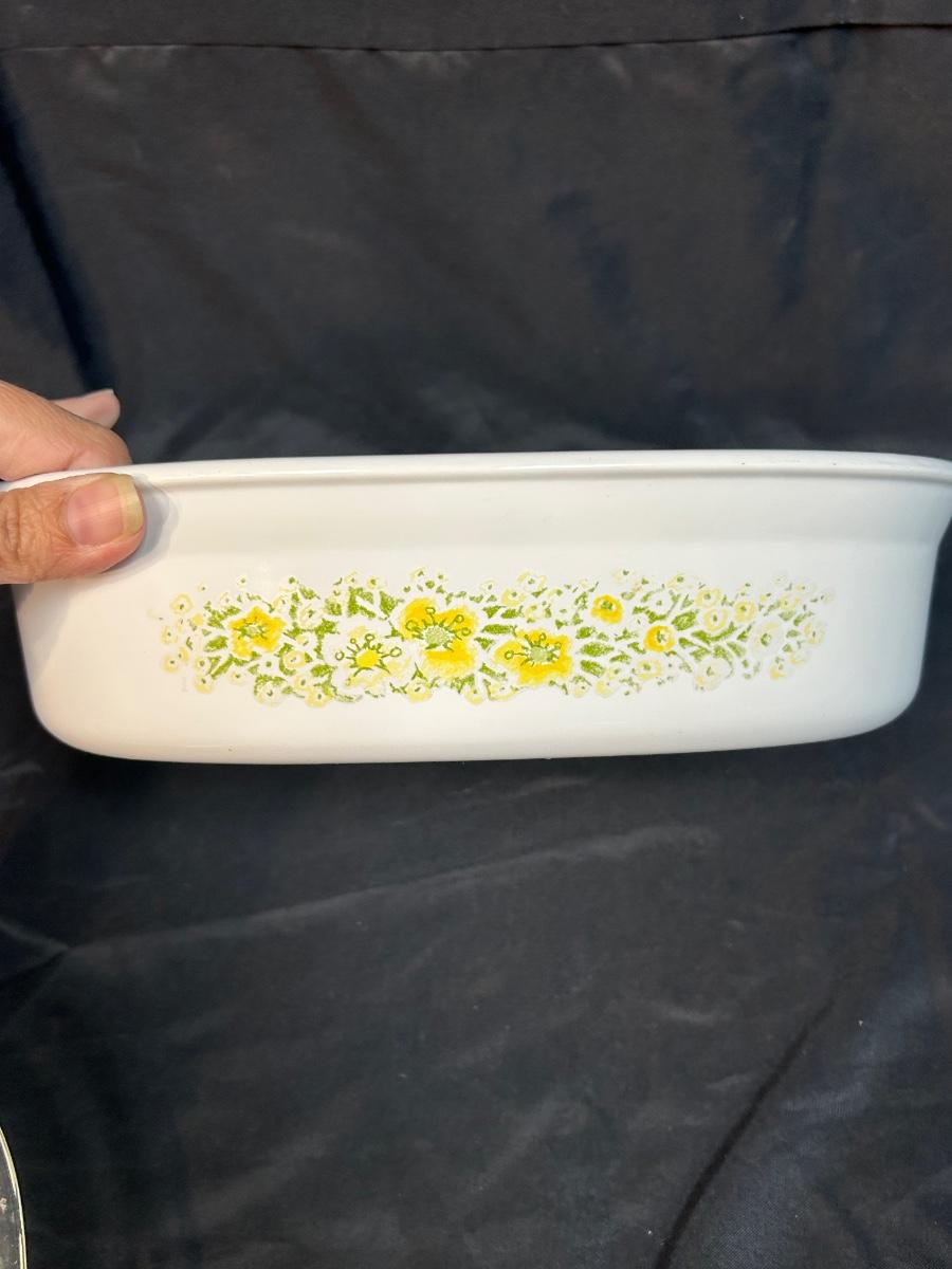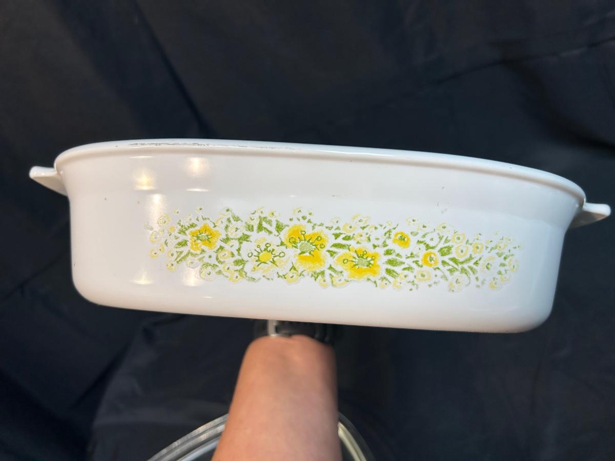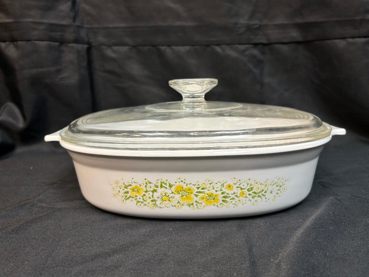 Vintage Retro Corning Ware Lidded Oblong Casserole Baking Dish 1.5qt April Yellow and White Flowers. In good condition. Very light wear normal with use. No chips.