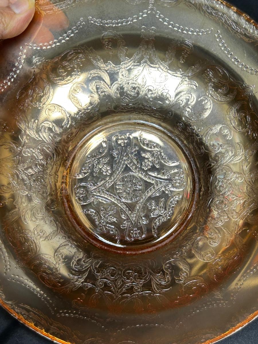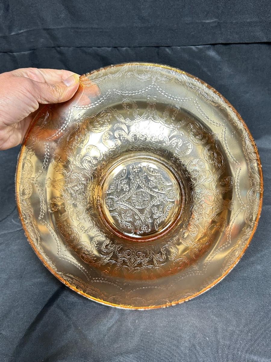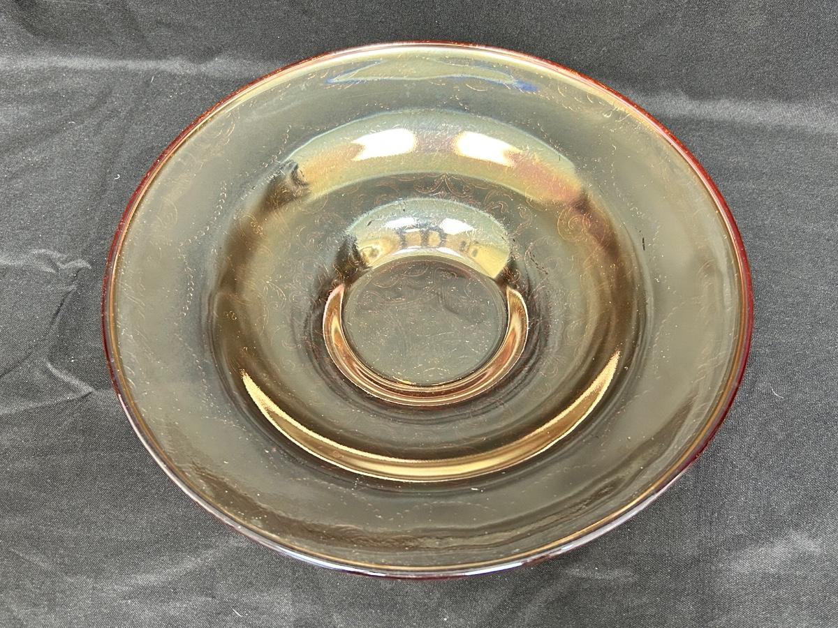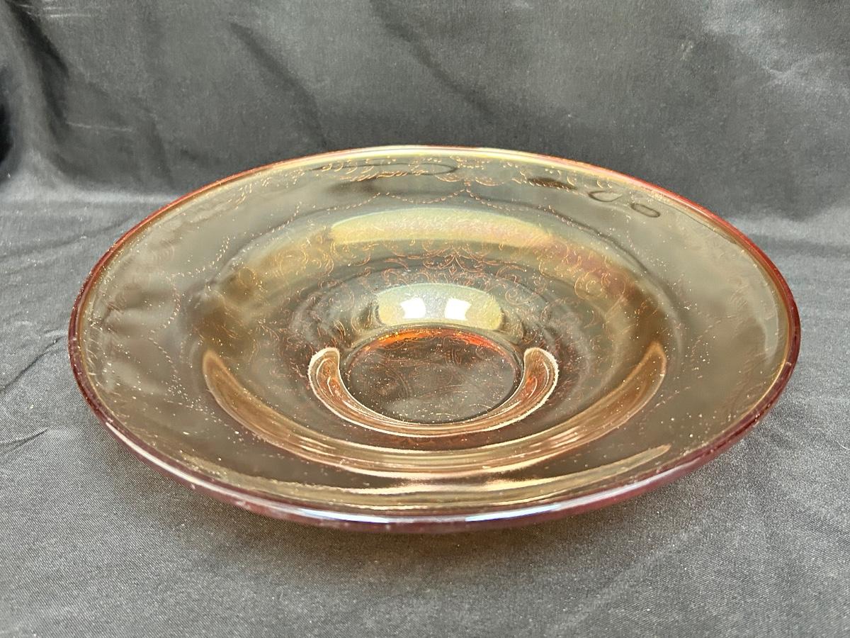 Vintage Marigold Iridescent Luster Carnival Depression Glass Shallow Console Bowl. In good condition. Delicate floral pattern on the underside with smooth inside.