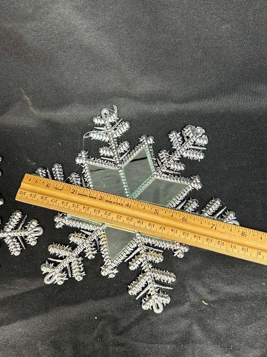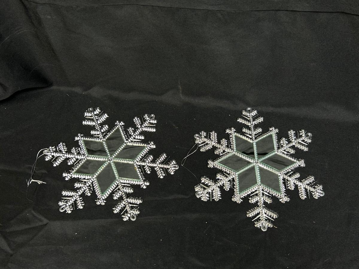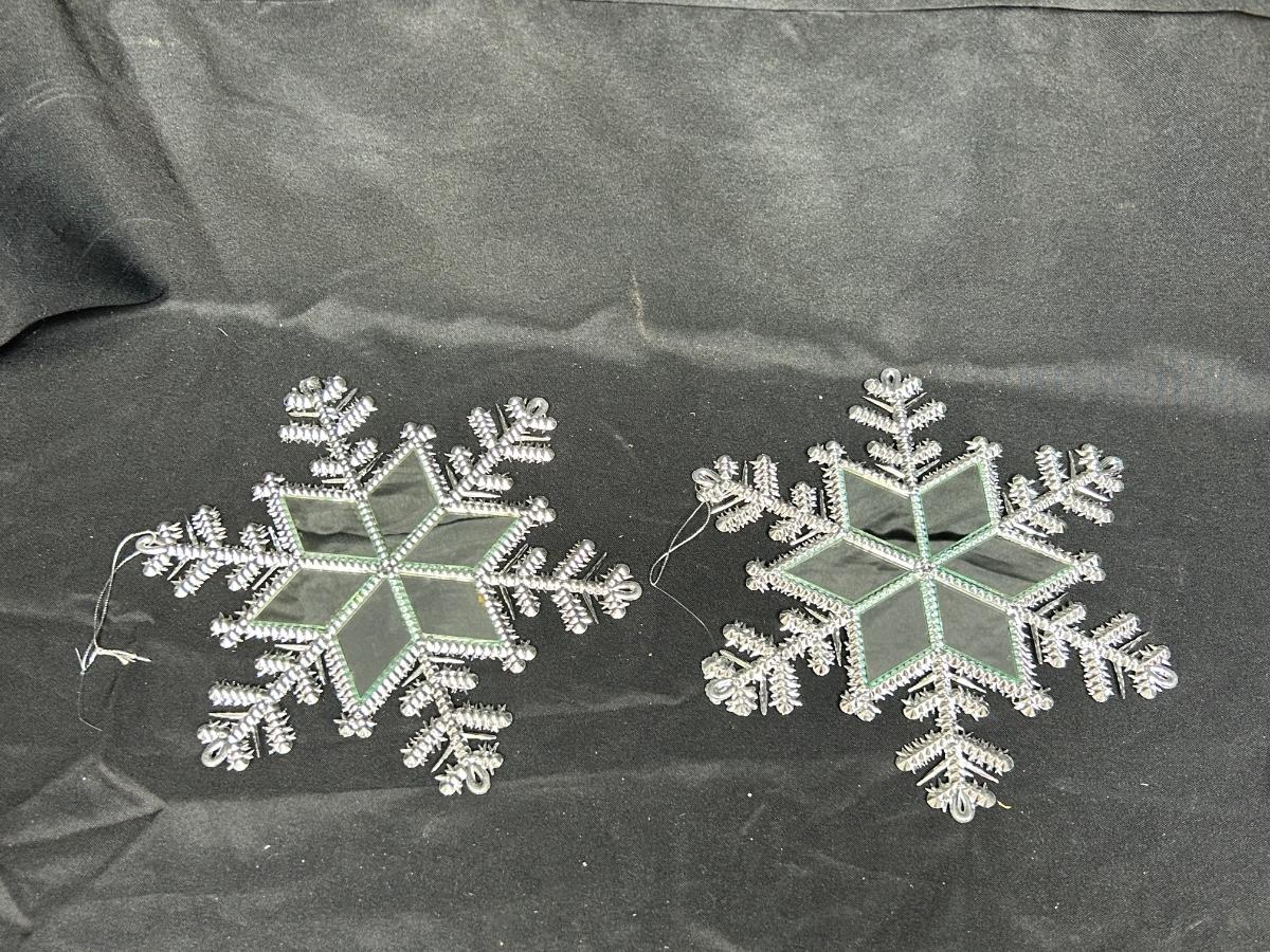 Pair of Vintage Silver Tone Mirrored Snowflake Hanging Christmas Holiday Ornaments. Large, about 8" size.