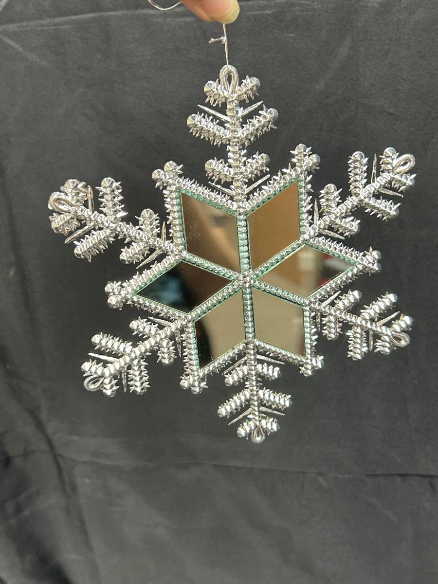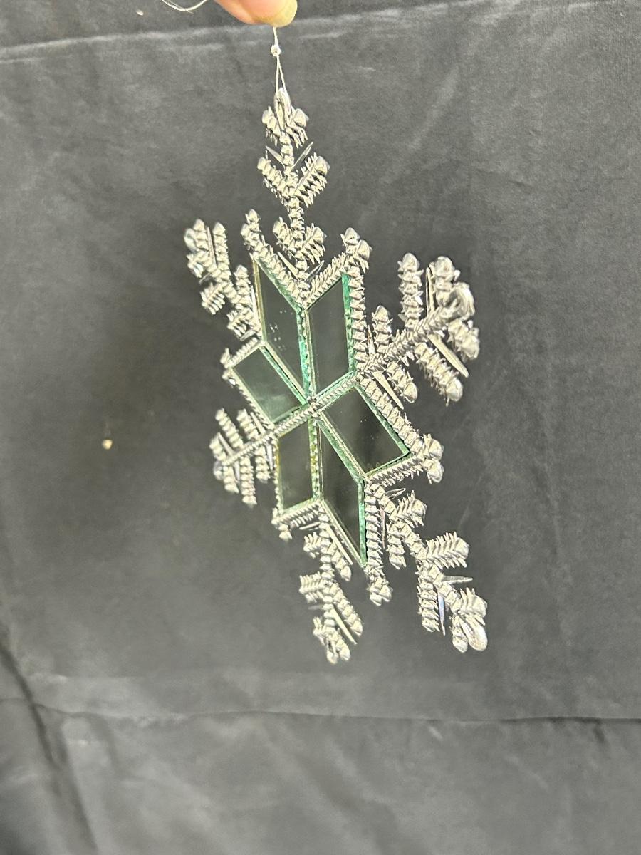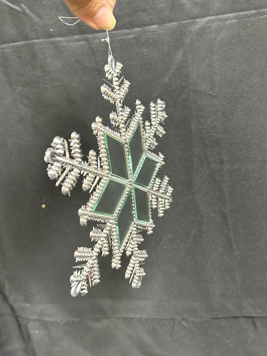 Pair of Vintage Silver Tone Mirrored Snowflake Hanging Christmas Holiday Ornaments. Large, about 8" size.