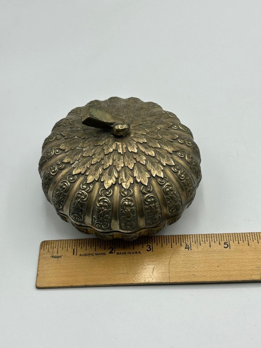Art Deco Nouveau Regency Gourd Squash Shaped Metal Trinket Powder Dish. In good condition. A little over 4" size.