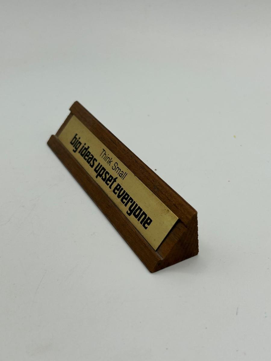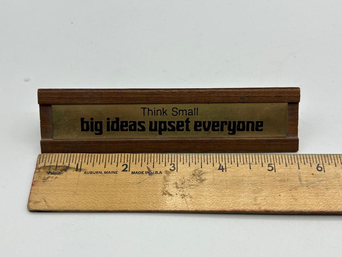 Retro Desk Sitting Plaque Think Small Big Ideas Upset Everyone. Novelty desk plaque in good condition. Small, under 6" size.