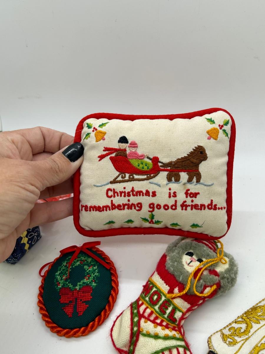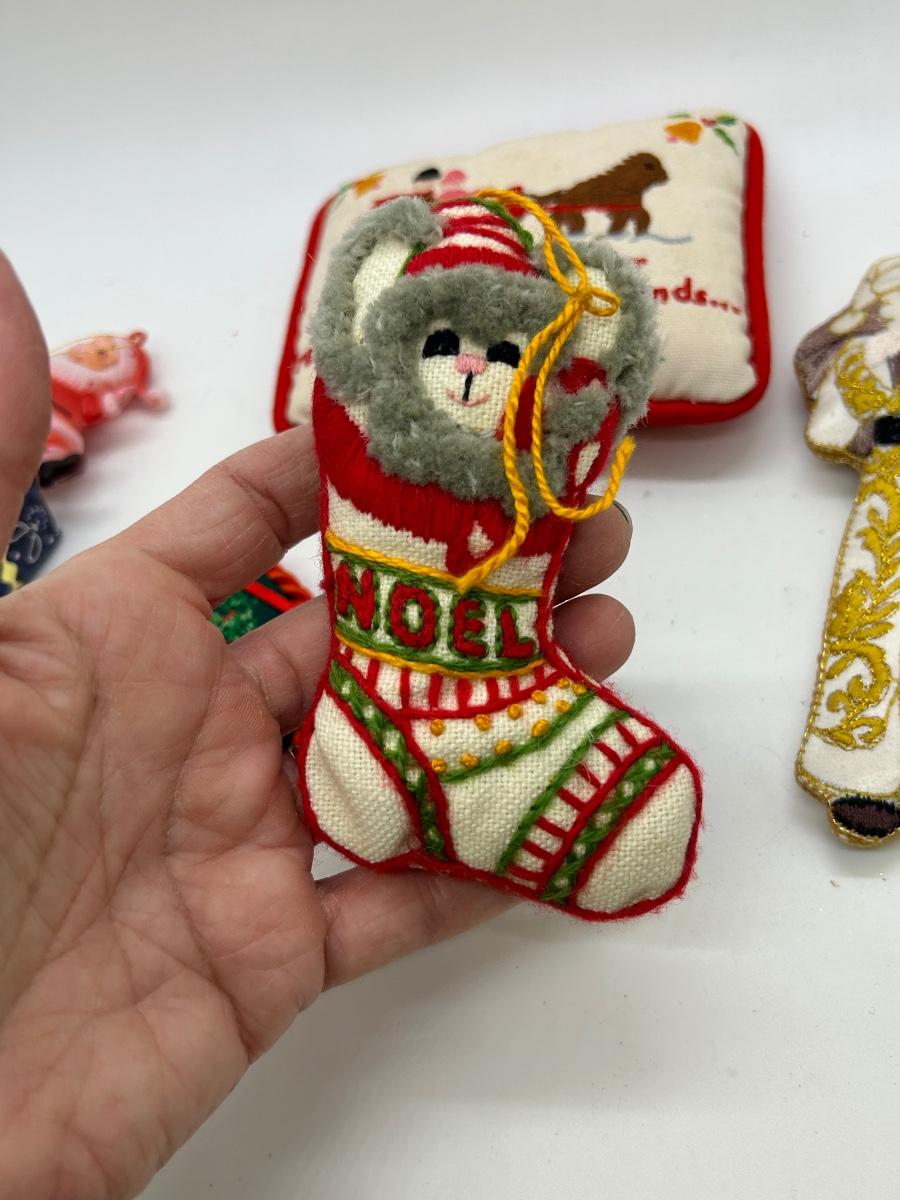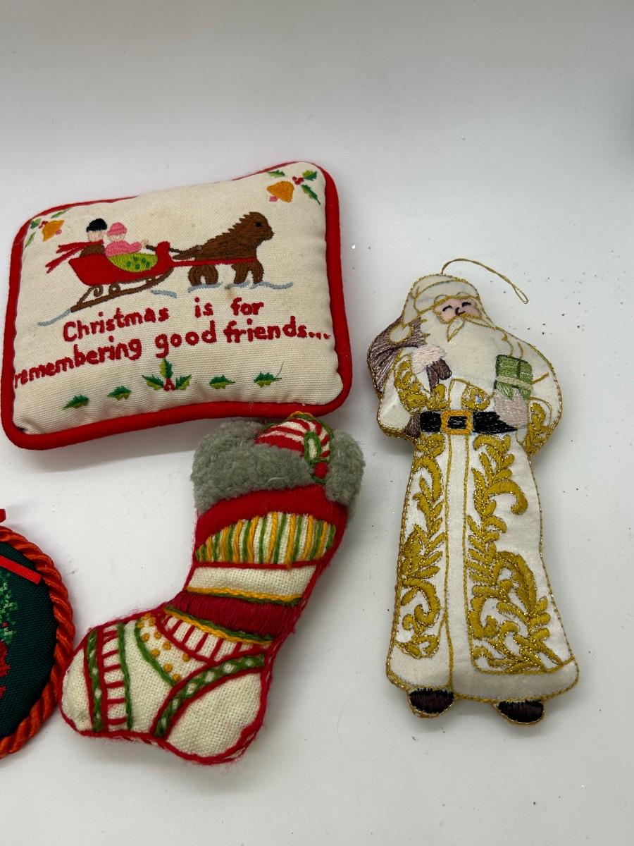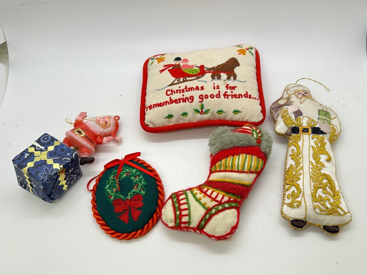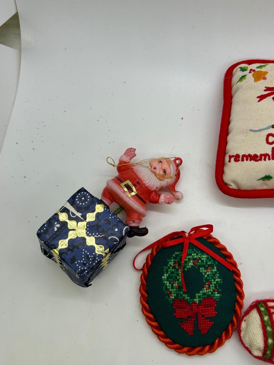 Mixed Lot of Christmas Holiday Tree Ornaments Celluloid Santa and Plush Decorations. In good previously displayed condition.