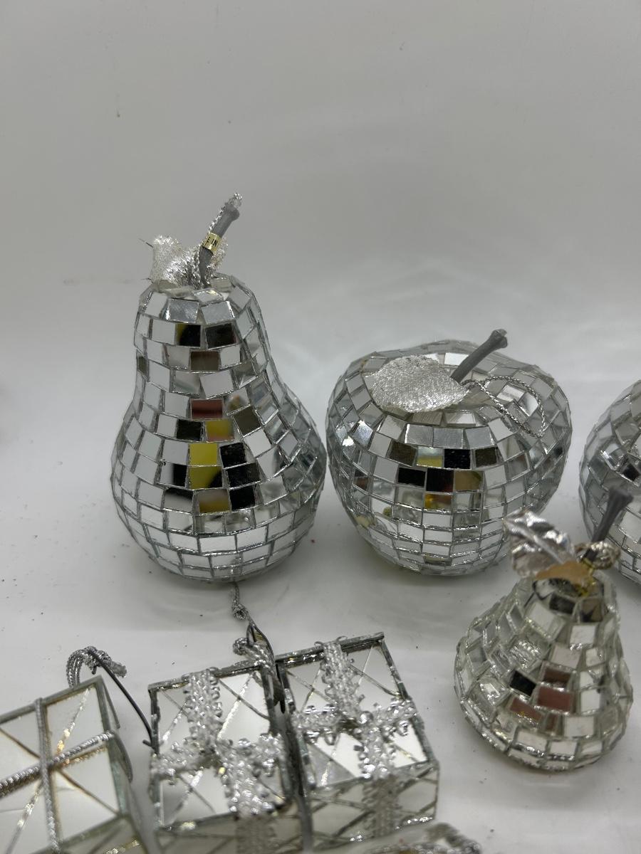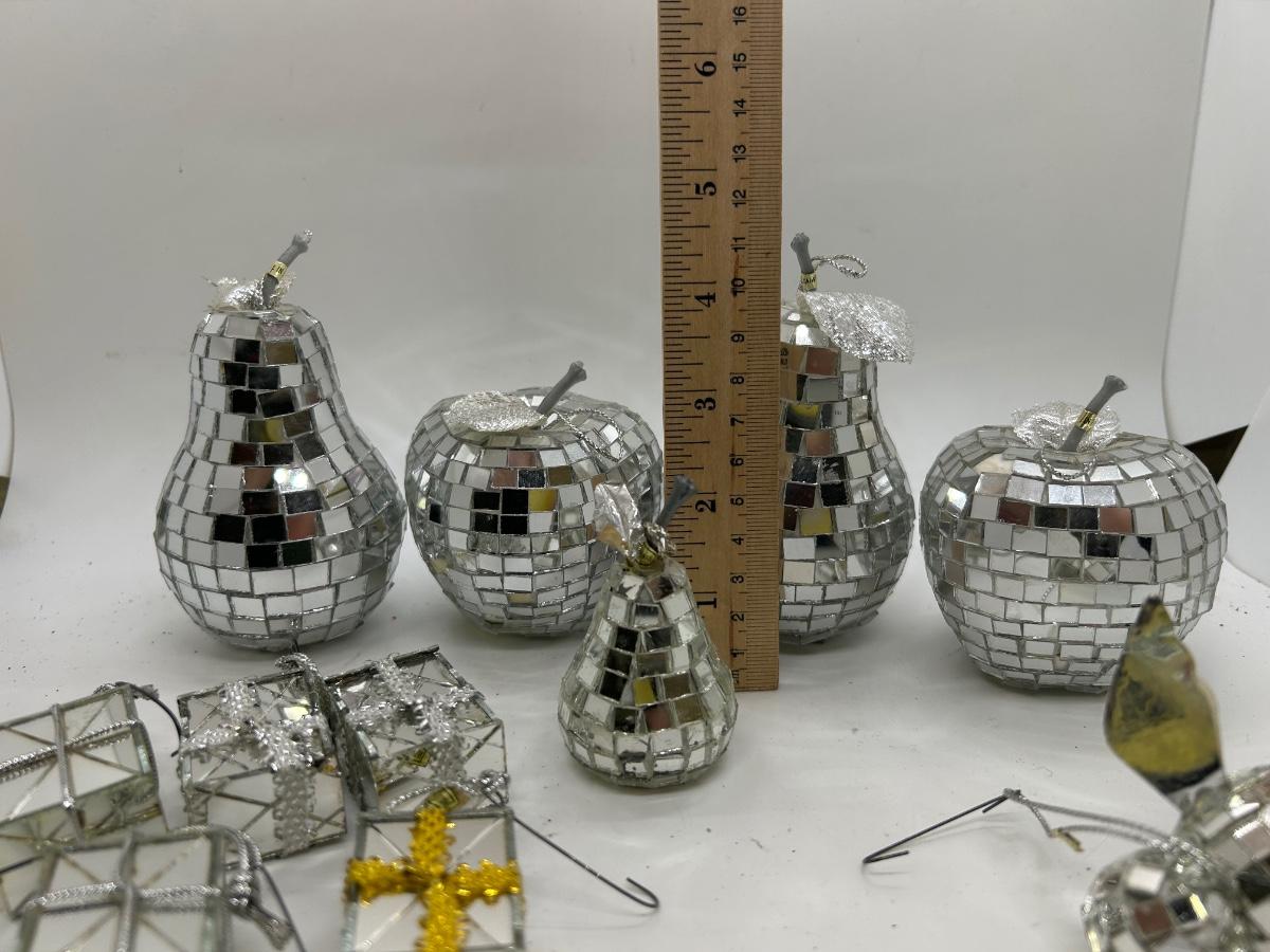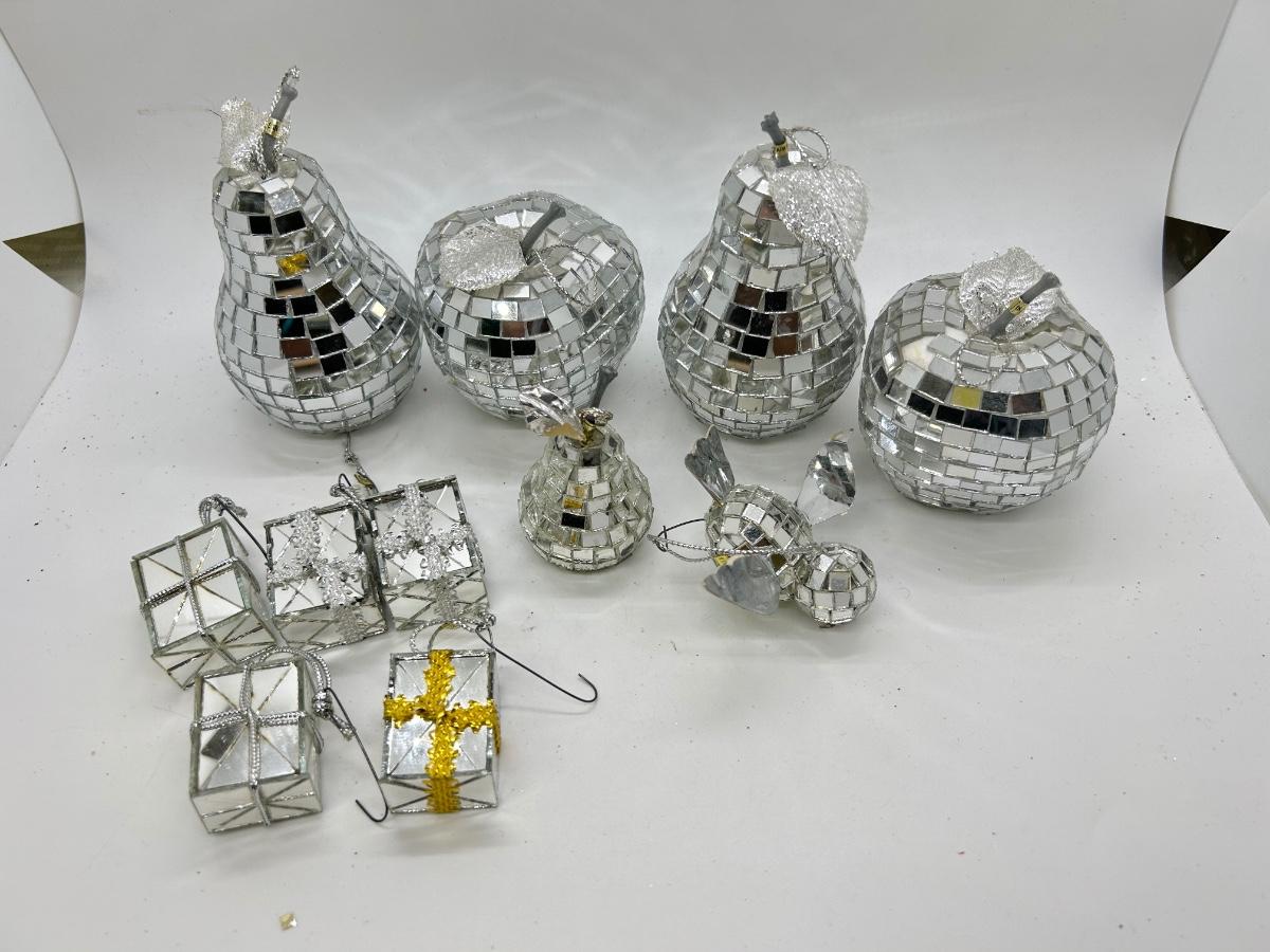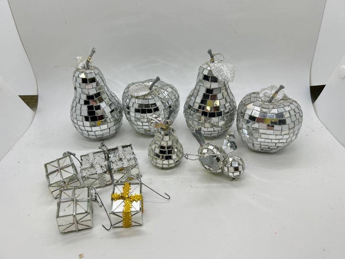 Mixed Lot of Mirrored Reflective Christmas Holiday Ornament Decorations. Lot includes fruit, bird, bell, and packages all in a reflective mirror ball like style. In good condition. Great for decor or crafts.