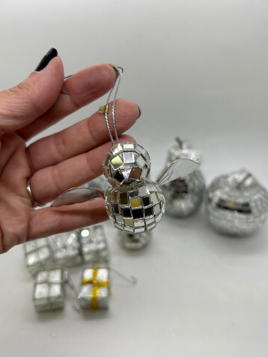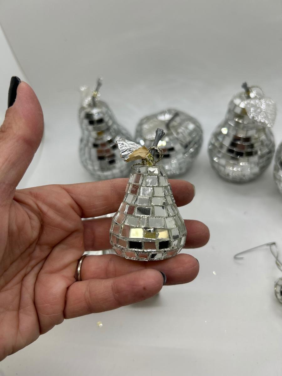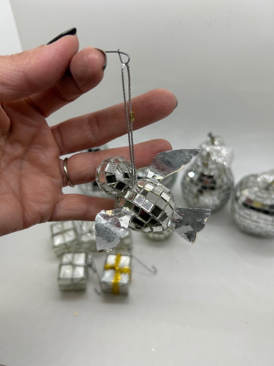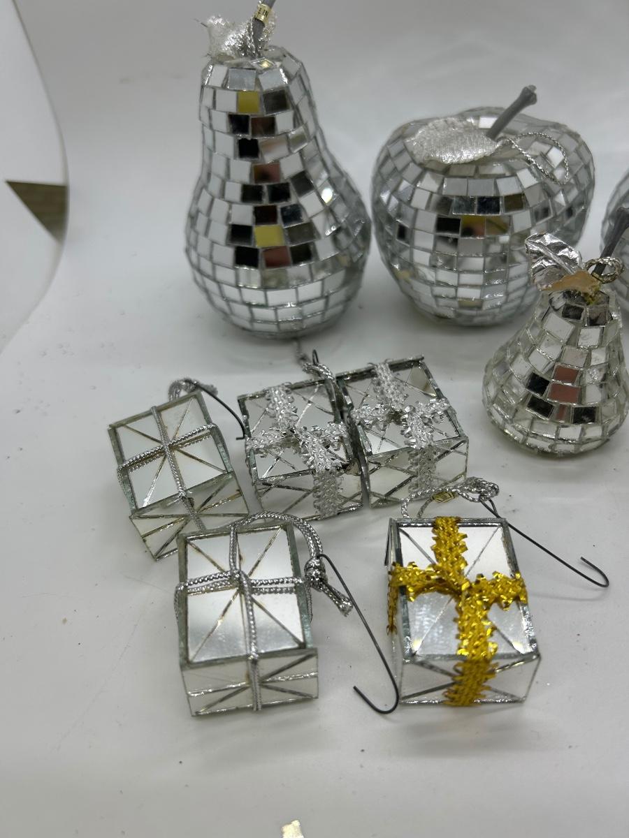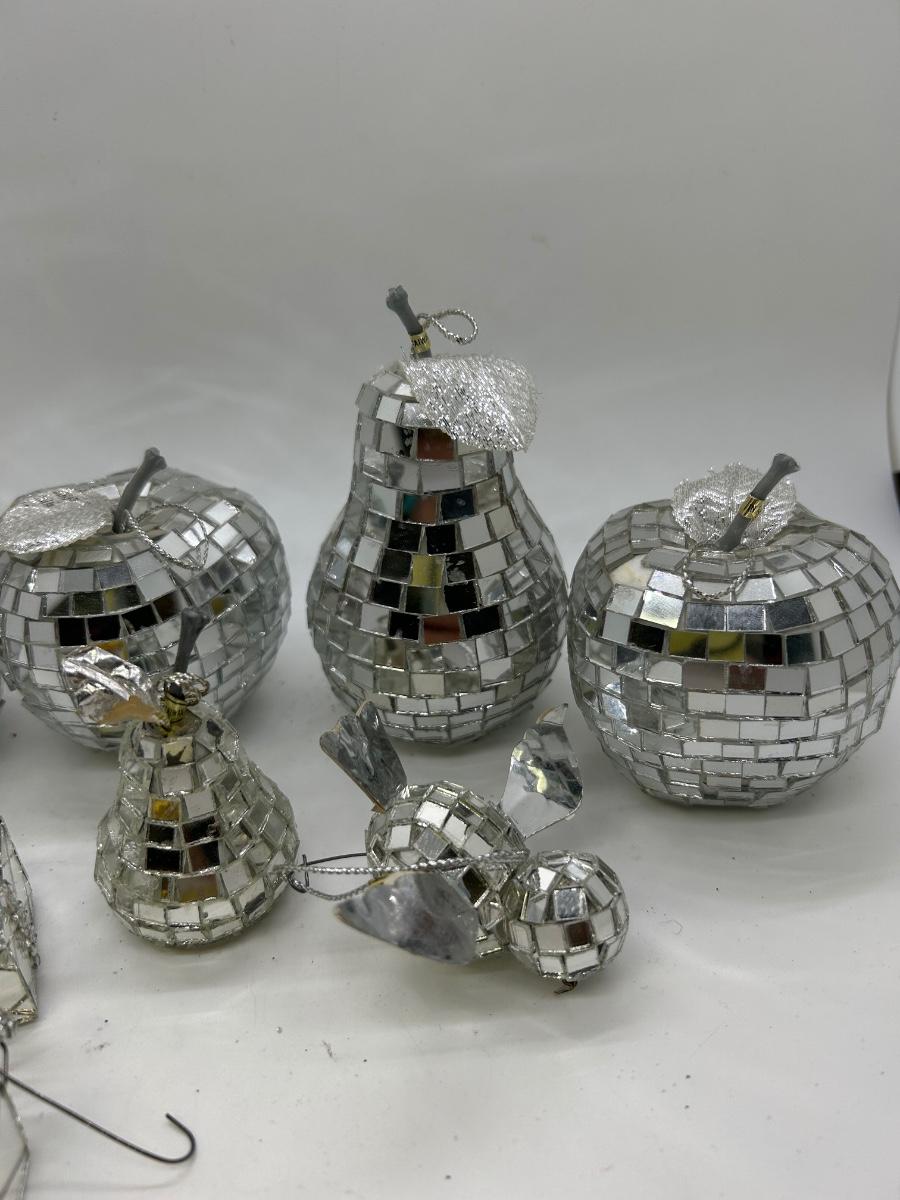 Mixed Lot of Mirrored Reflective Christmas Holiday Ornament Decorations. Lot includes fruit, bird, bell, and packages all in a reflective mirror ball like style. In good condition. Great for decor or crafts.