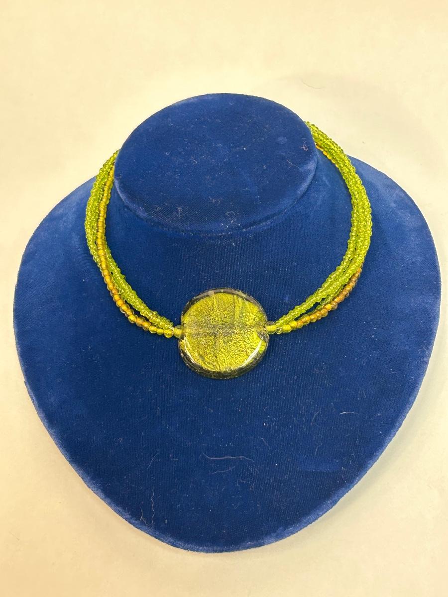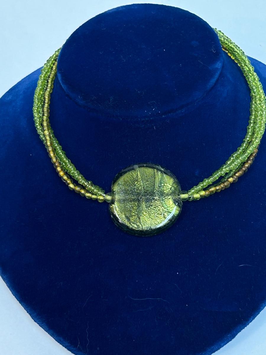 Choker Style Green Glass Bead Multistrand Necklace with Large Medallion Center