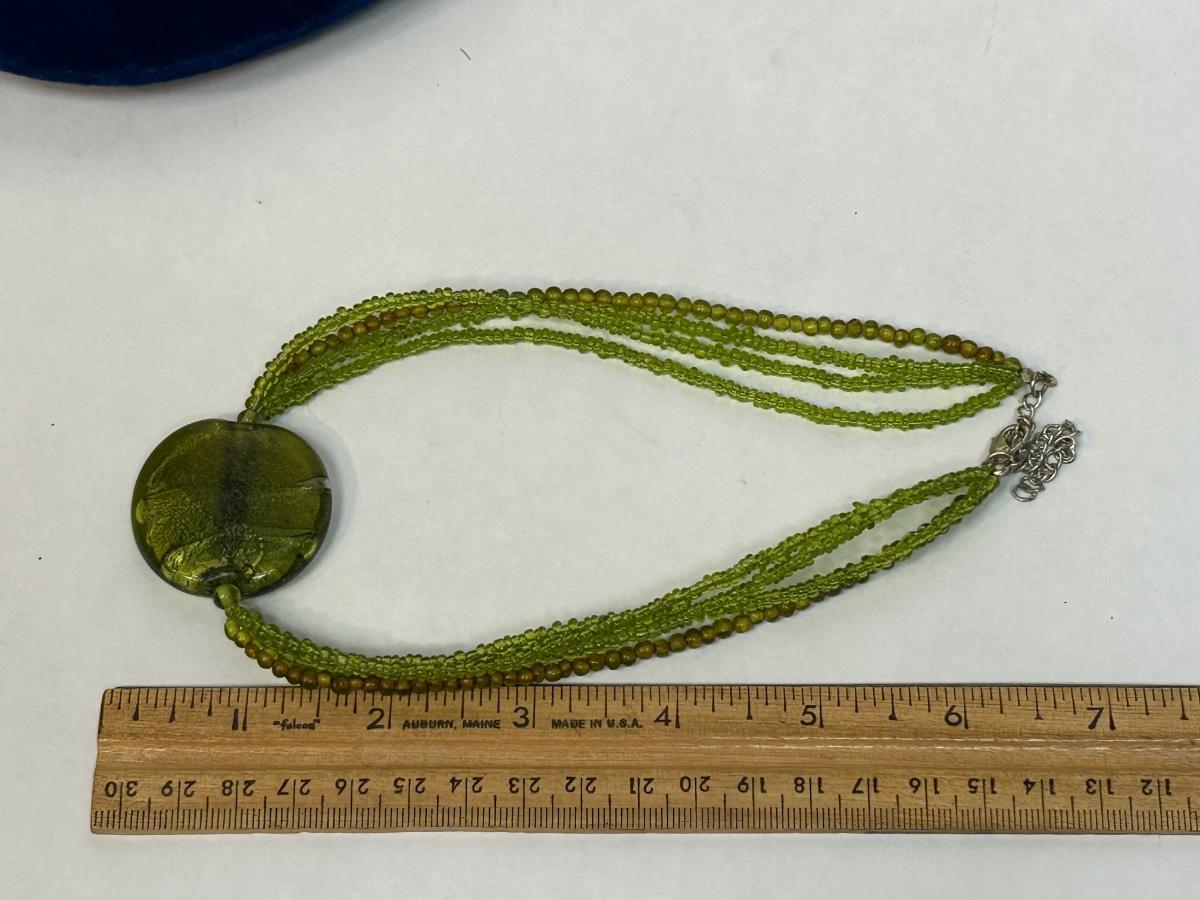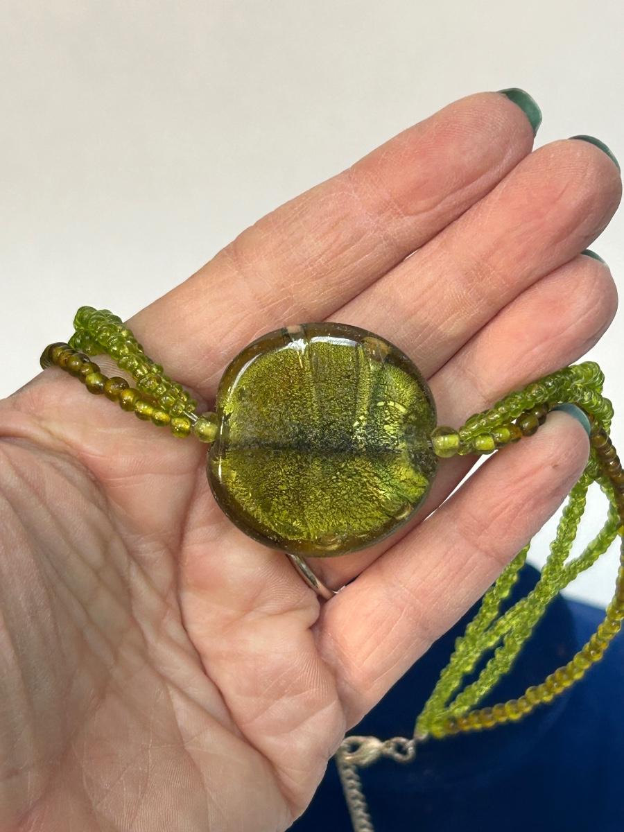 Choker Style Green Glass Bead Multistrand Necklace with Large Medallion Center. In good condition. Glass has slight shimmer.