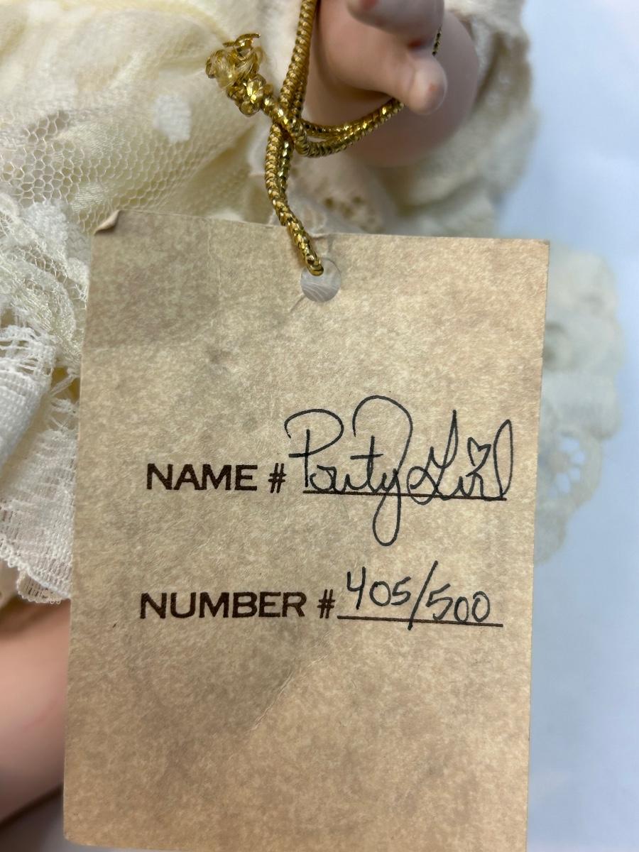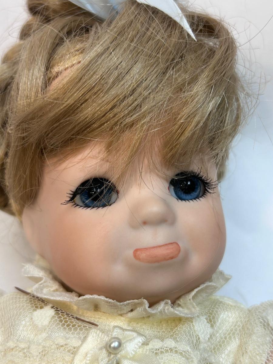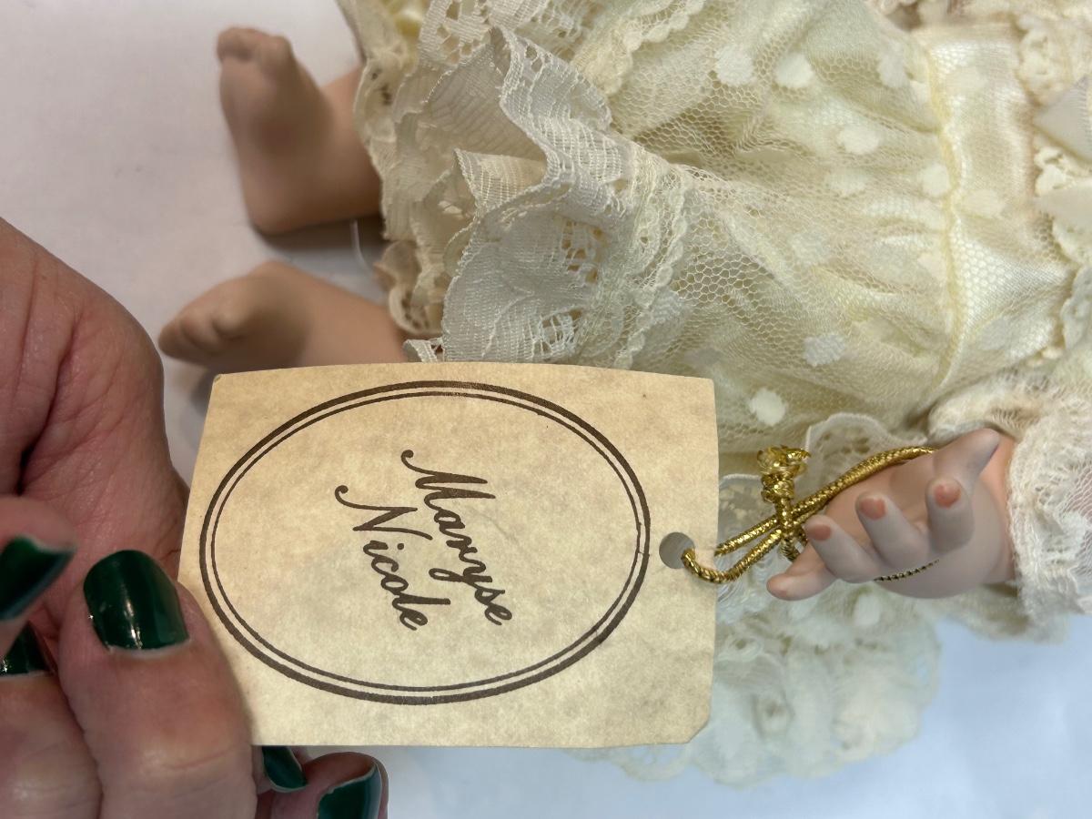 Pouting Porcelain Baby Doll by Manyse Nicole Pouty Girl #405/500. Numbered and dated on back of neck. Has original maker hang tag attached. In good previously displayed condition.