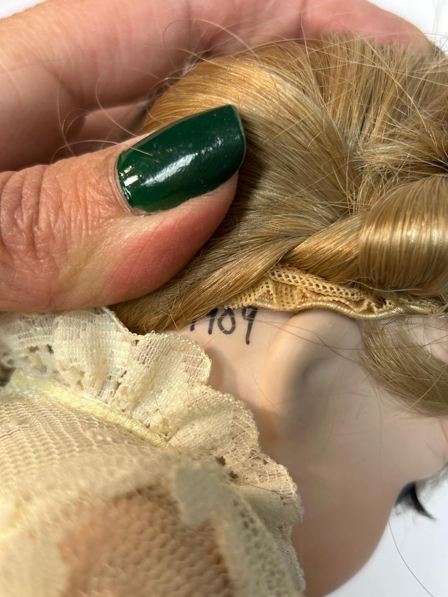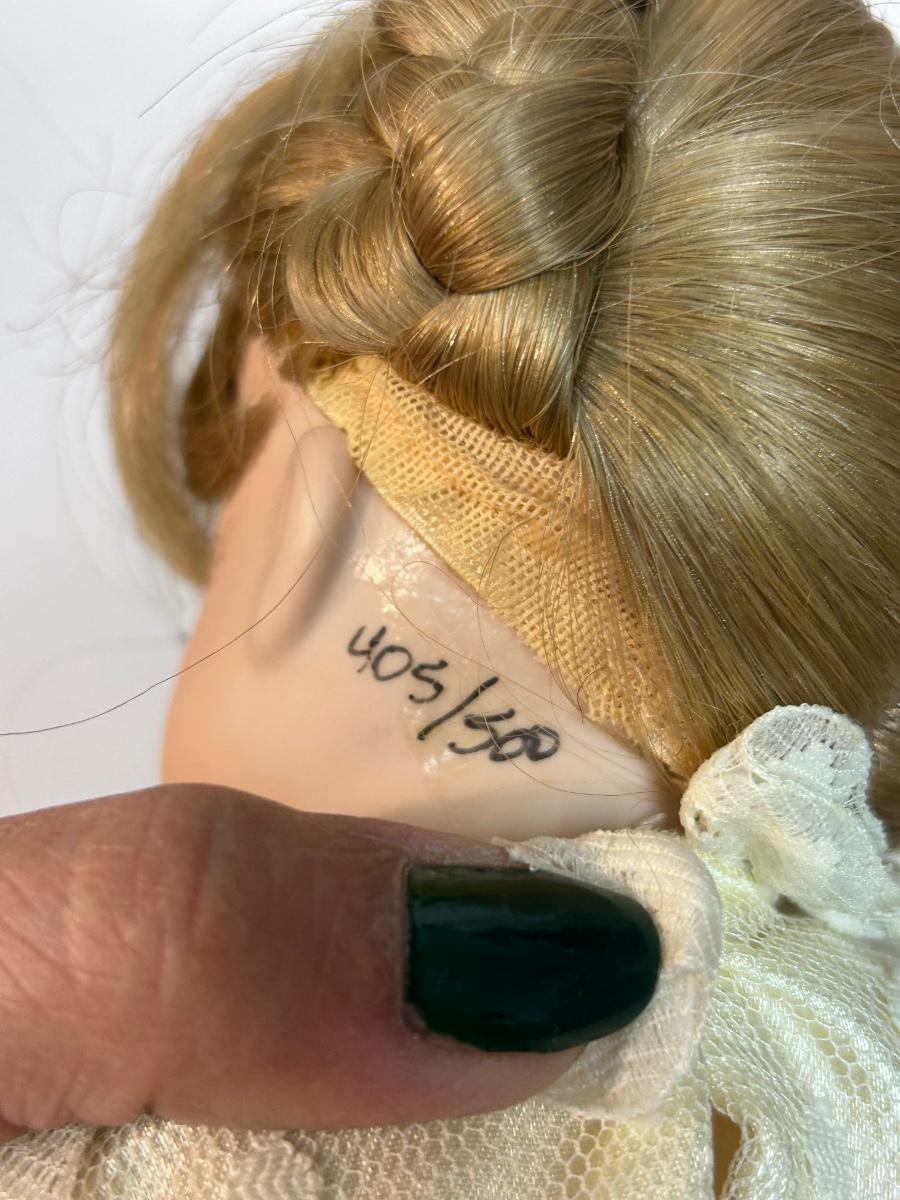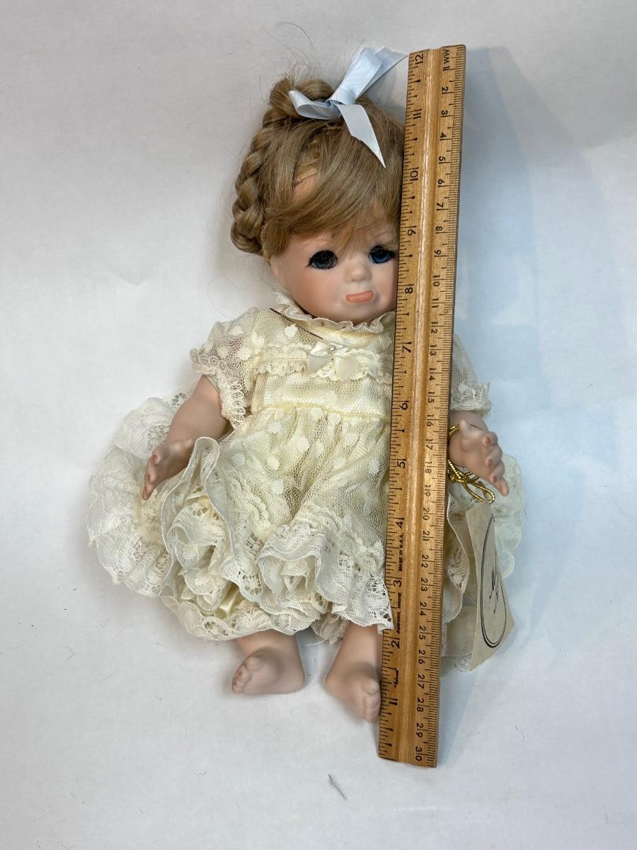 Pouting Porcelain Baby Doll by Manyse Nicole Pouty Girl #405/500. Numbered and dated on back of neck. Has original maker hang tag attached. In good previously displayed condition.