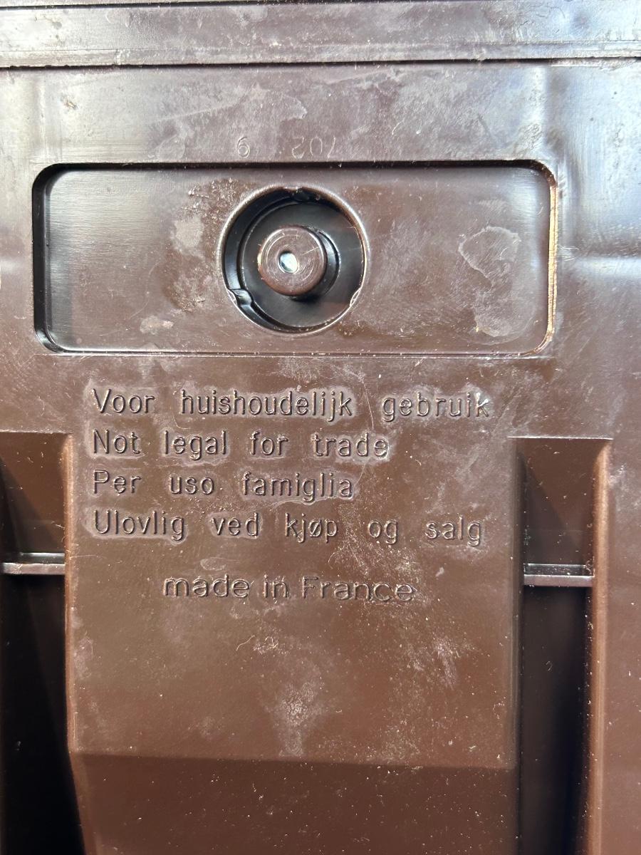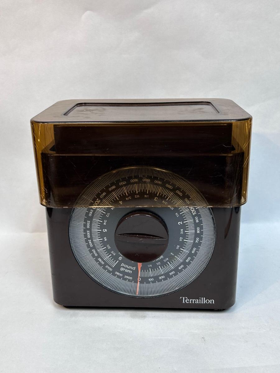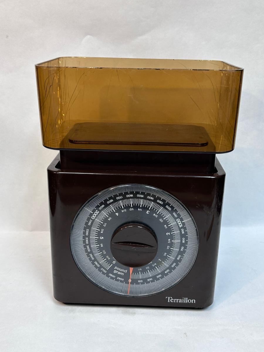 Retro Amber Brown Plastic Food Scale Made in France Terraillon 6lb Limit. In fair condition. The food bowl that sits on top has some cracking to the plastic, probably from age and being put in dishwasher. Works and is useable.