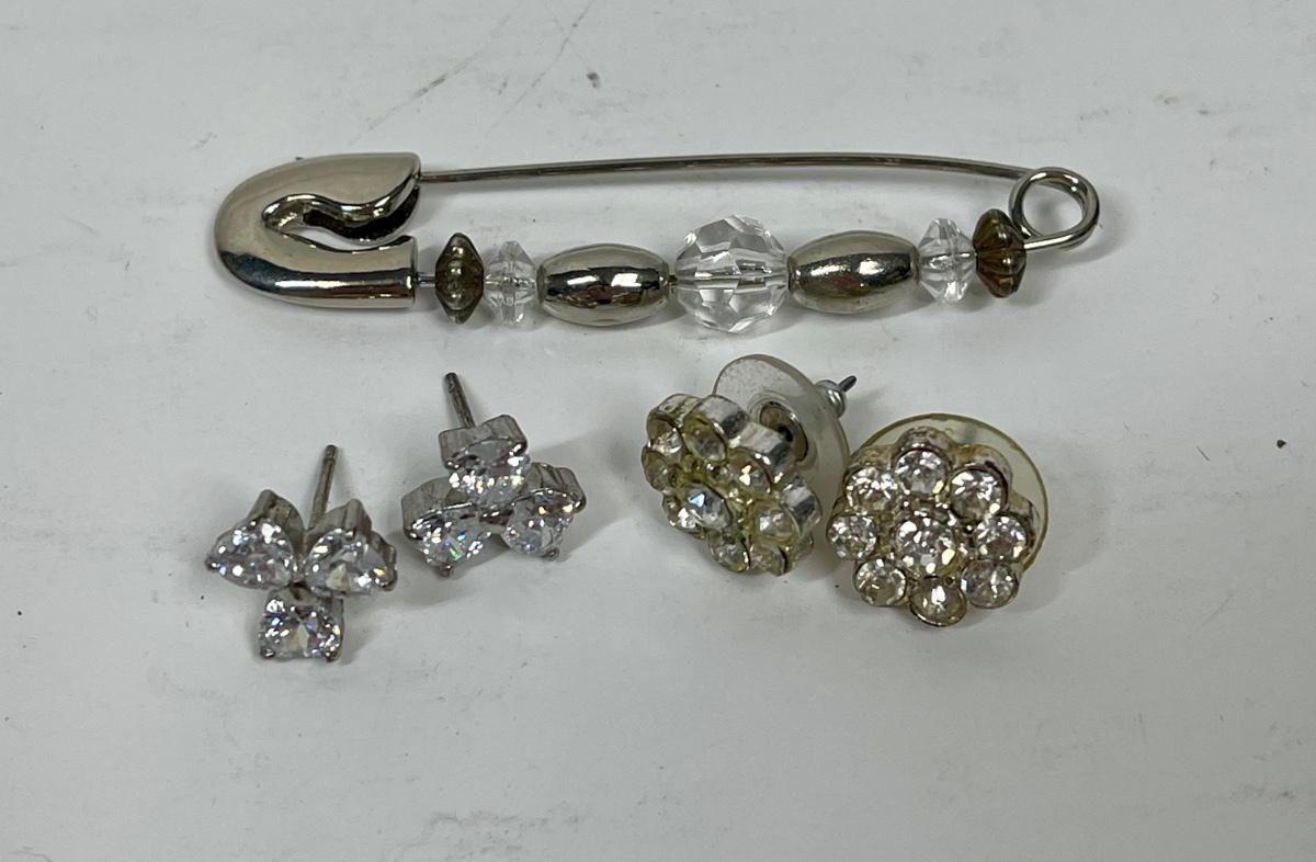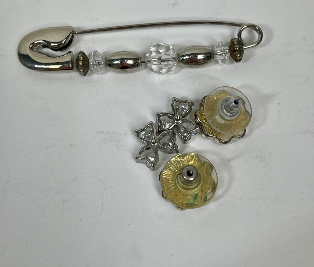 Earrings are for pierced ears, silver tone and rhinestones. Brooch has different types of beads strung along the pin. All in good condition.