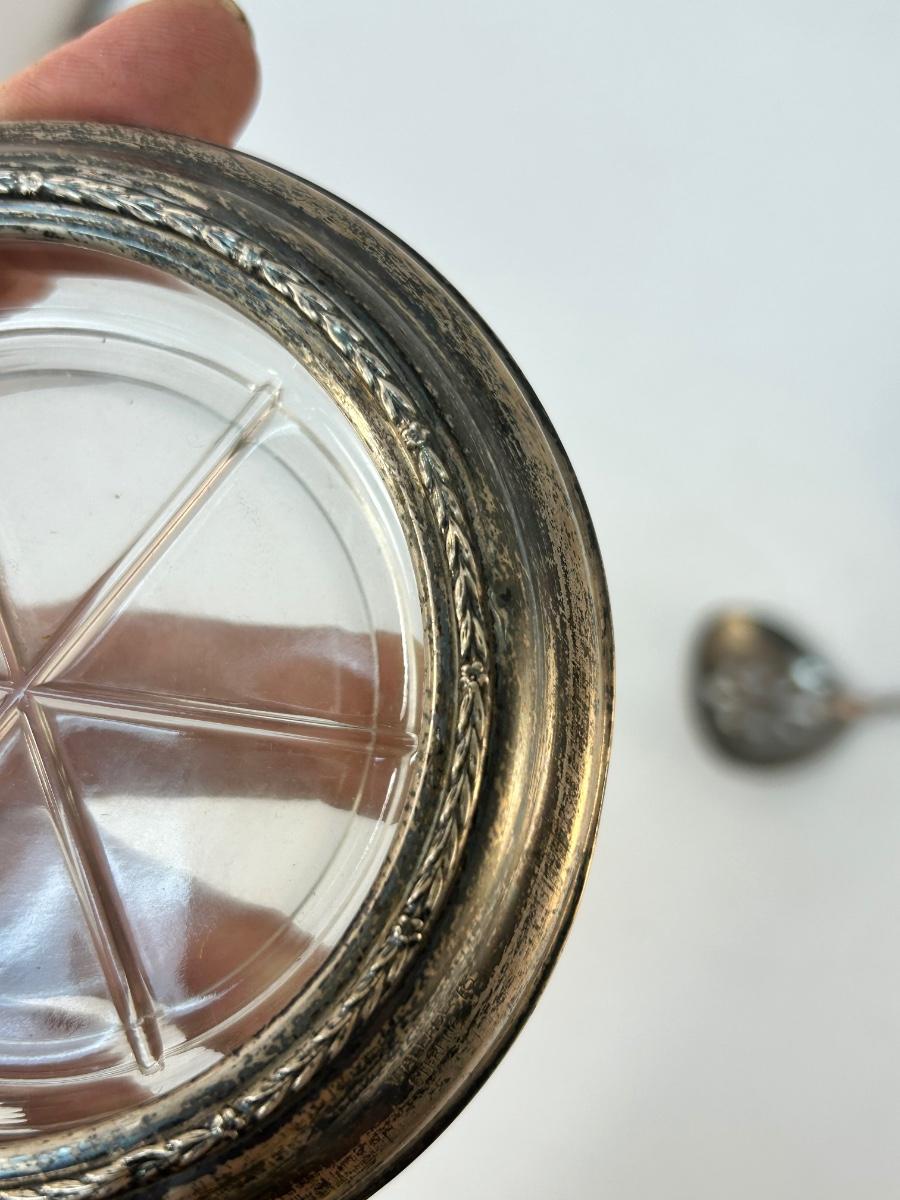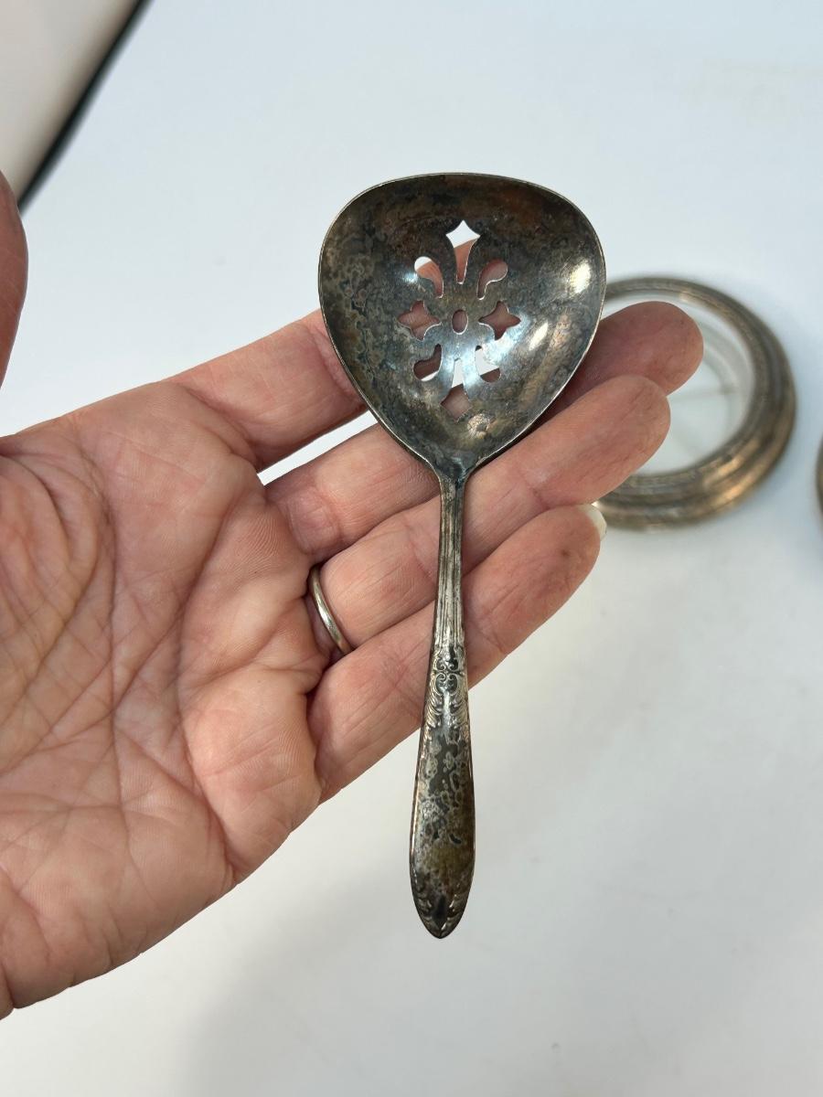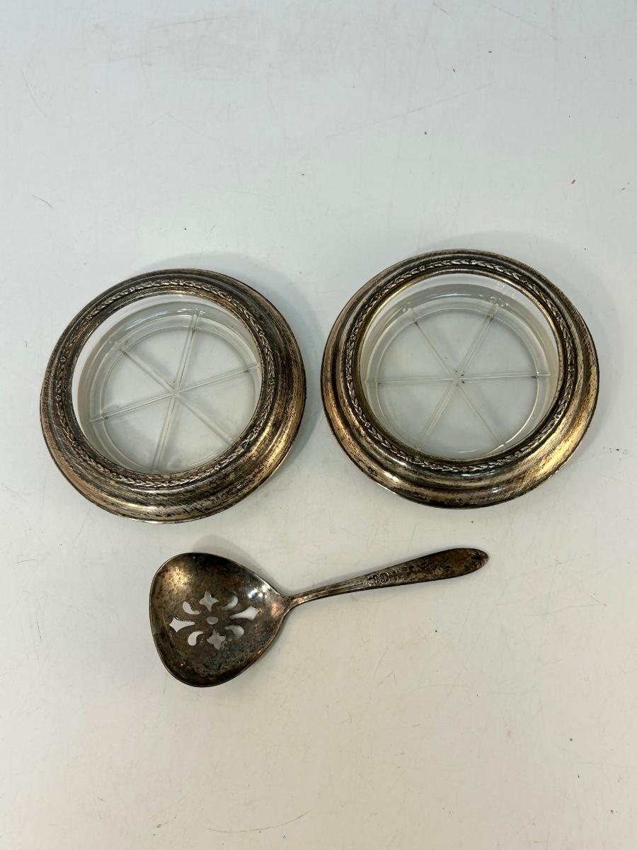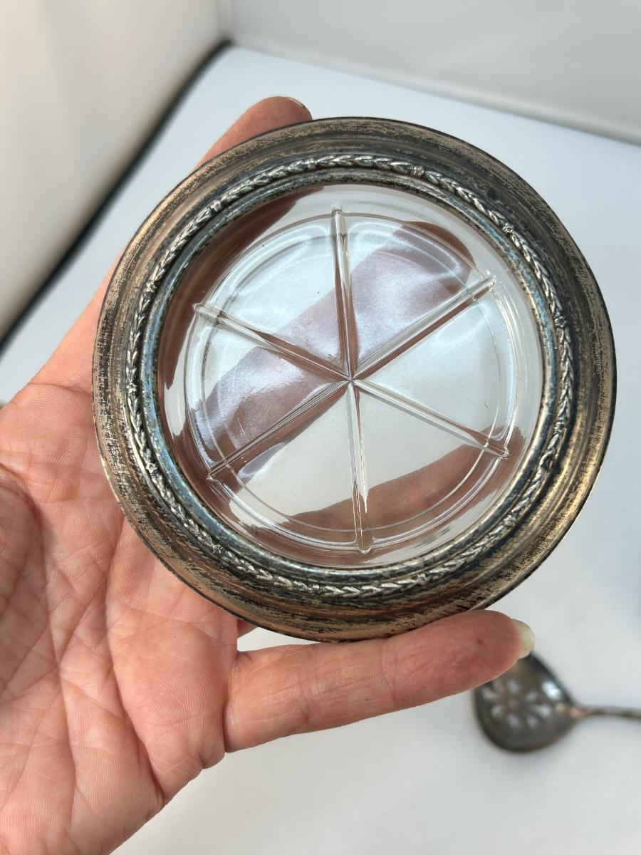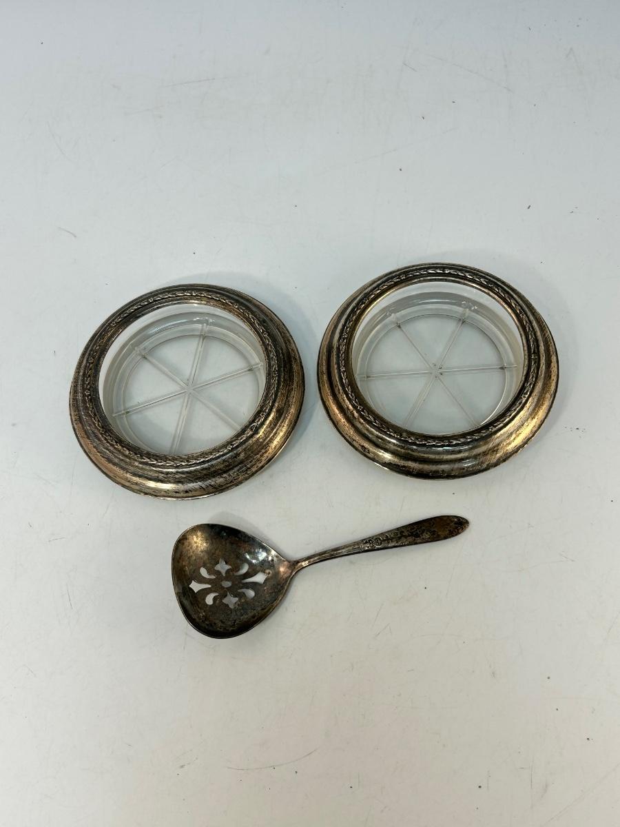 Vintage Silverplate Crystal Glass Coasters and Slotted Small Spoon