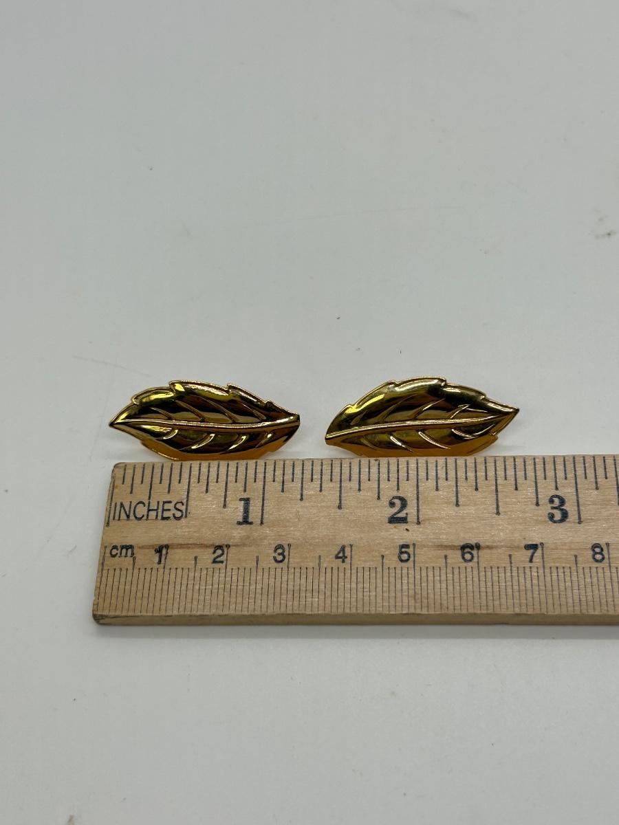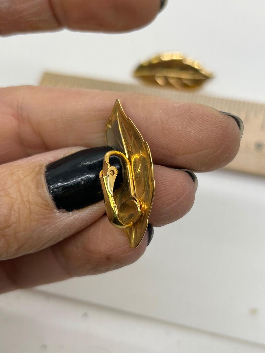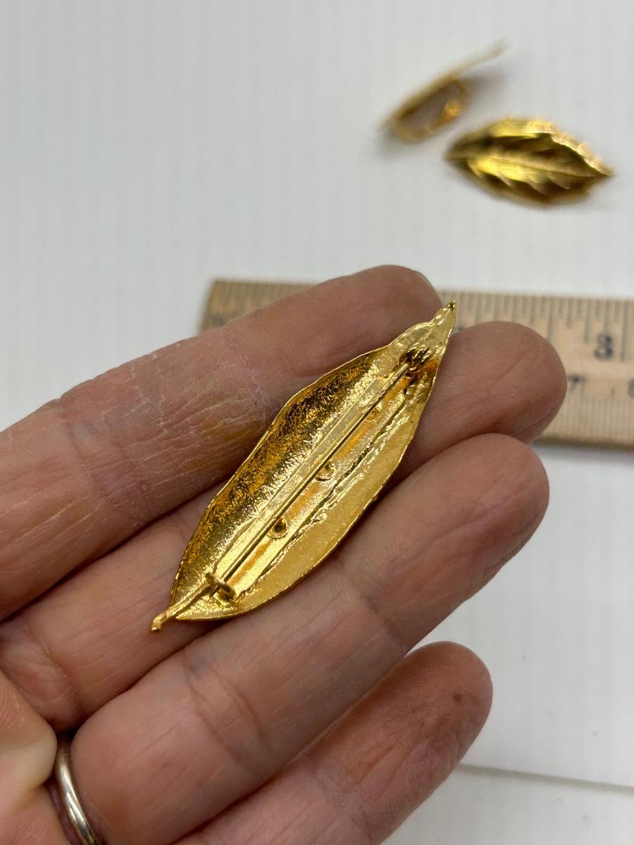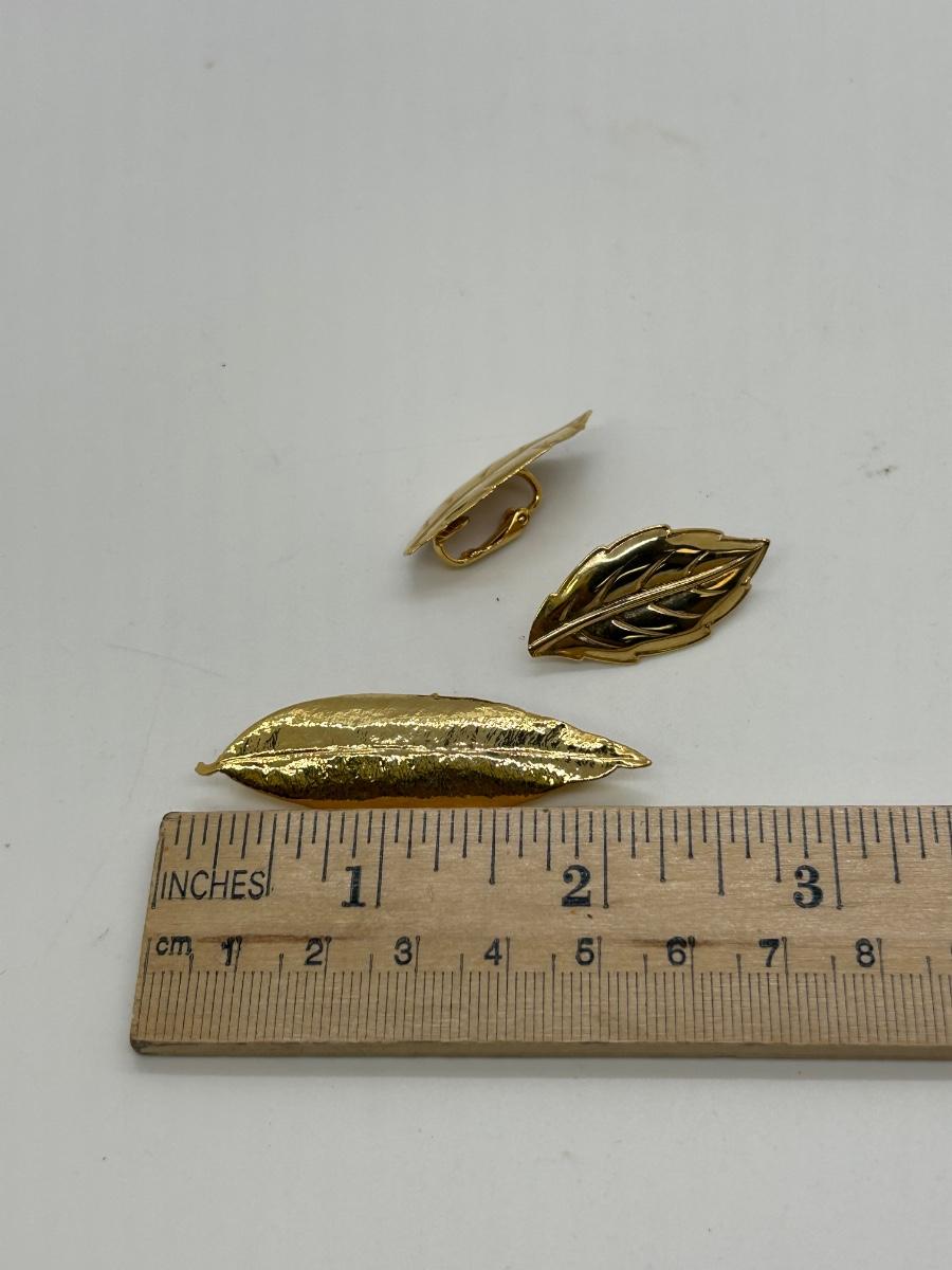 Vintage Retro Gold Tone Leaf Shaped Pin Brooch and Clip Style Earrings. In good condition. Unbranded. The earrings seem to be stamped metal, while the pin may be a dipped/plated leaf.