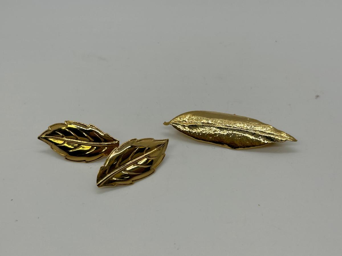 Vintage Retro Gold Tone Leaf Shaped Pin Brooch and Clip Style Earrings