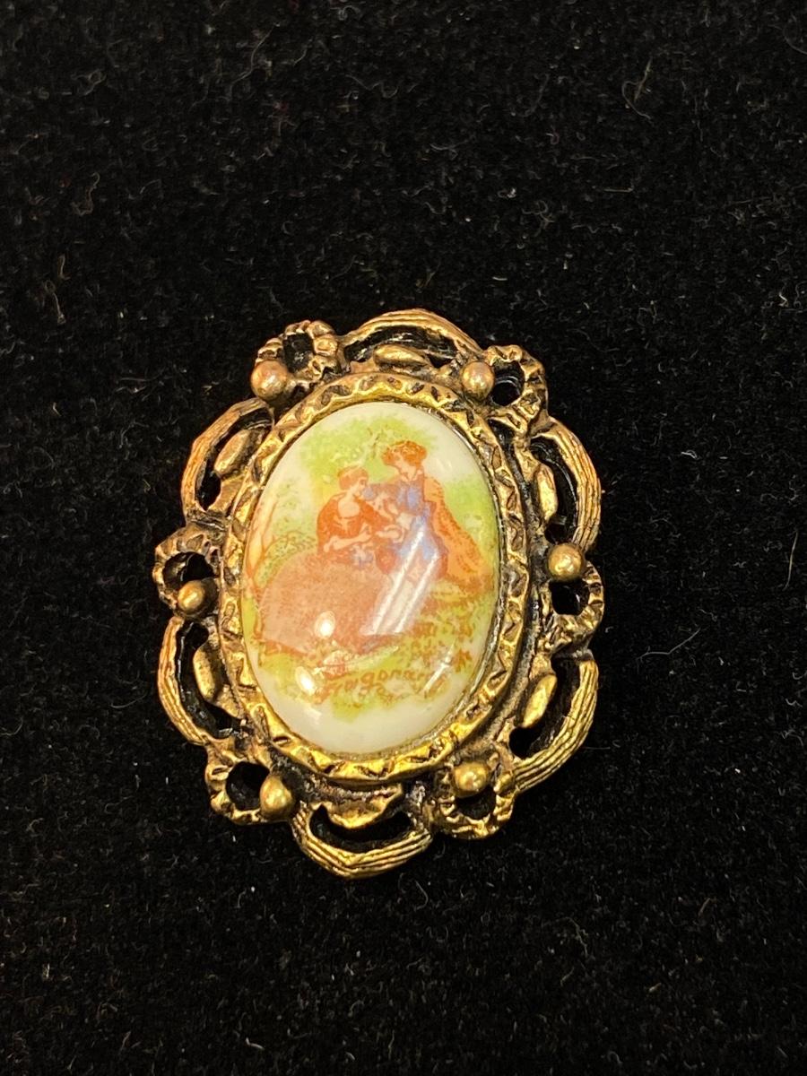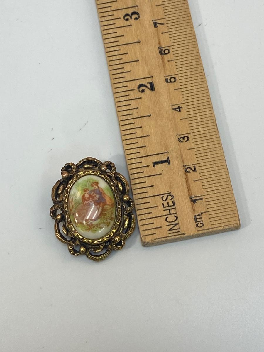 Vintage Painted Ceramic Victorian Couple Scene Brooch Pin