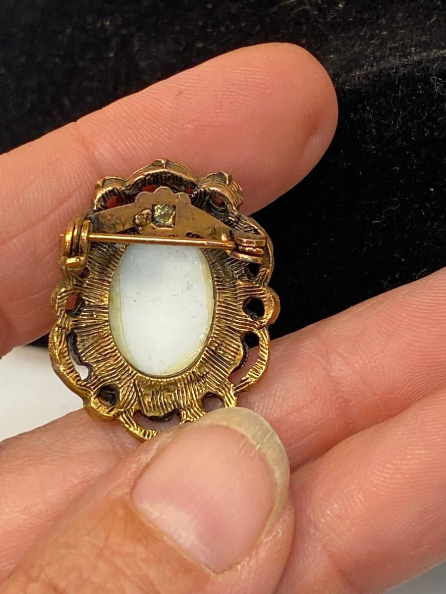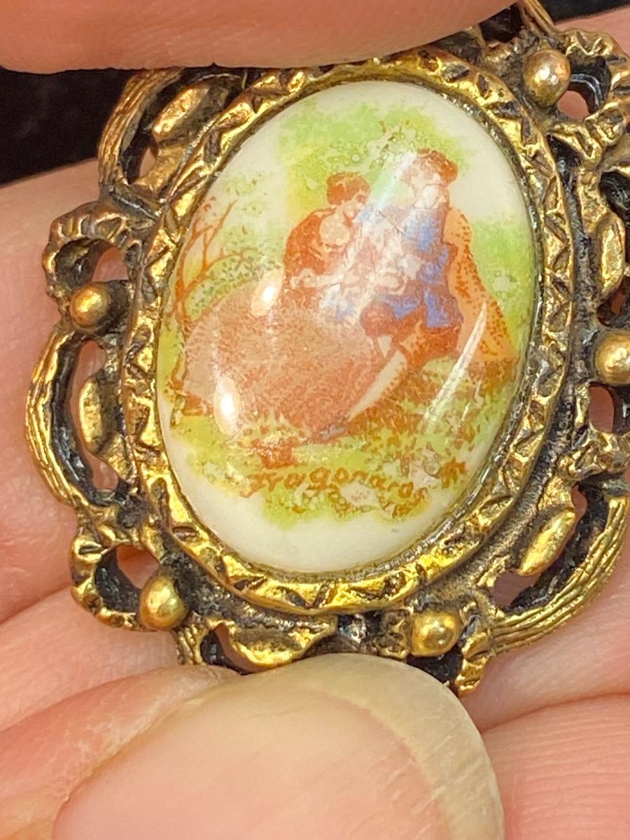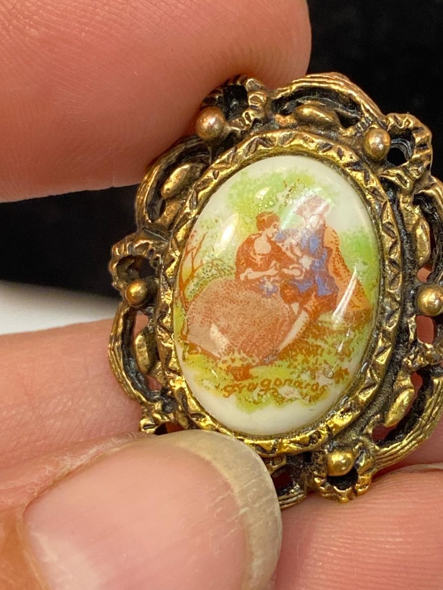 Vintage Painted Ceramic Victorian Couple Scene Brooch Pin. Looks like it is artist signed down near the bottom of scene. No marks on the back. About 1" size.