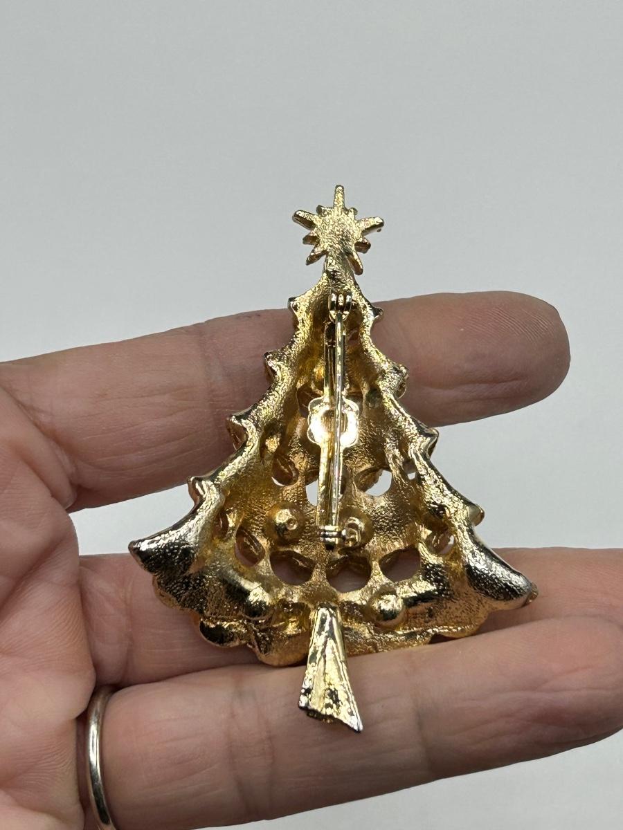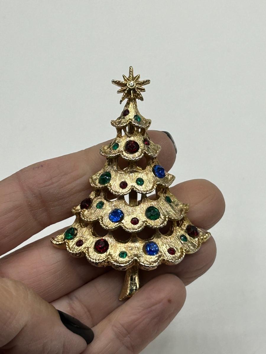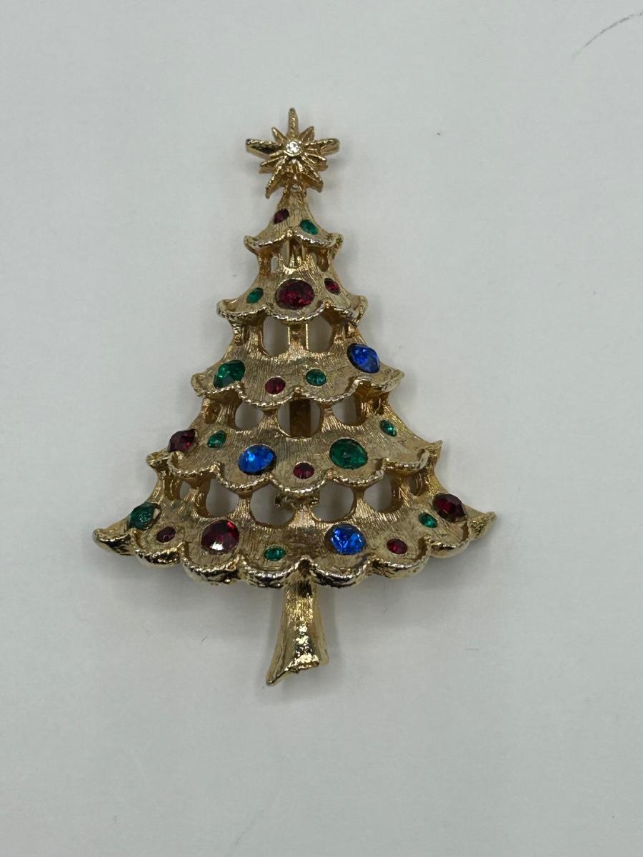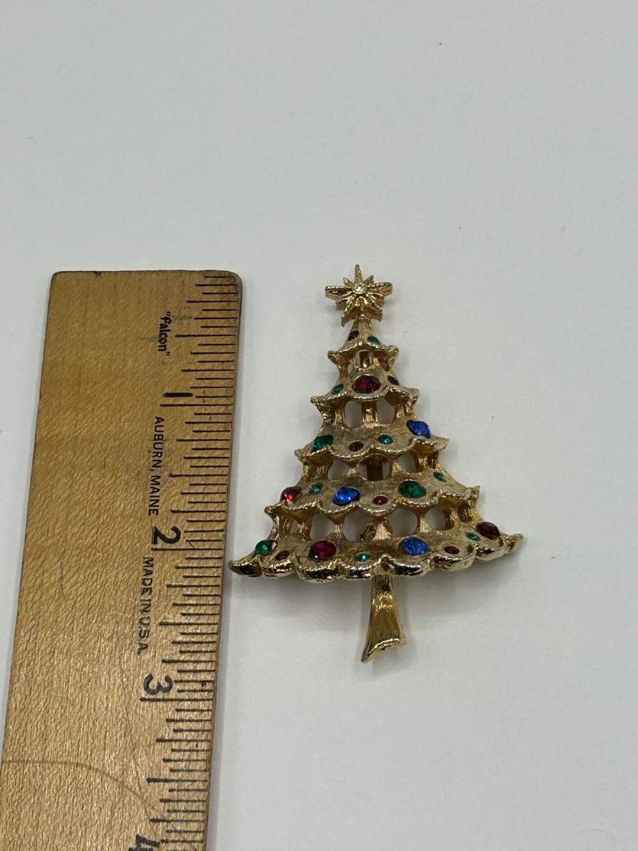Vintage Gold Tone Jeweled Rhinestone Christmas Holiday Tree Pin Brooch. In good condition, no missing stones. Unbranded. About 3" size.