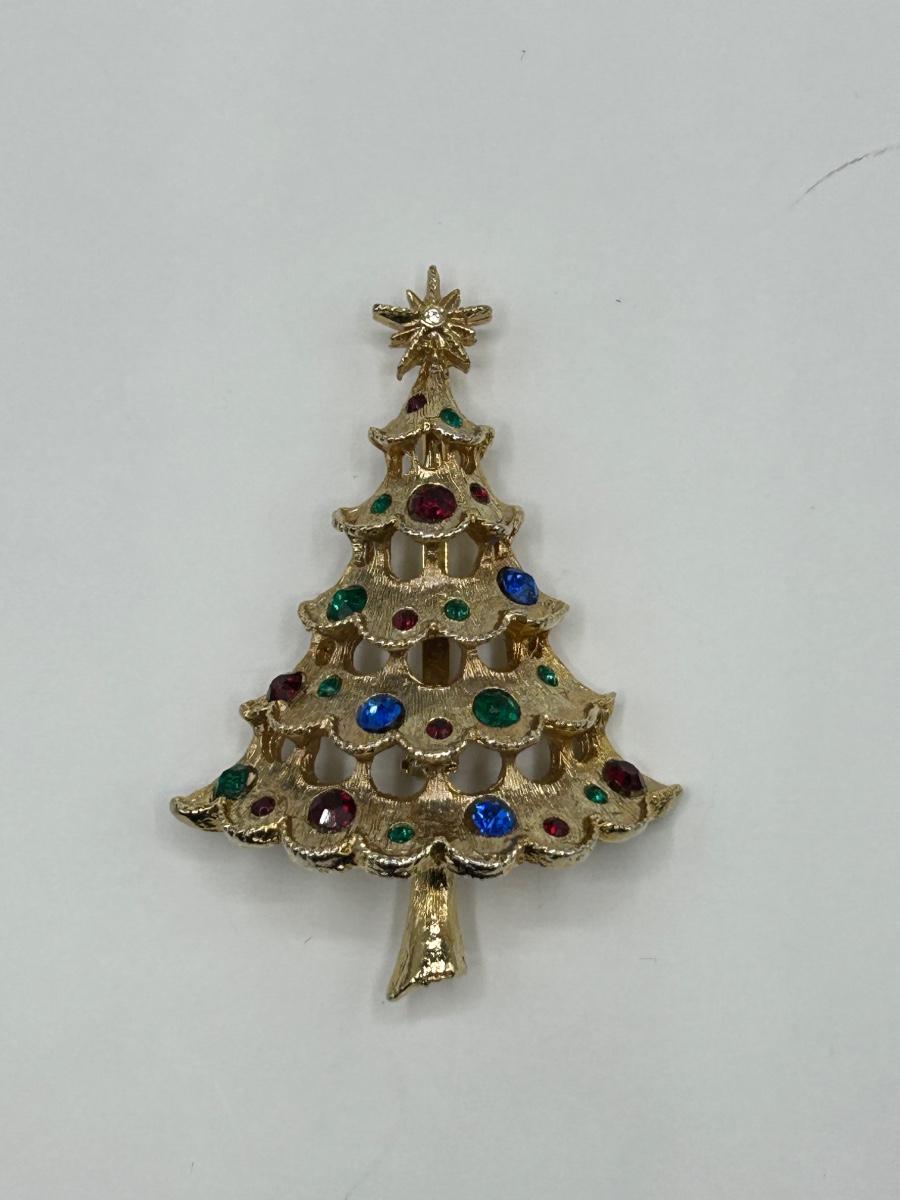 Vintage Gold Tone Jeweled Rhinestone Christmas Holiday Tree Pin Brooch