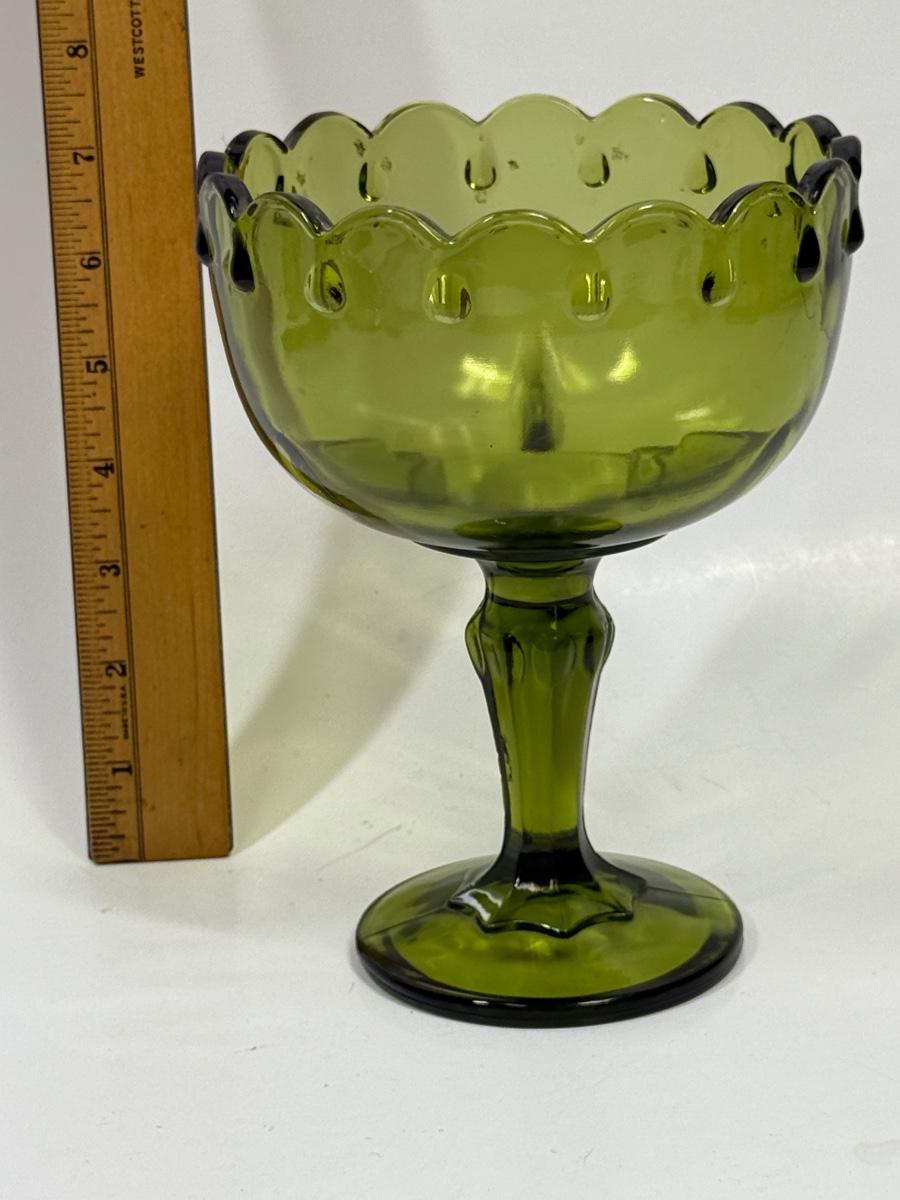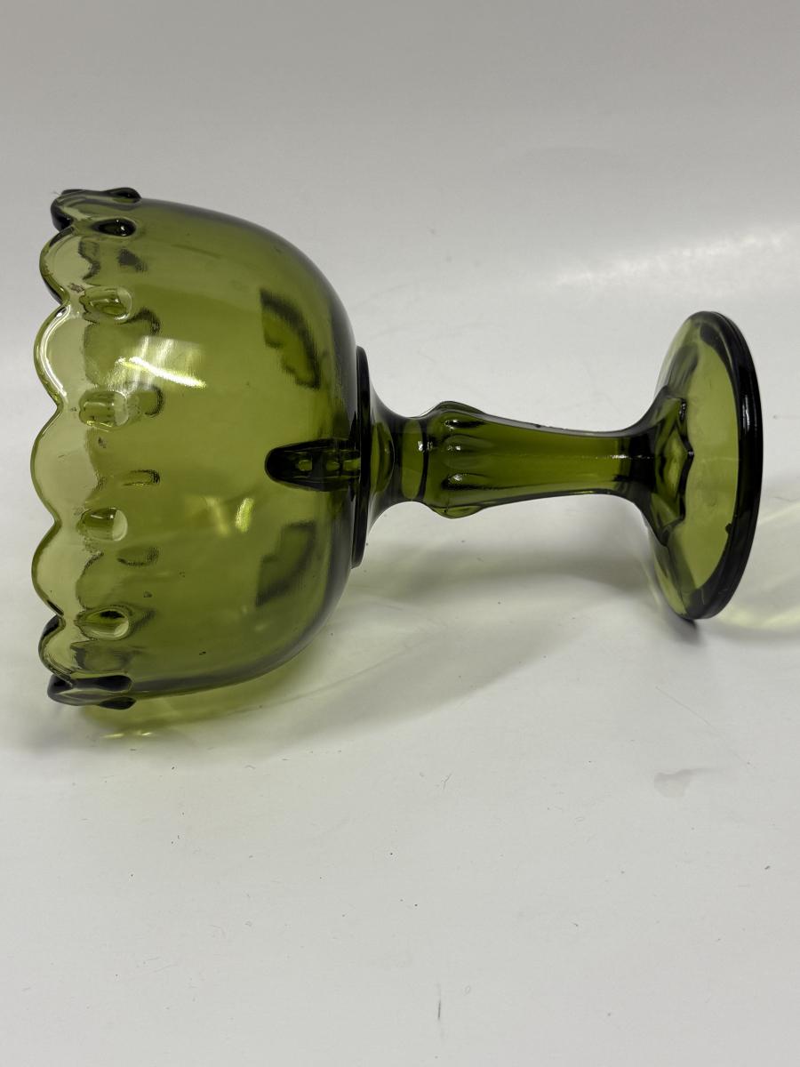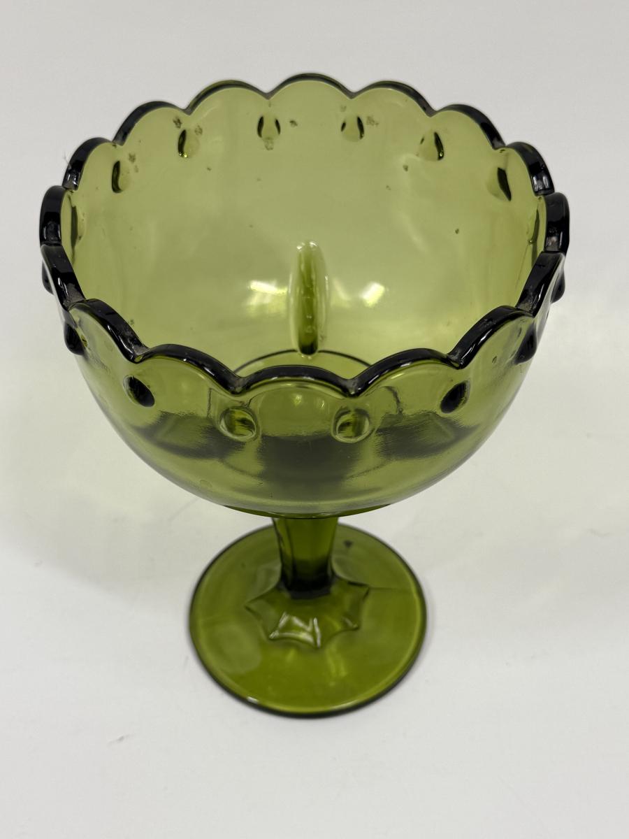 Indian Glass Vintage avocado green Glass Pedestal Compote Dish scalloped teardrop