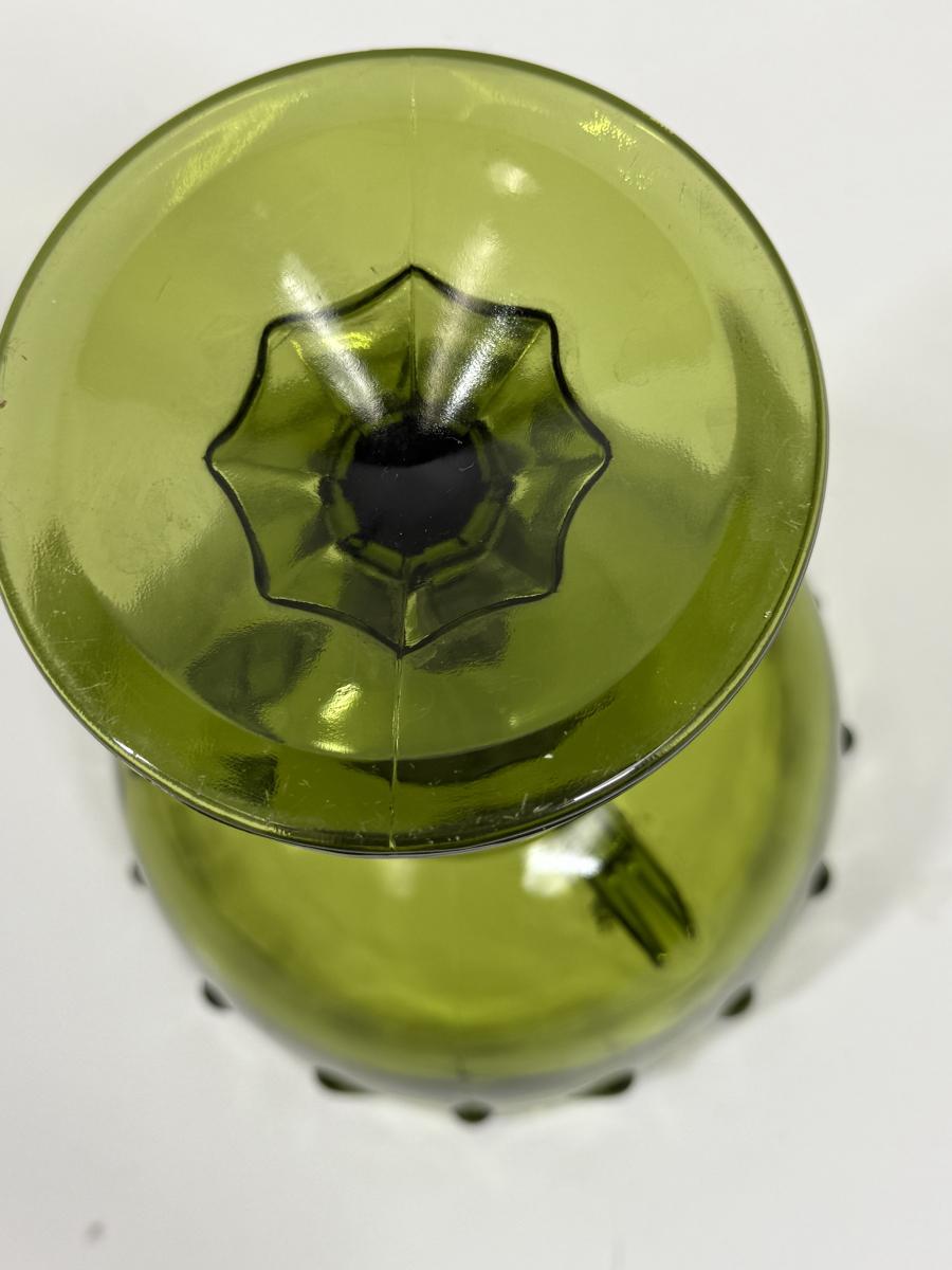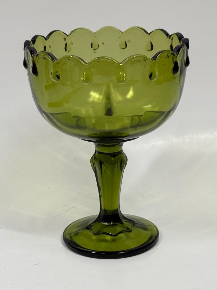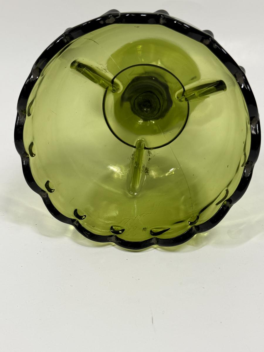 Indian Glass Vintage avocado green Glass Pedestal Compote Dish scalloped teardrop