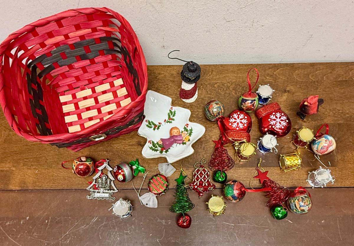 Christmas Decor Lott - Small 1-2’ Dia. Tree Ornaments, Tree Shaped trinket Dish and Santa Basket