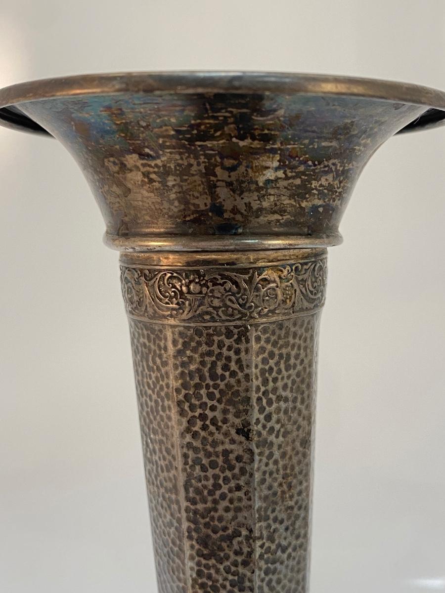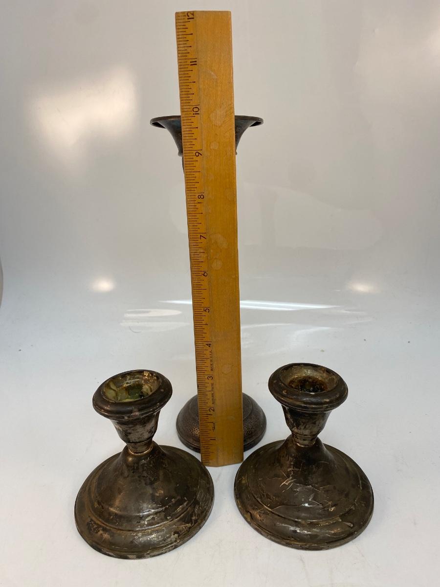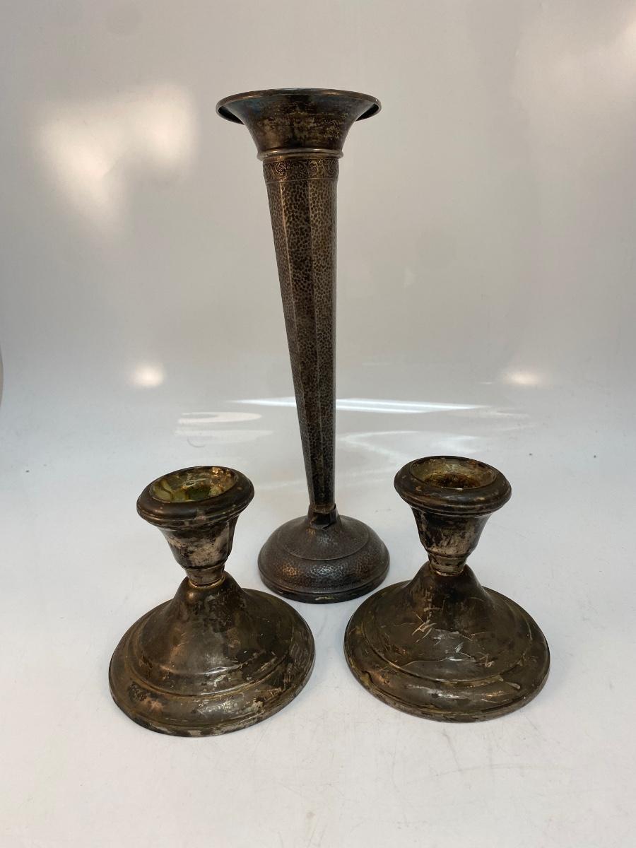 Weighted Sterling Silver Fluted Vase & Candlestick Holders. In need of a cleaning. The vase does have some minor dings, nothing too noticeable.