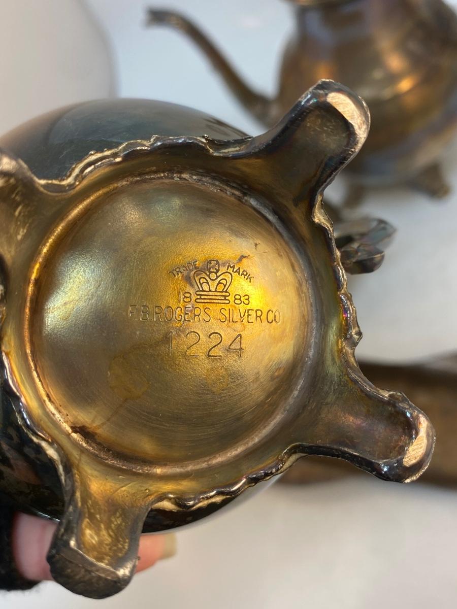 Vintage Silver Plate Teapot Lidded Sugar Creamer Spoon Rest Dish. In good condition, need to be polished. No name on the dish, the other pieces are from FB Rogers.