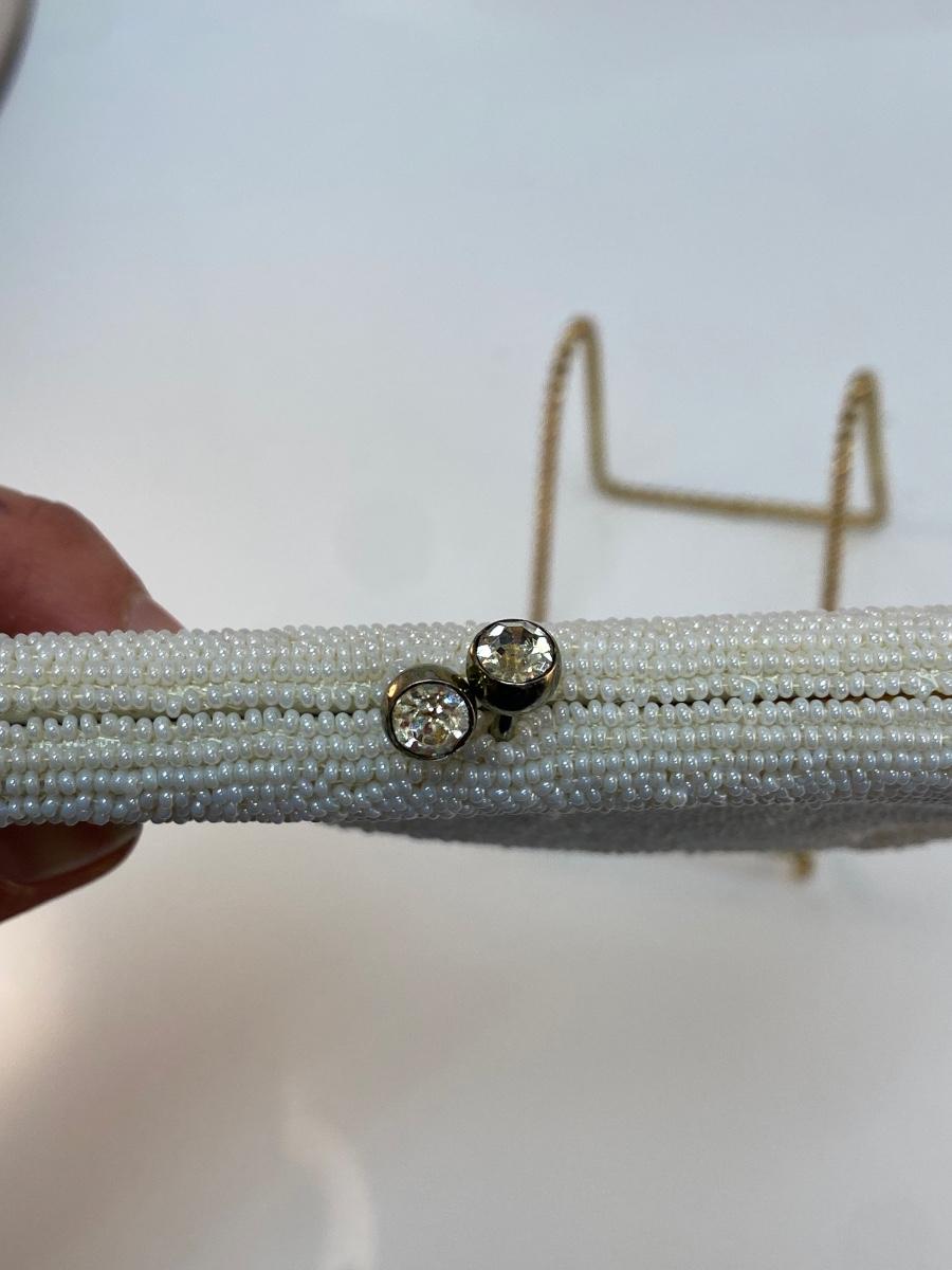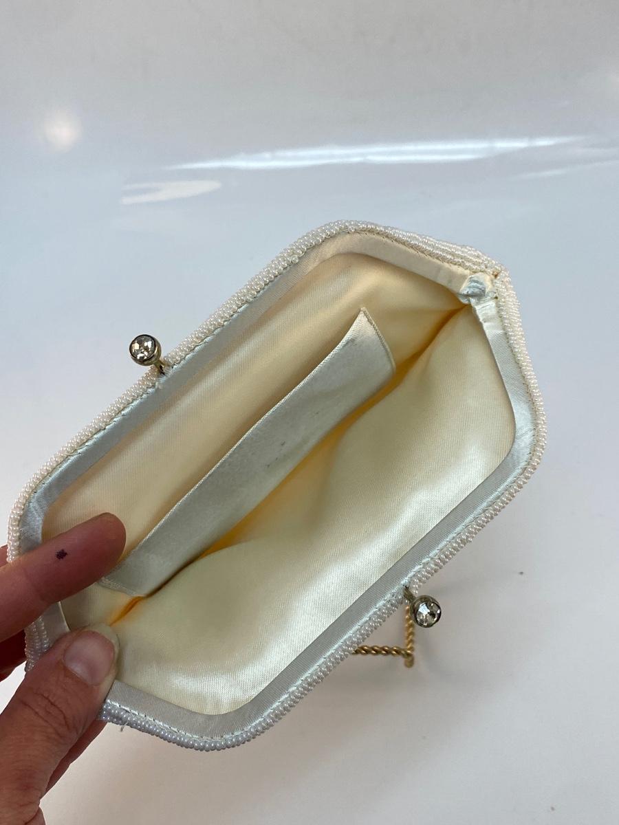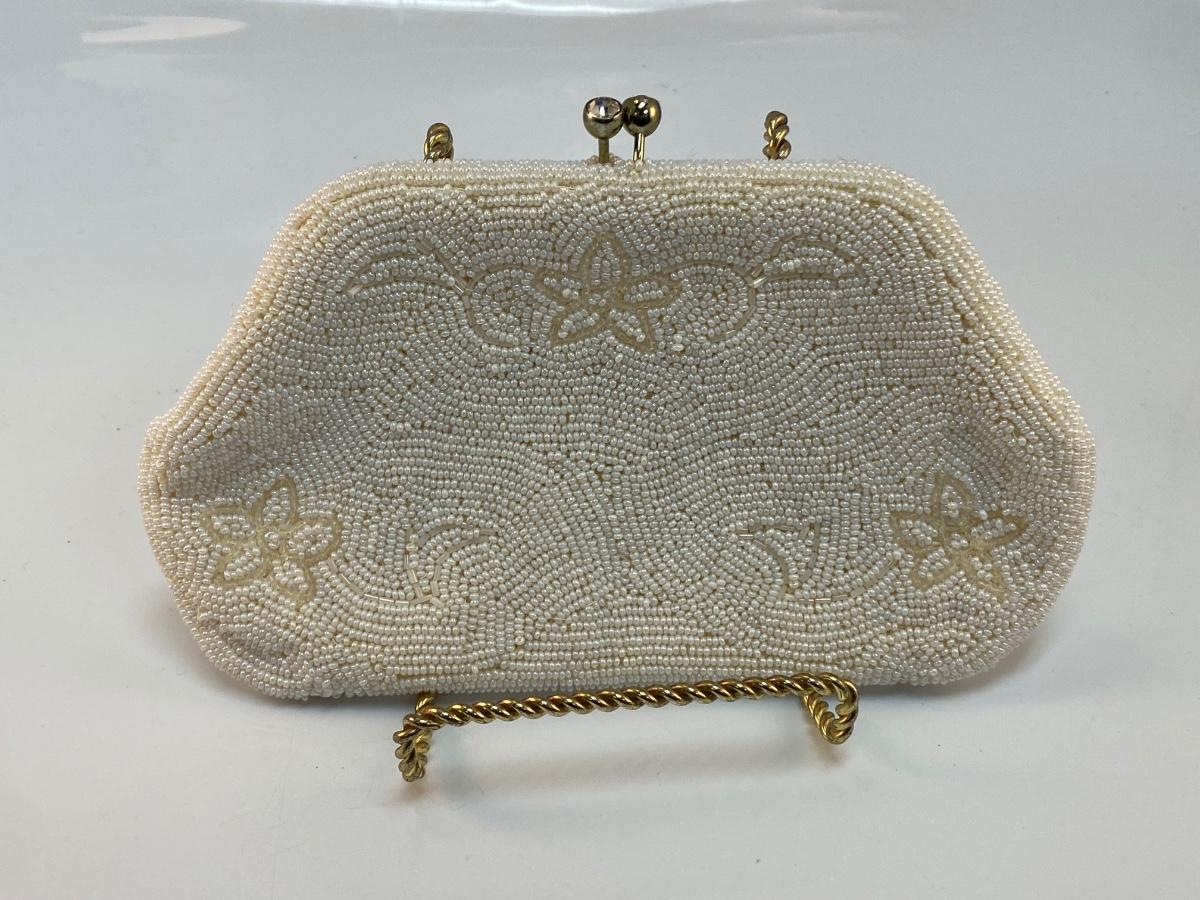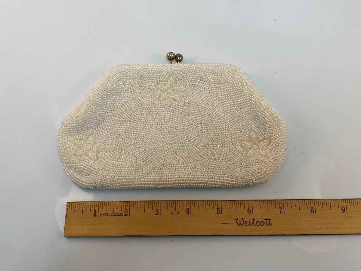 Vintage Off White Ivory Seed Bead Beaded Clutch Purse Evening Bag with Flower Design