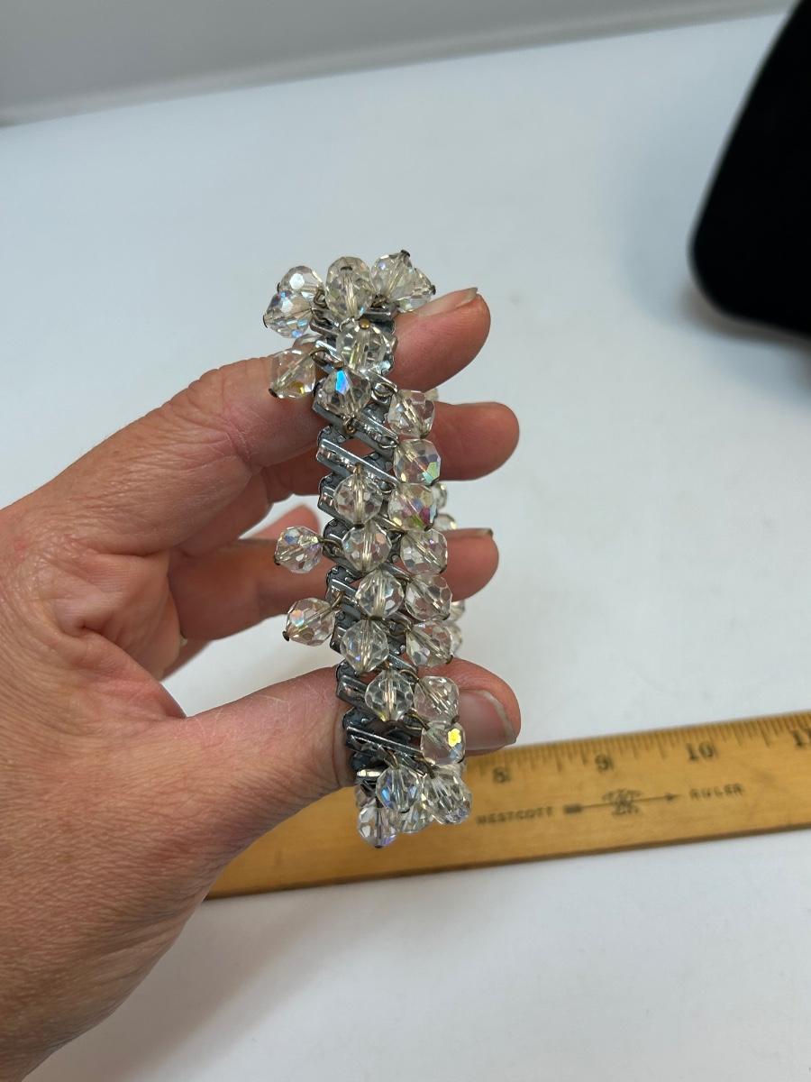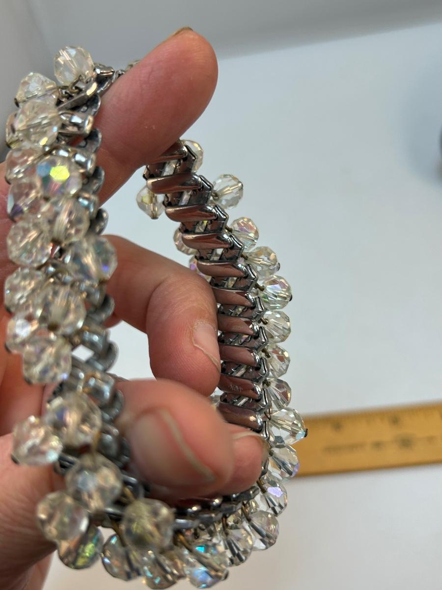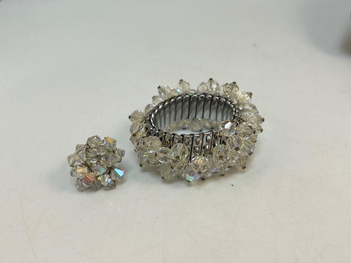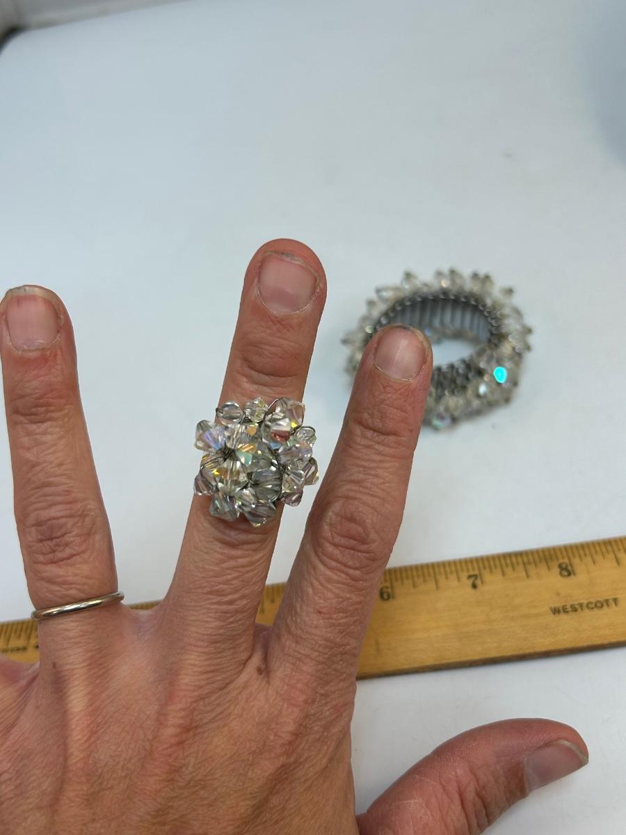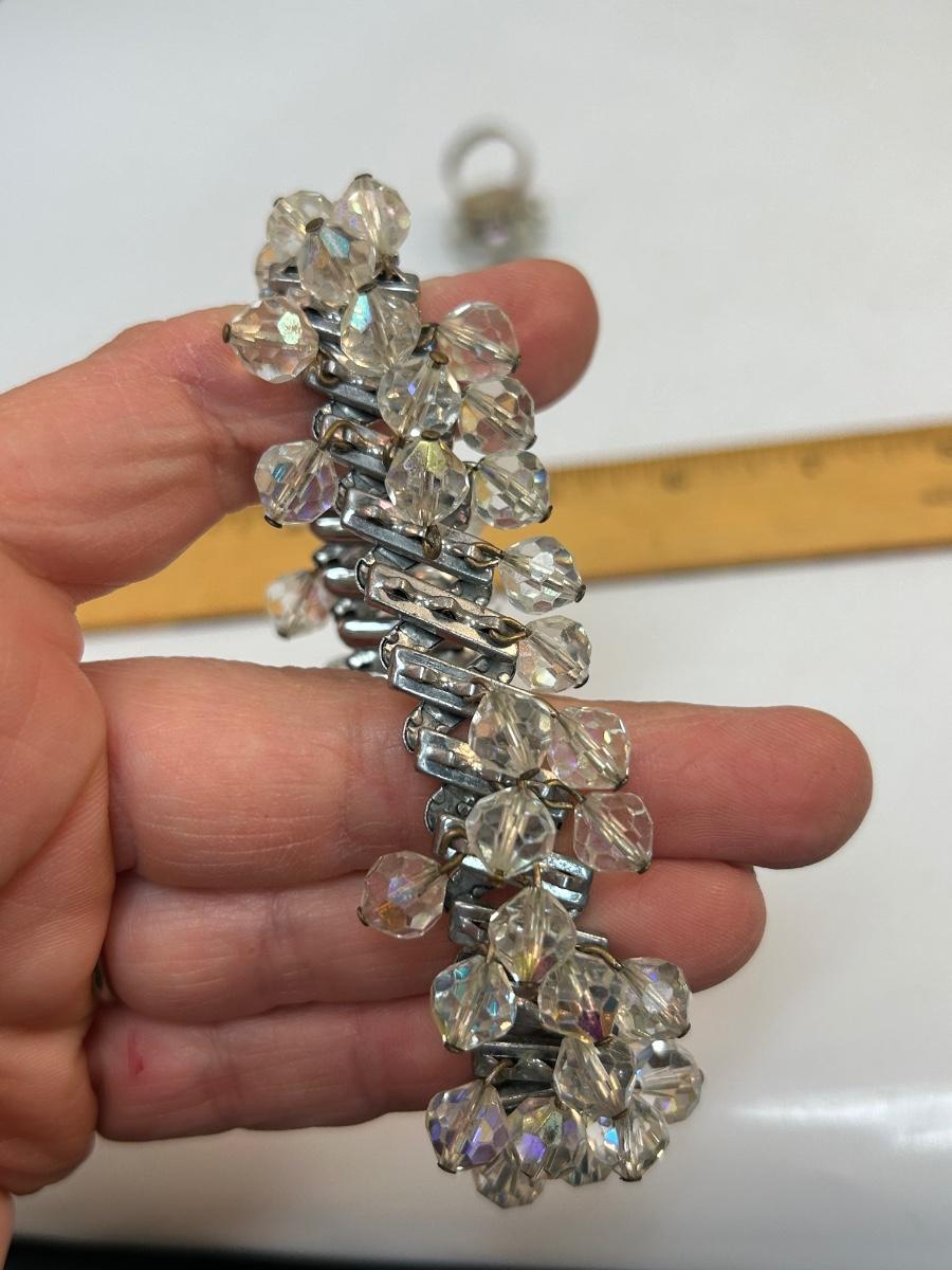 Vintage Clear AB Iridescent Beaded Stretch Bracelet and Cluster Ring. In good condition. There does seem to be some missing beads from bracelet, but it is not noticeable unless looking. Ring is adjustable size.