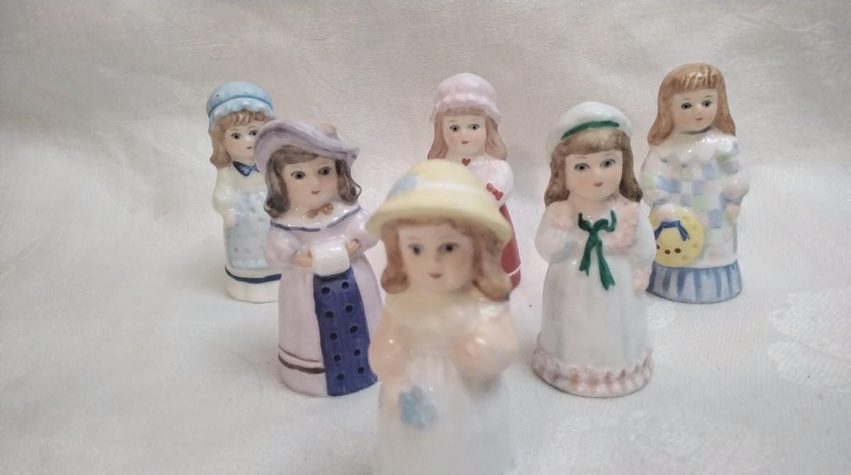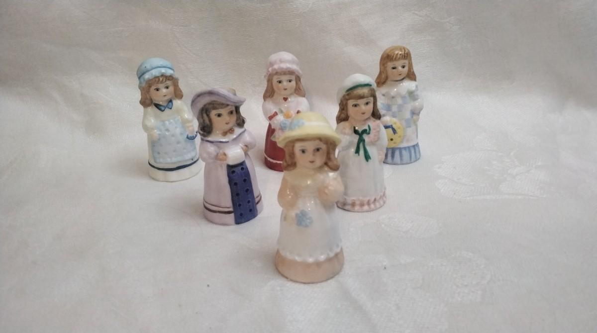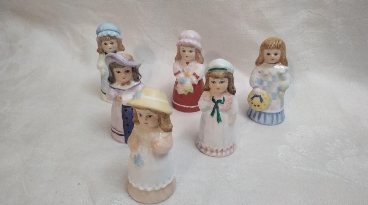 6 Gorham Bone China Girl Doll Thimbles. No chips, cracks nor repairs