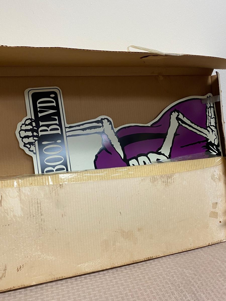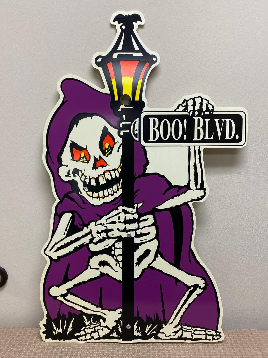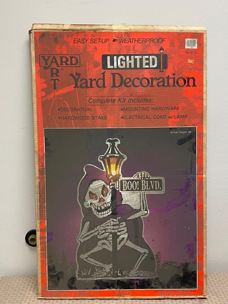 Large plastic Halloween yard sign. Scary skeleton wearing a cape. In good condition. Originally came with a light to light up the street lamp, but no longer has that part. Great without it. Has original box. Ground stake screws to sign, undo screws to turn stake downward for use.