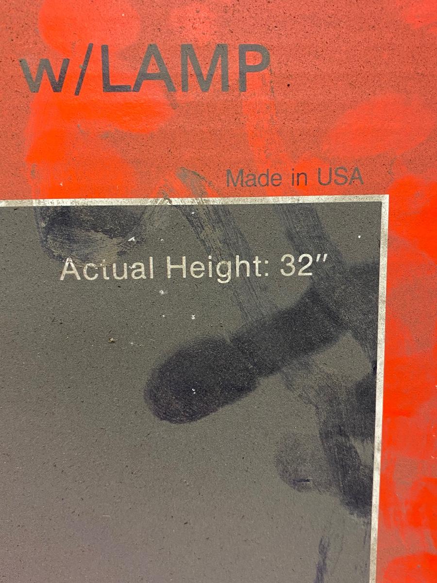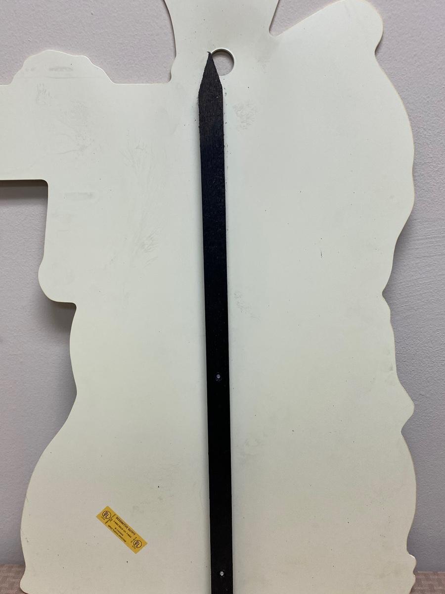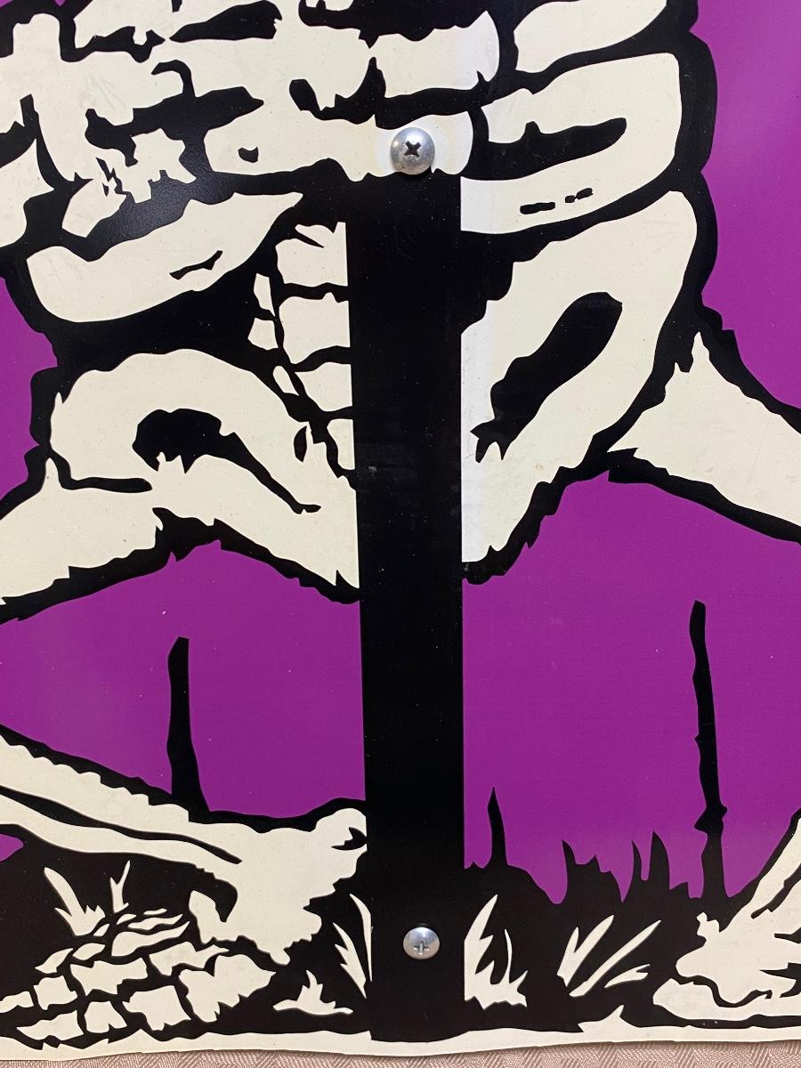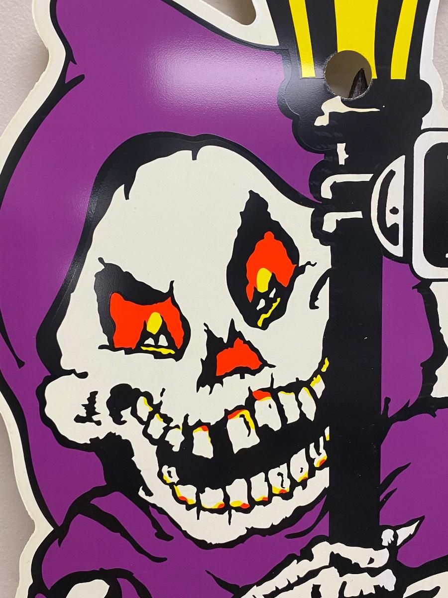 Large plastic Halloween yard sign. Scary skeleton wearing a cape. In good condition. Originally came with a light to light up the street lamp, but no longer has that part. Great without it. Has original box. Ground stake screws to sign, undo screws to turn stake downward for use.