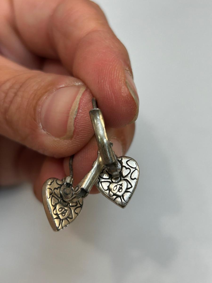 Pair of Small Silver Tone Heart Earrings with Flower Centers from Brighton. In previously worn condition.
