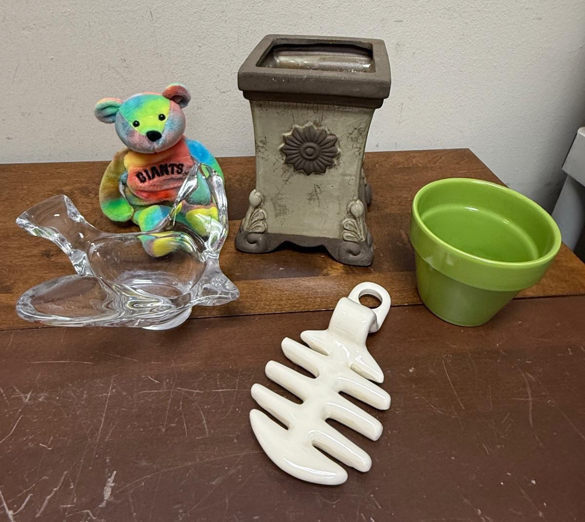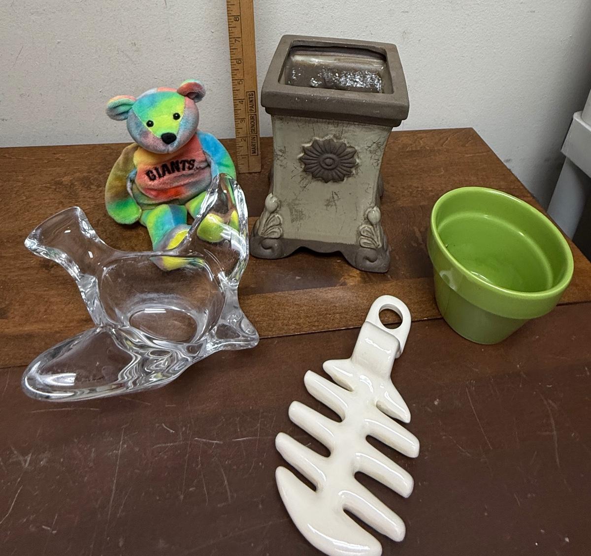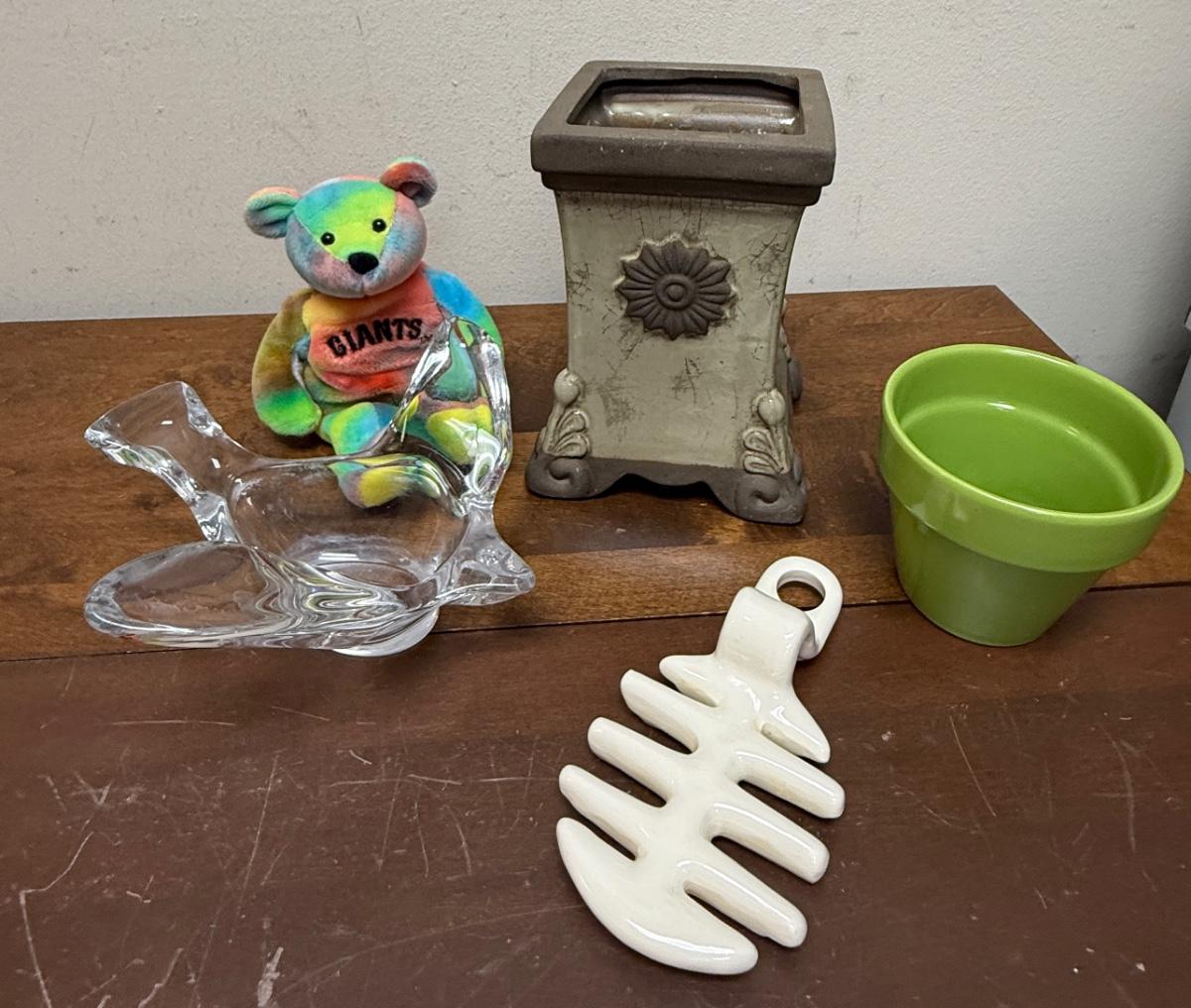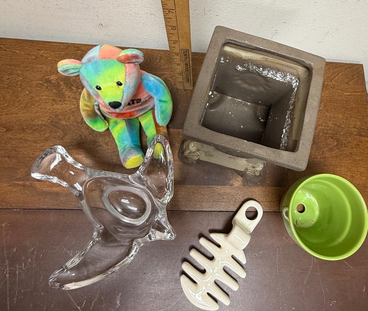 Rainbow bear plush, glass dove spoon rest, square planter, small green pot, and a replacement insert for a bacon maker by Louisville Stoneware.